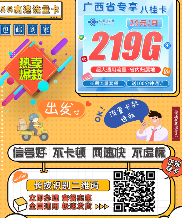 在广西还找不到一张靠谱又实惠的流量卡?那你真该看看这张联通八桂卡。月租29元,就能长期用到219G全国流量+100分钟通话,本地号段、上门激活、正规实名,用着省
