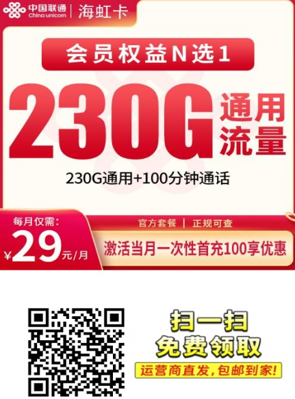海南的朋友有福了!最近联通上线了一张海南地区专属卡,海虹卡,主打29元230G全国通用流量+100分钟通话+会员N选1权益。支持5G网络,自主激活,优惠期整整4