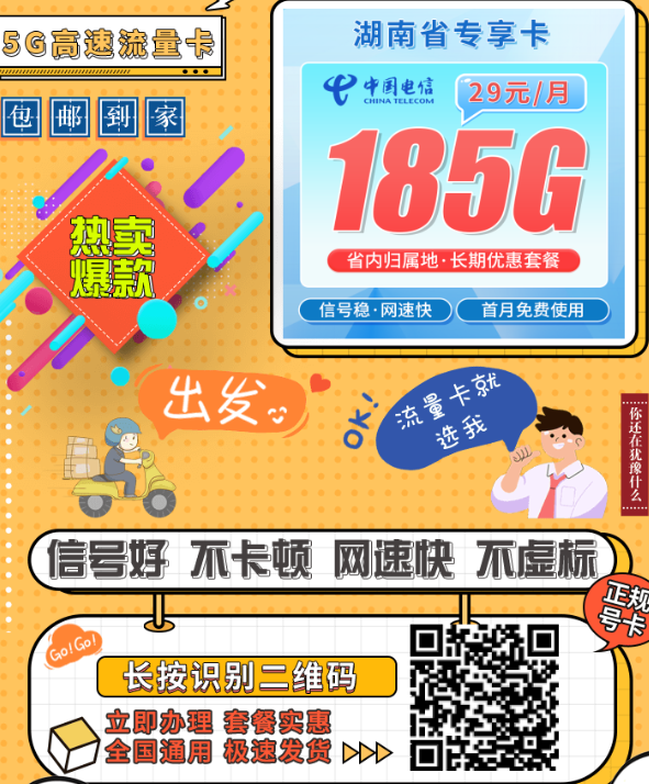 湖南本地有没有靠谱又稳定的大流量卡?有。这张电信湖南卡主打29元185G全国流量,套餐长期有效、不涨价、官方可查。信号稳、网速快,连刷视频都不卡。要换卡、要升级
