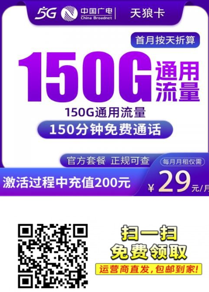 2026年广电又出新动作,这次带来一张上海专属的天狼卡,主打实惠与稳定。月租仅29元,套餐内含150G全国流量+150分钟语音,还支持5G网络。首充200元不仅
