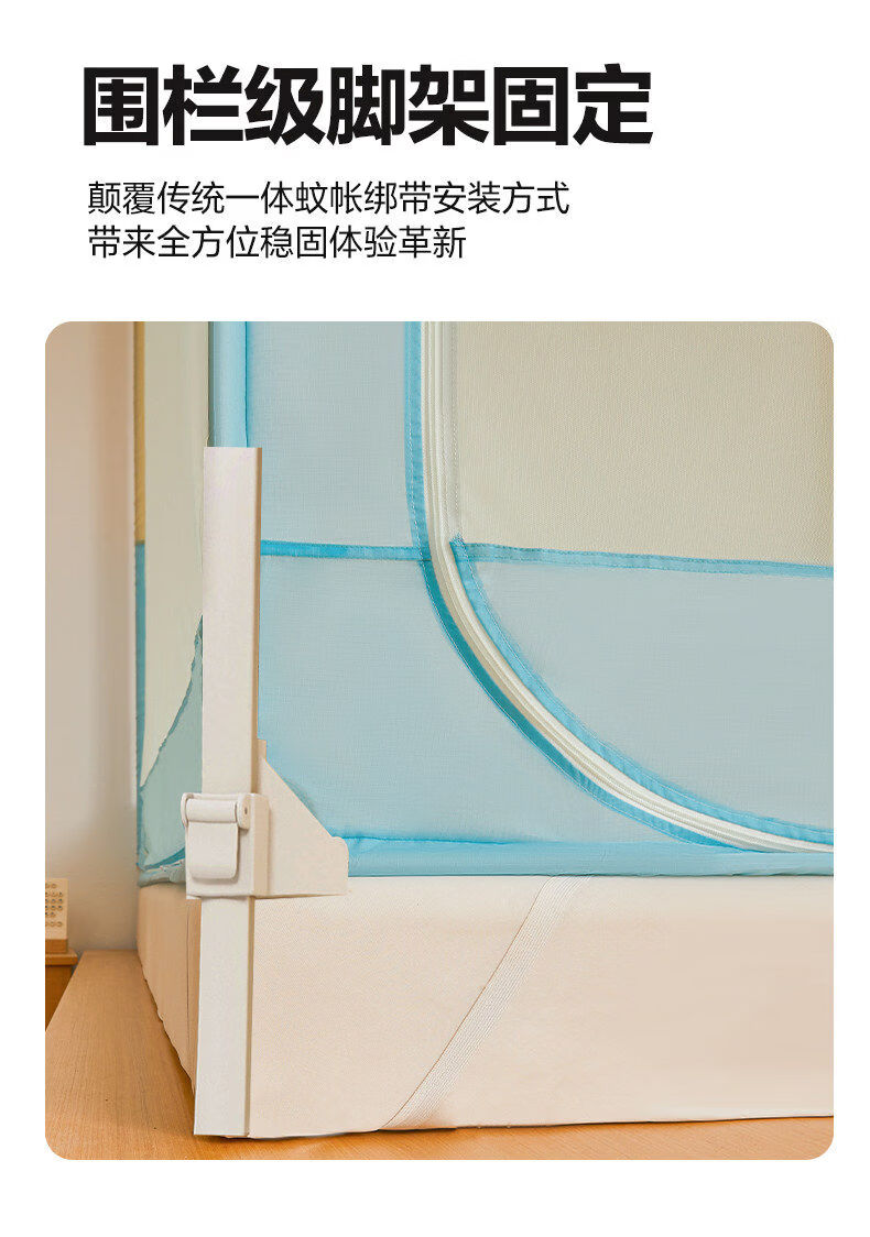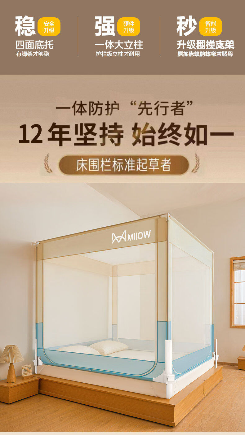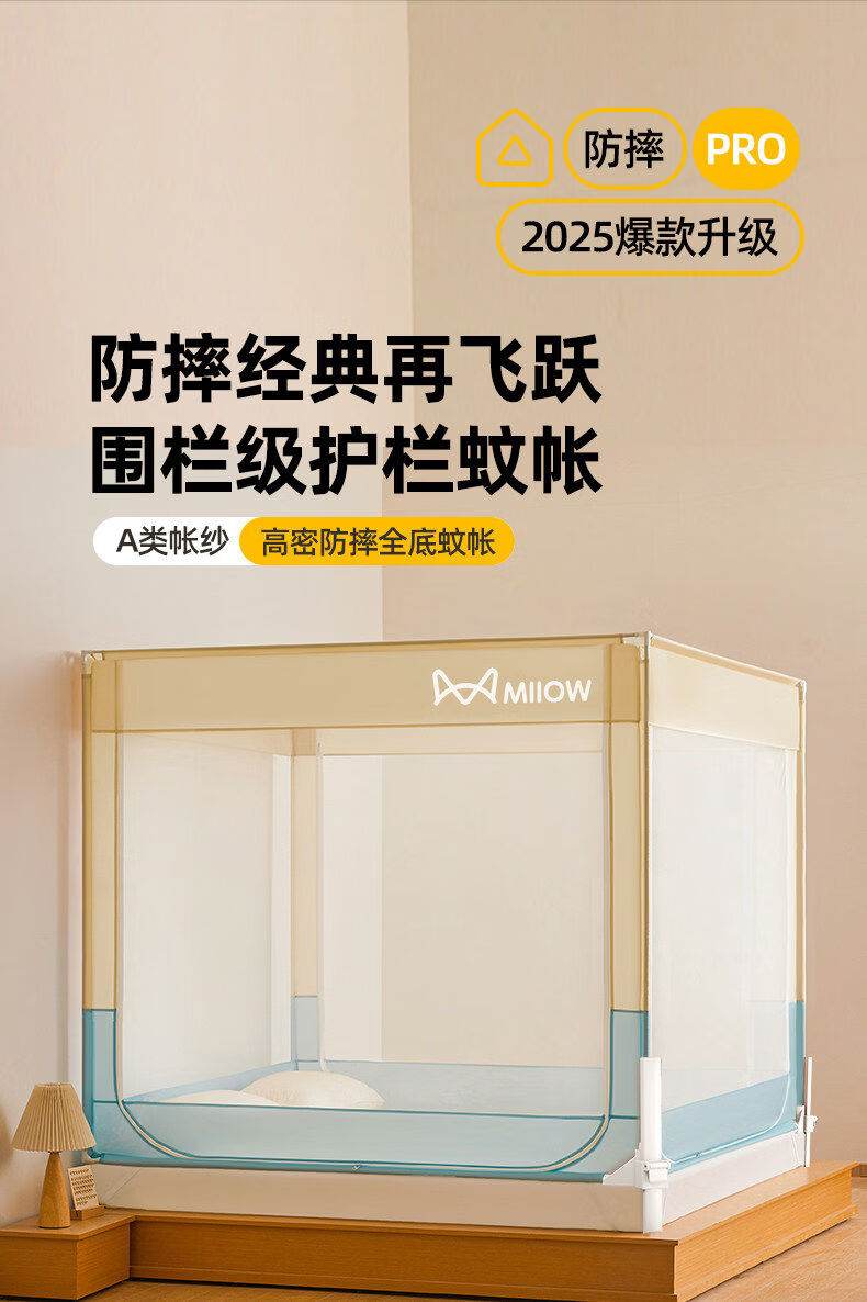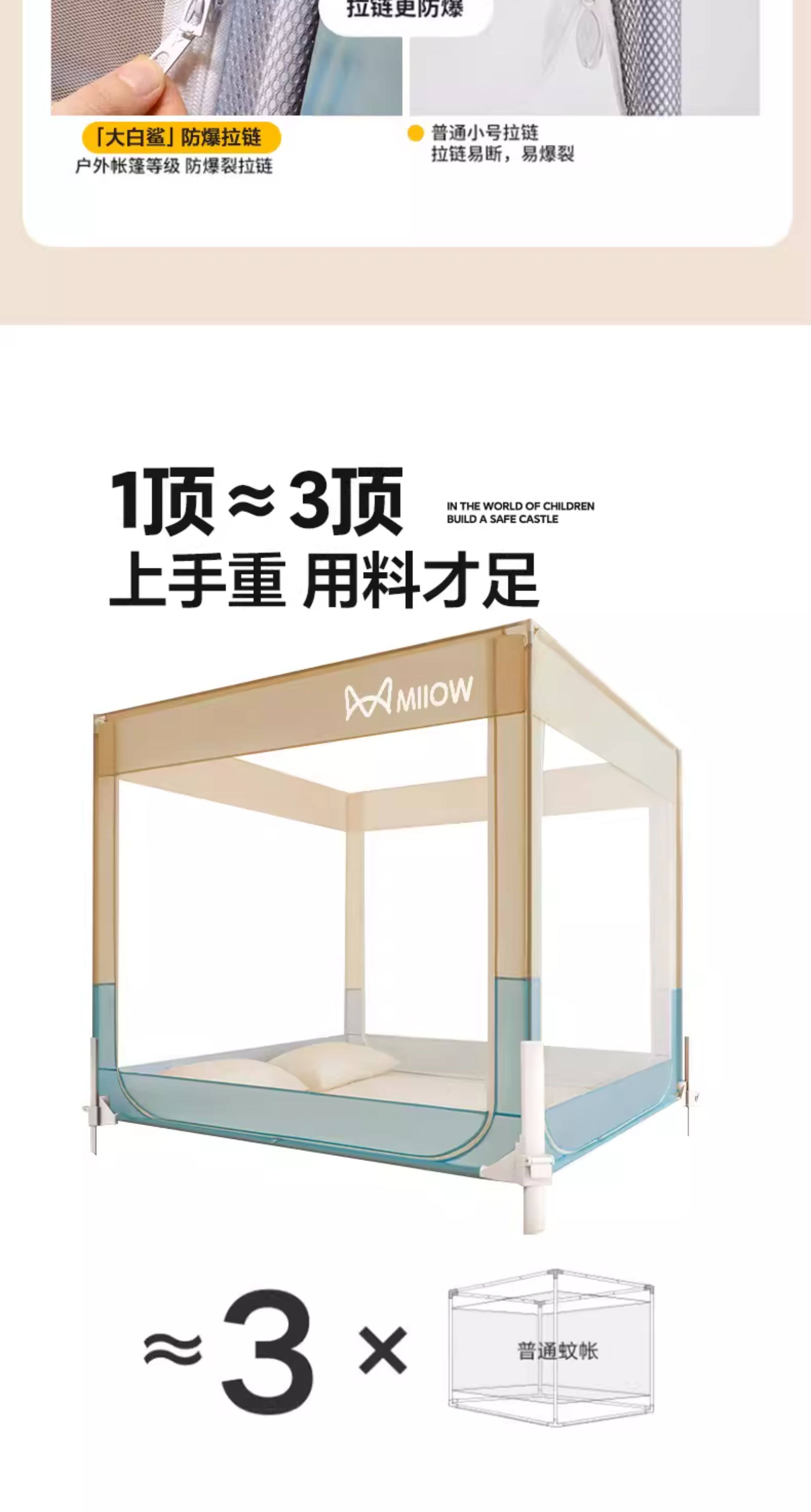 猫人(MiiOW)A类防摔蚊帐1.8x2米家用婴儿床围栏卧室一体式全包围带支架三开门 浅蓝浅米【A类全底帐纱+免拼底座支架】 适用1.8m床-180x200x170cm【专利加固压脚】