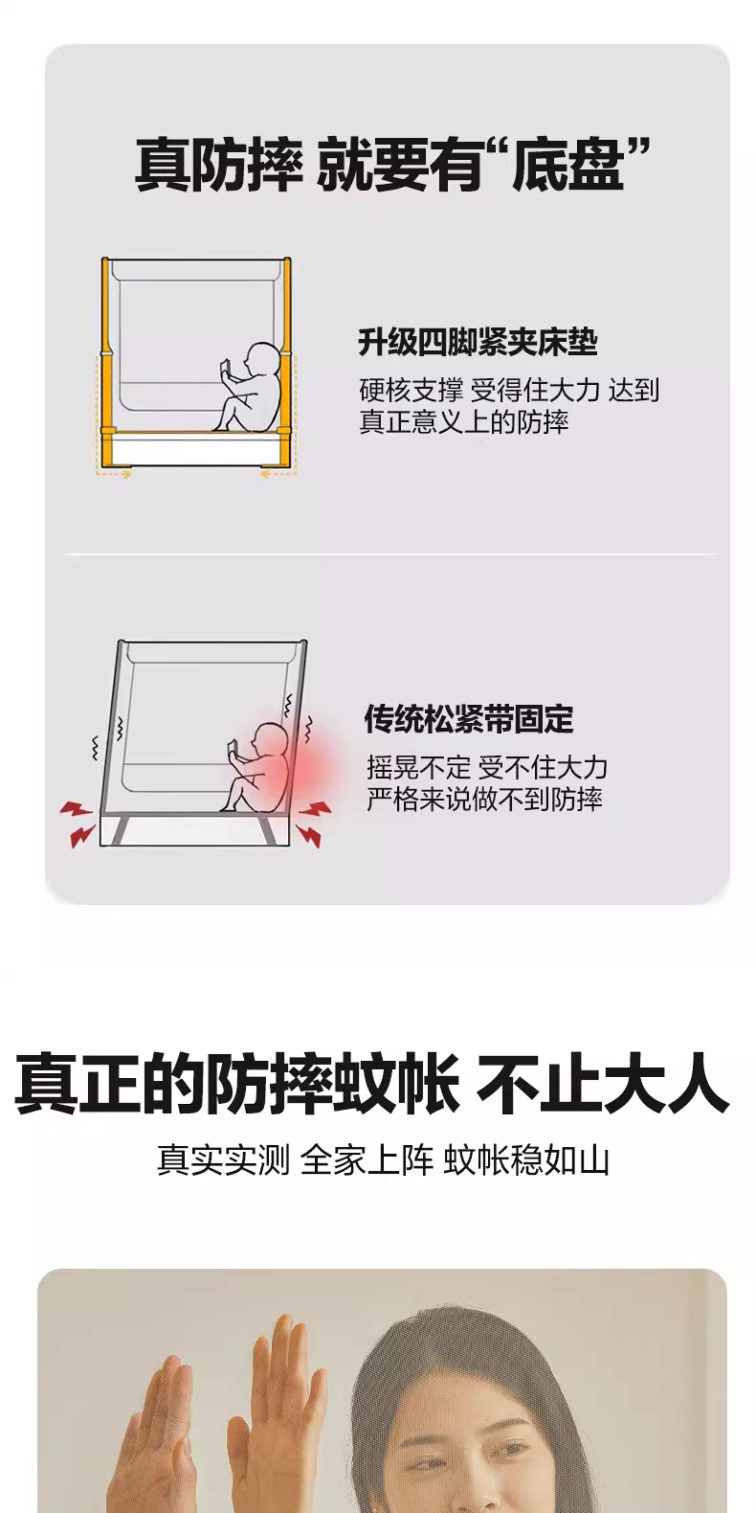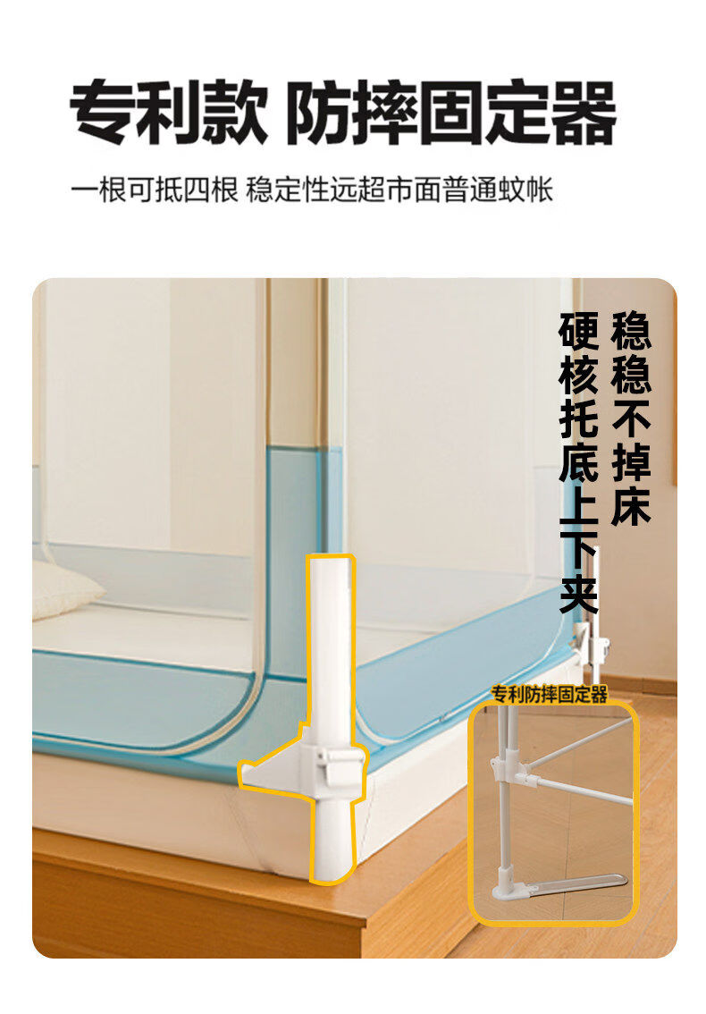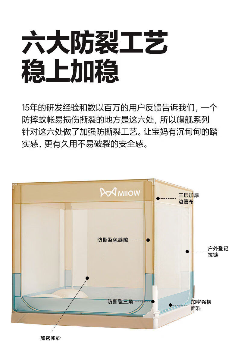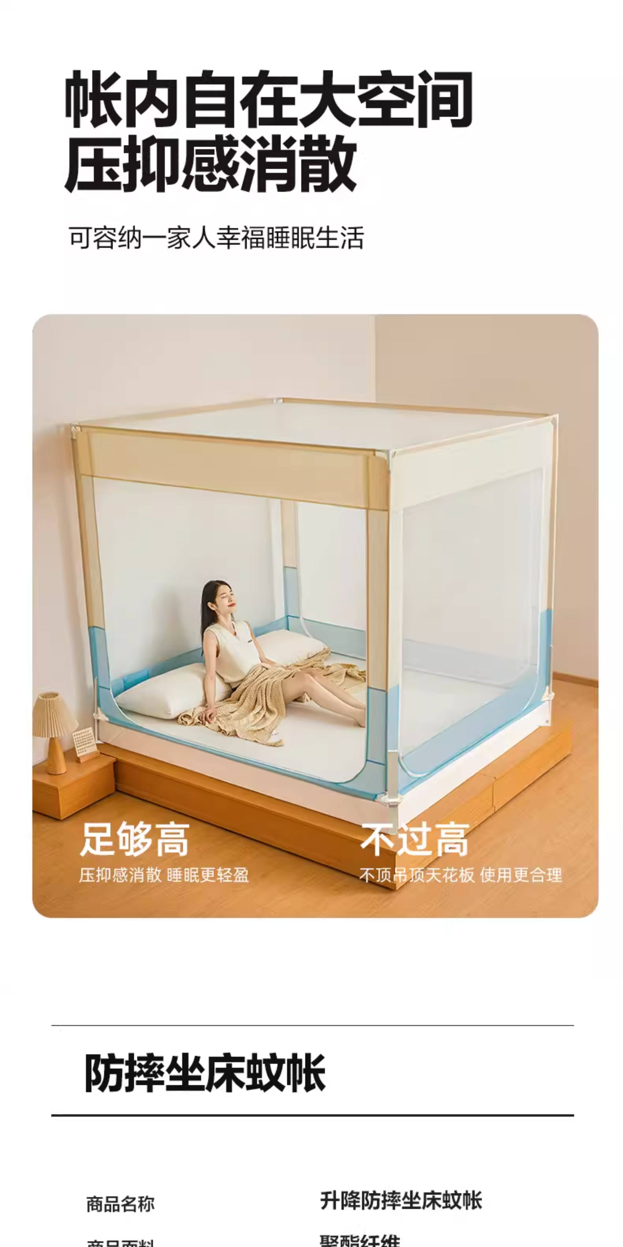 猫人(MiiOW)A类防摔蚊帐1.8x2米家用婴儿床围栏卧室一体式全包围带支架三开门 浅蓝浅米【A类全底帐纱+免拼底座支架】 适用1.8m床-180x200x170cm【专利加固压脚】