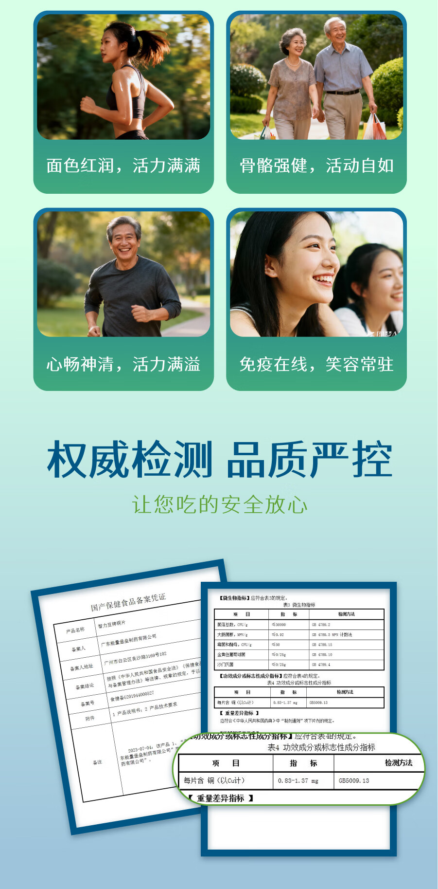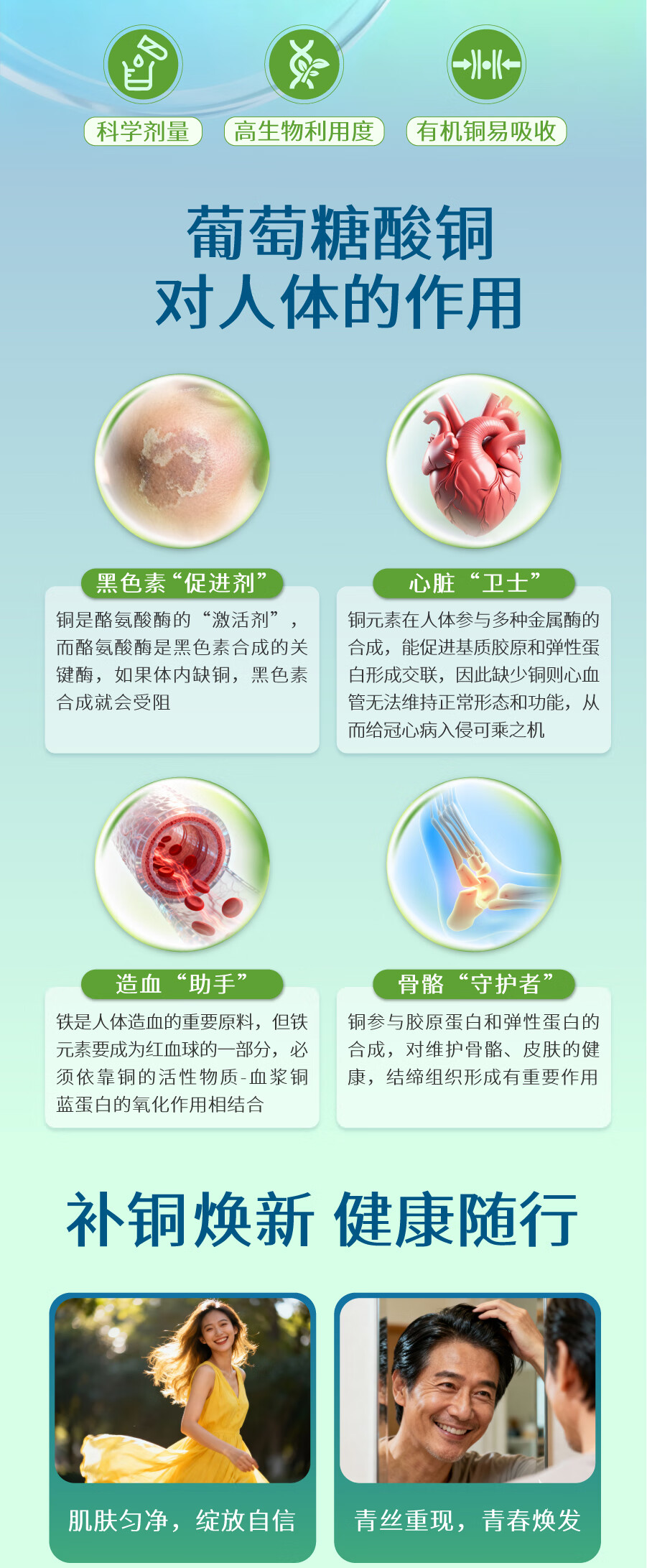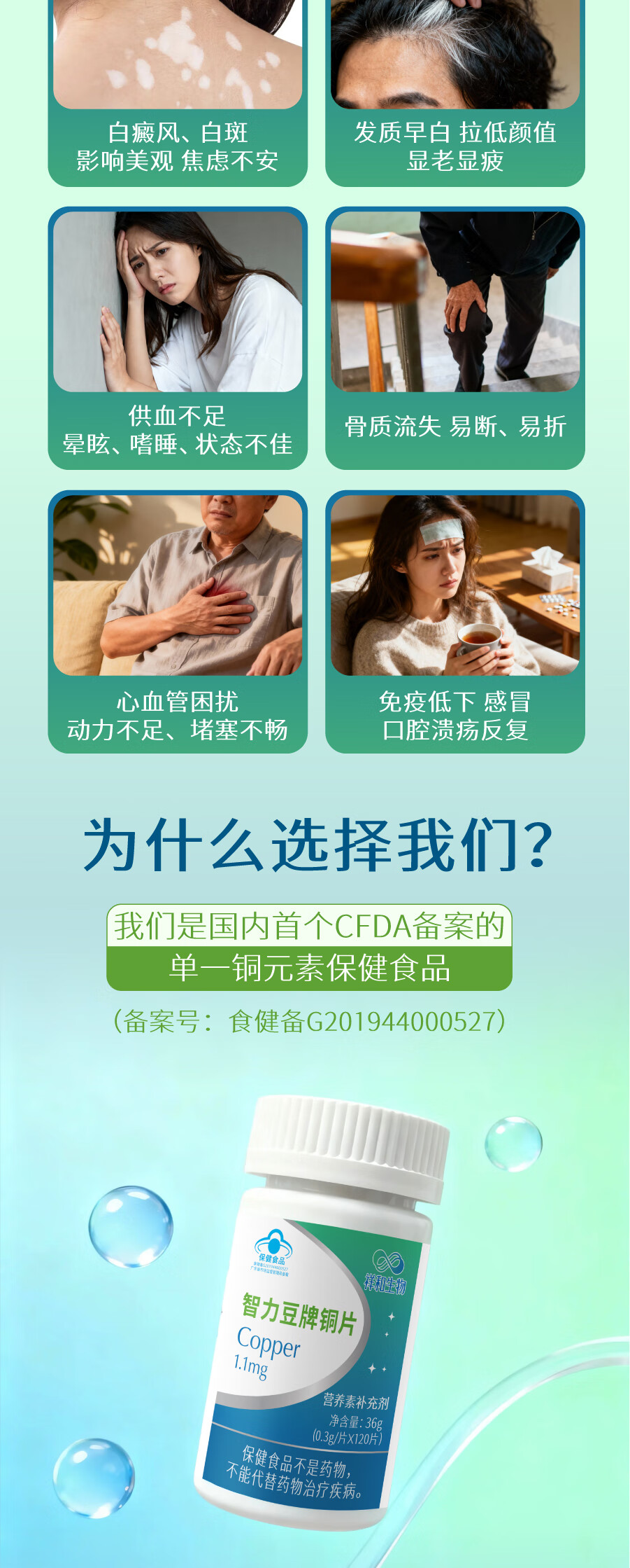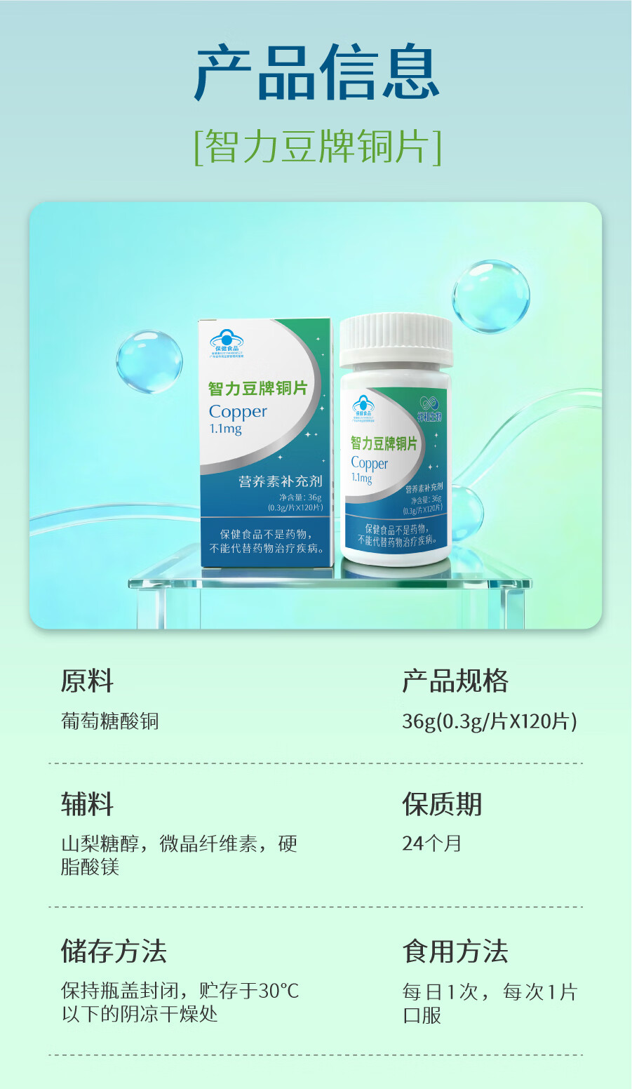 智力豆牌铜片葡萄糖酸铜科学补铜微量元素蓝帽子保健品铜营养补剂120片 120片*1瓶