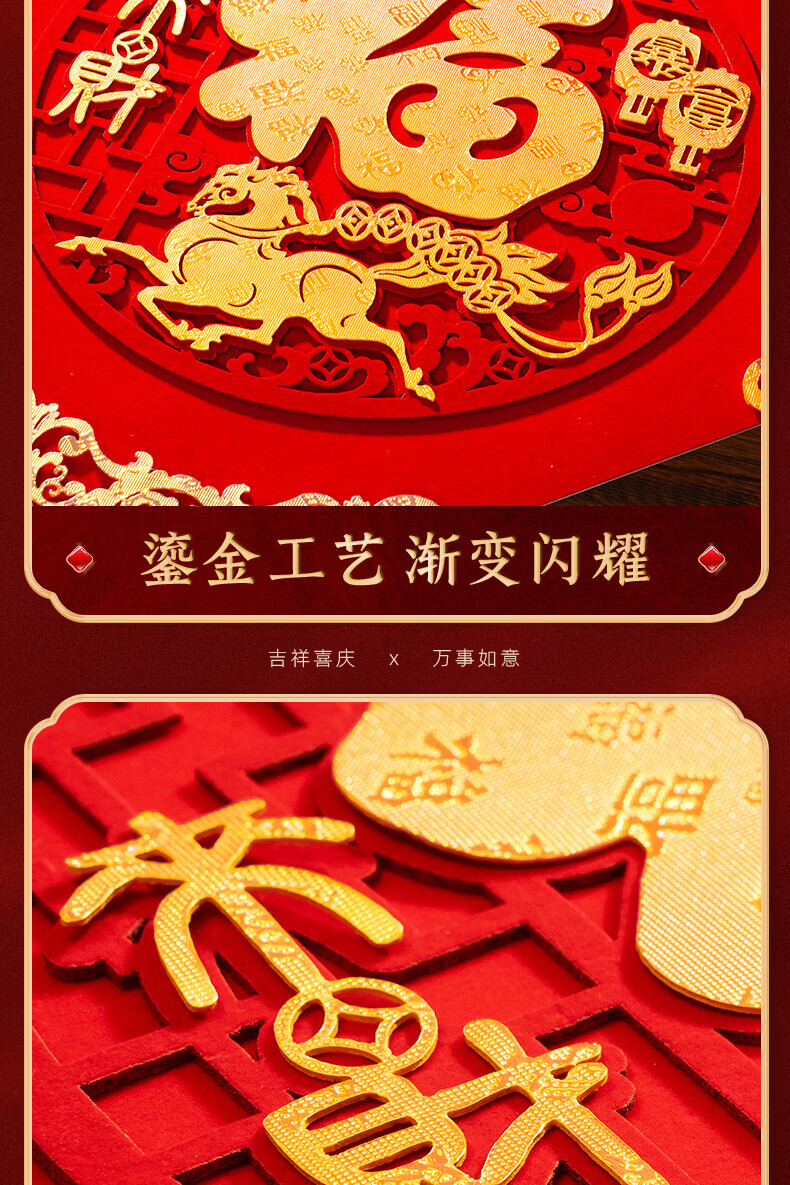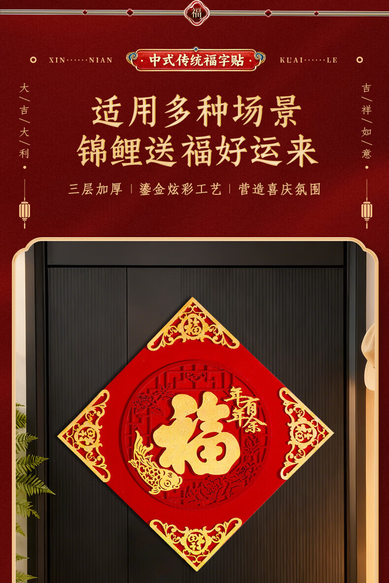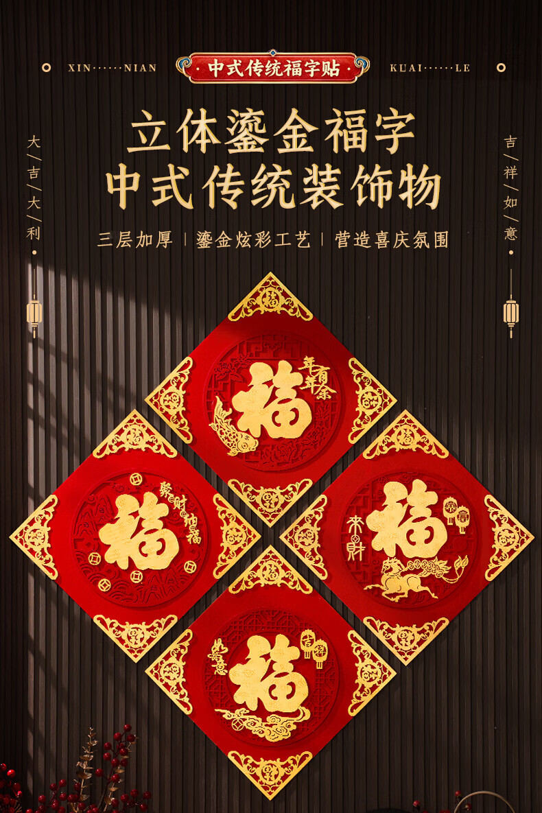 简艺饰家新年装饰福字贴4个2026马年装饰春节过年装饰立体窗花大门贴窗贴 新年送福(烫金红包30个)