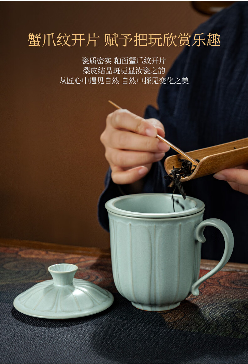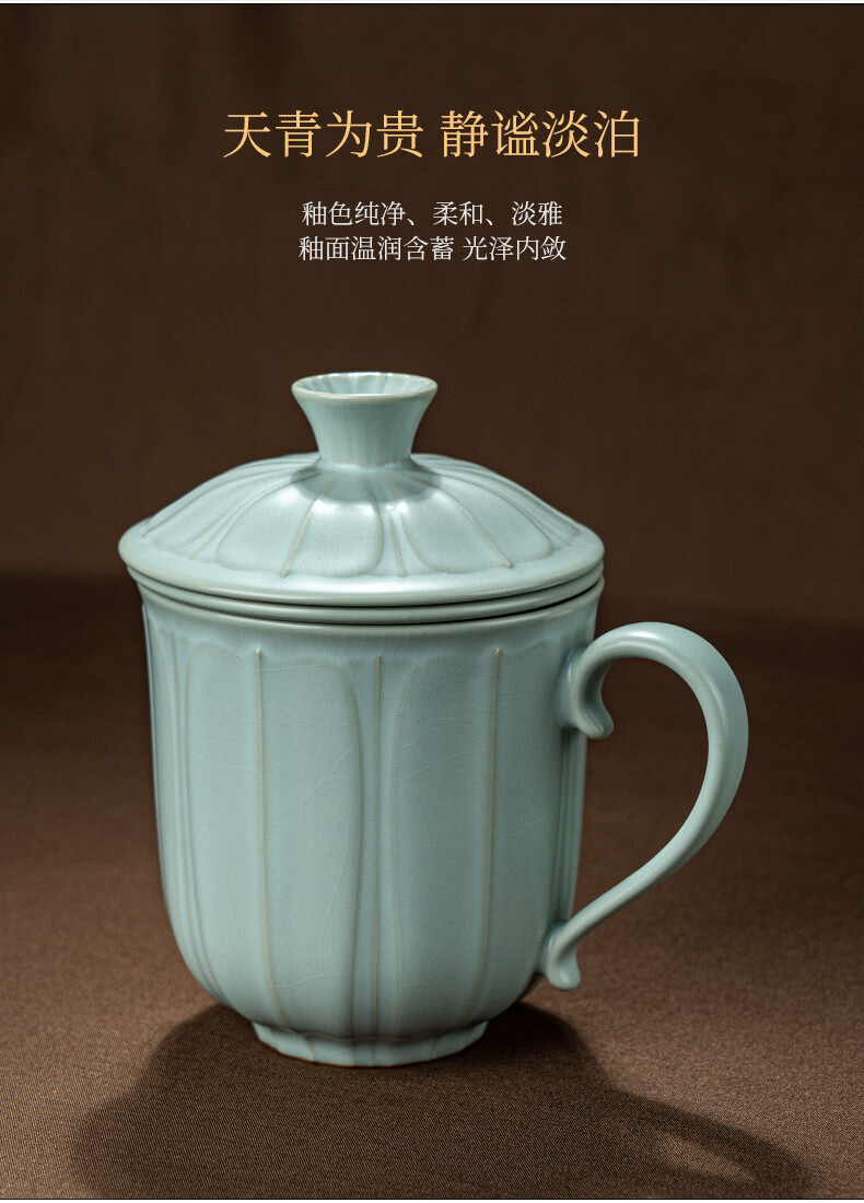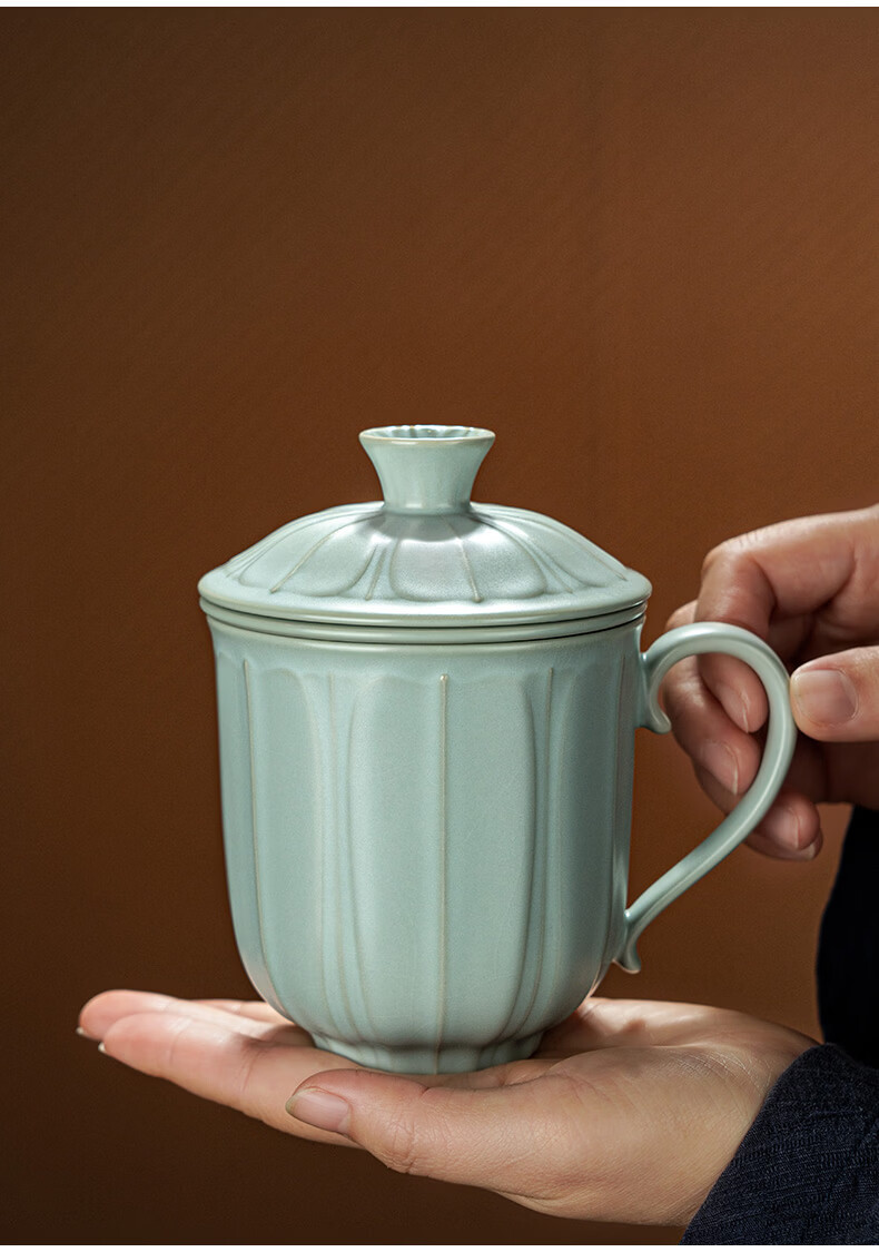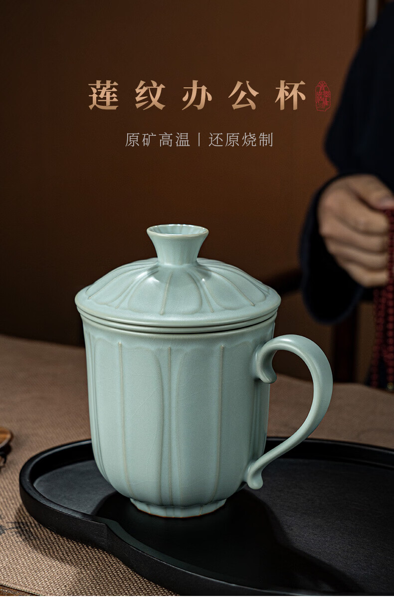 青澹墨雅汝窑茶杯茶具景德镇办公室家用泡茶高档水杯可养纯手工复古汝瓷杯 莲纹办公杯390ml