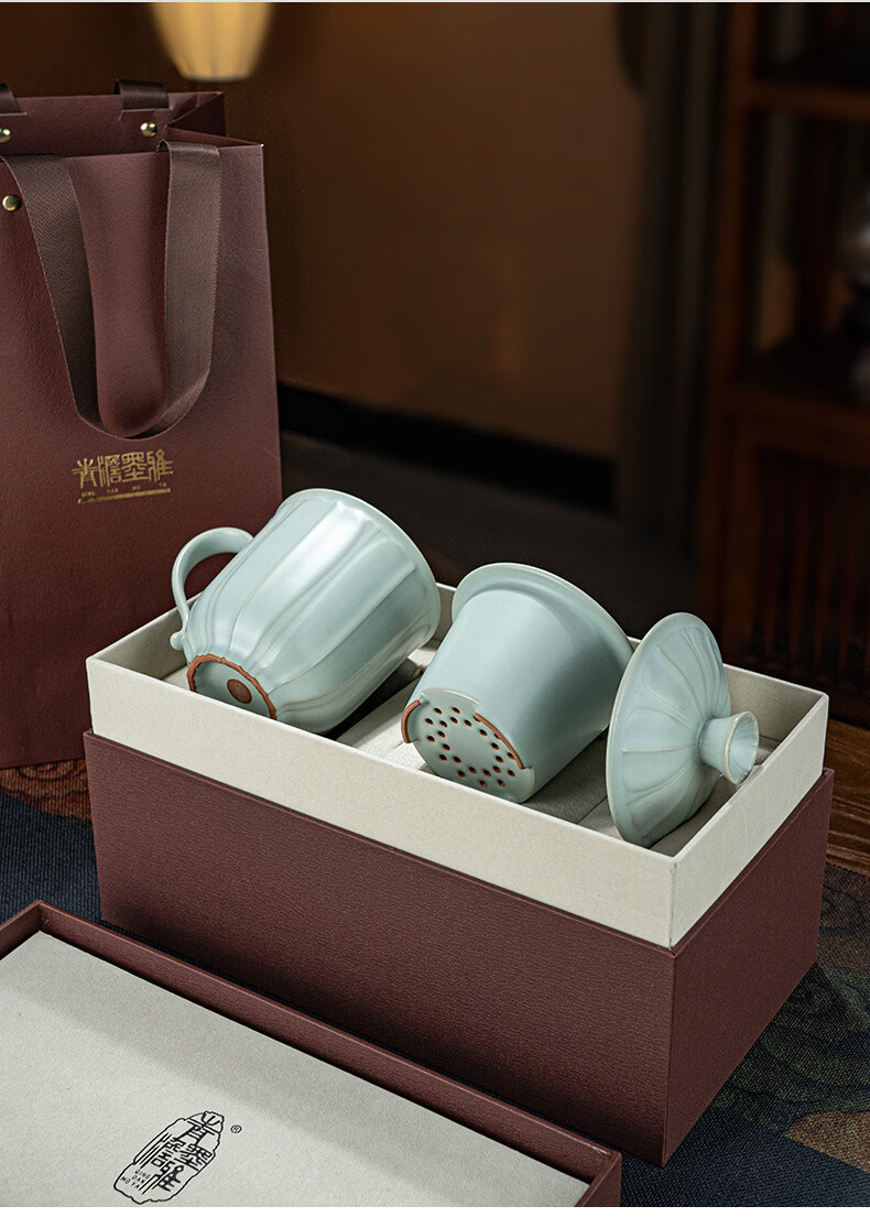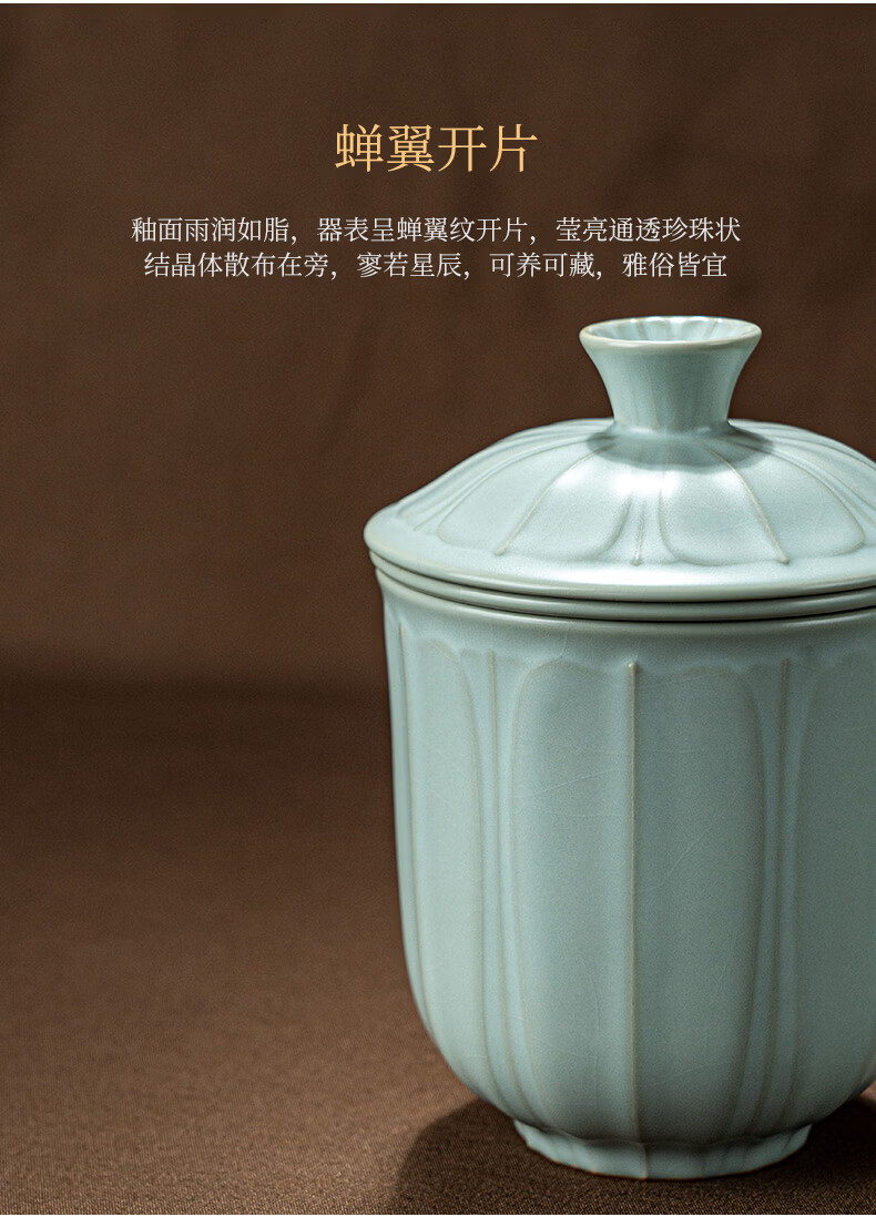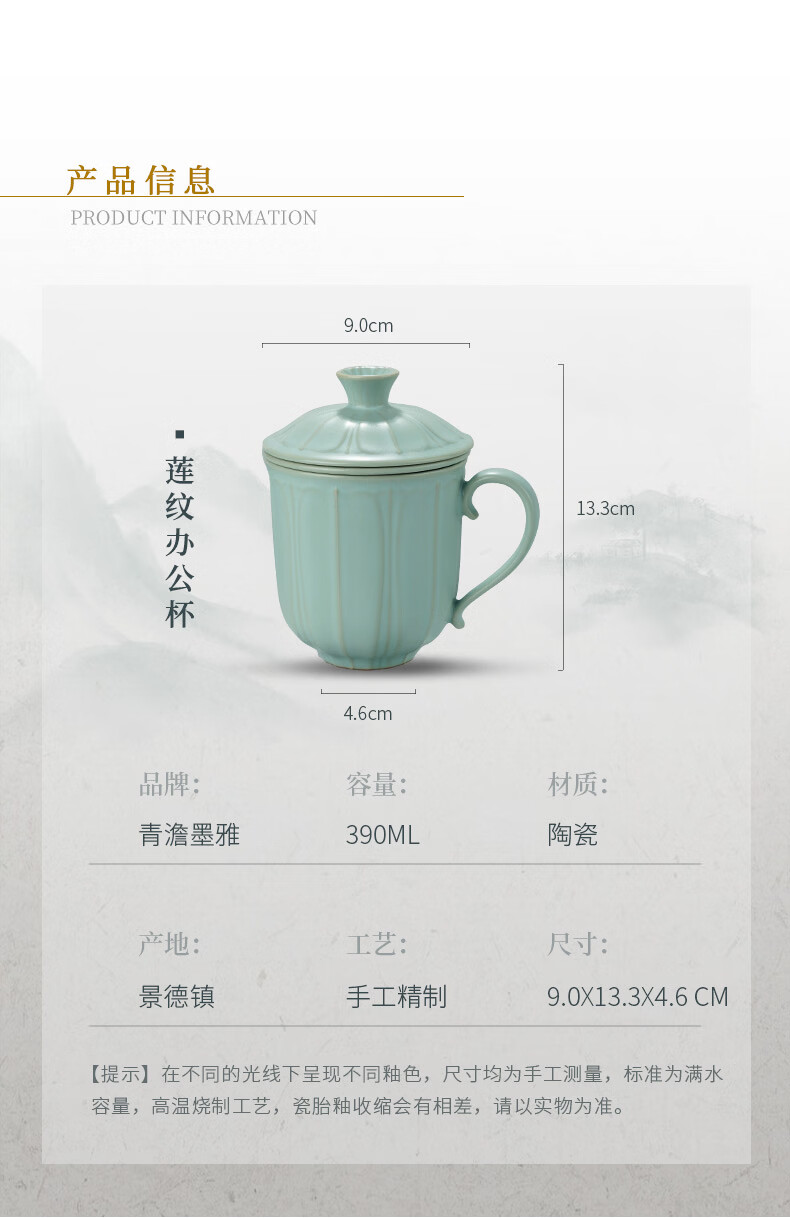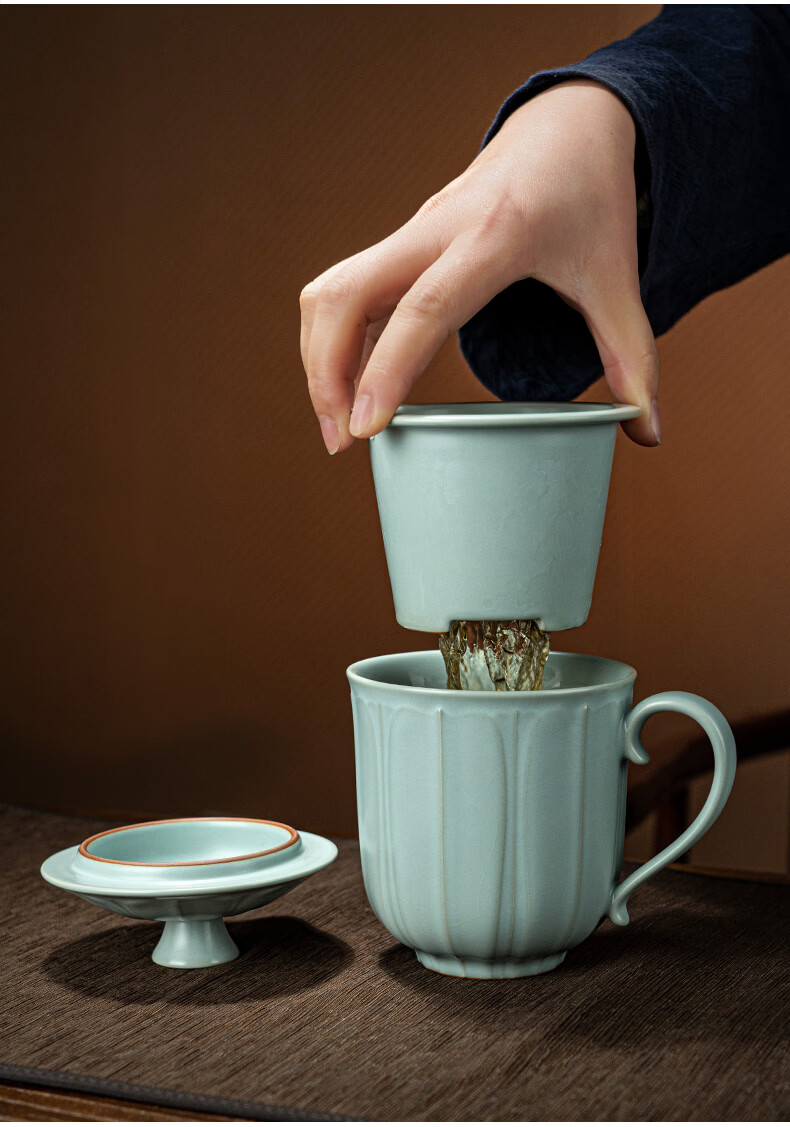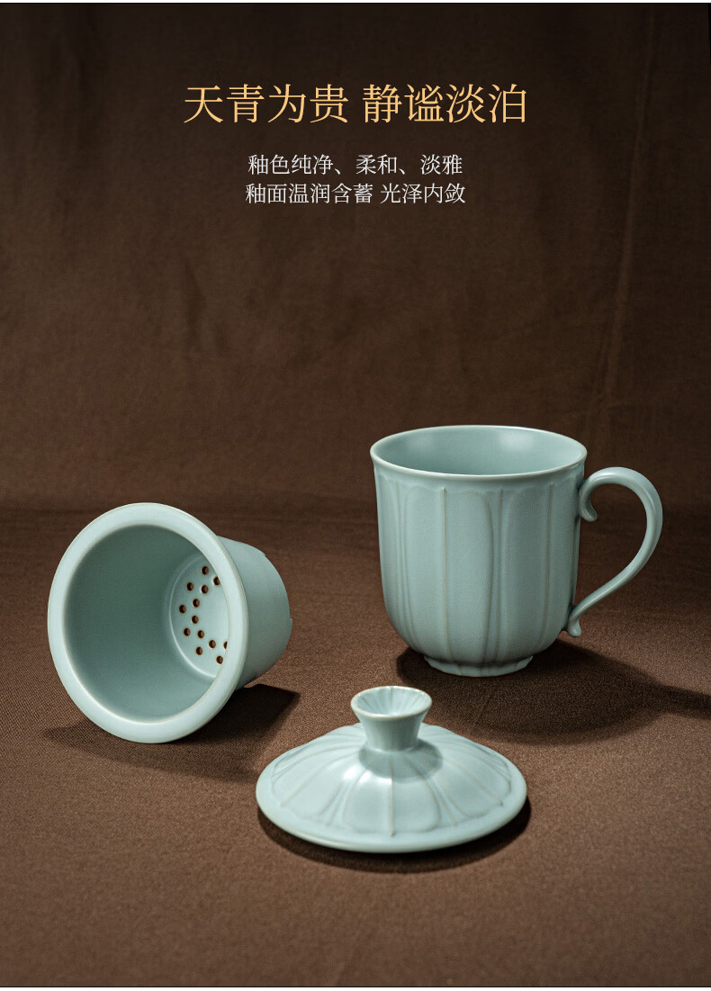 青澹墨雅汝窑茶杯茶具景德镇办公室家用泡茶高档水杯可养纯手工复古汝瓷杯 莲纹办公杯390ml