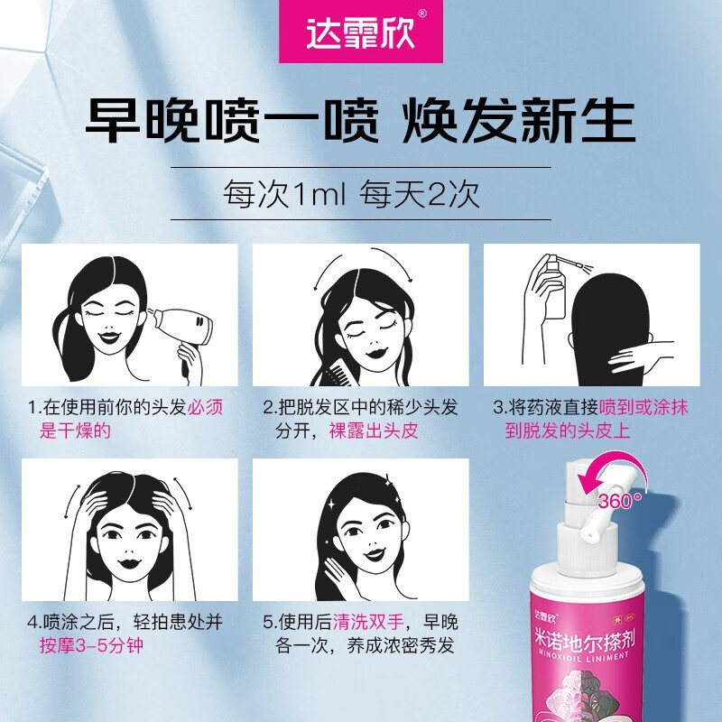 [达霏欣]米诺地尔搽剂 60ml:1.2g 2瓶装 酊男女士专用治秃发斑秃严重脱发生发喷雾掉发防脱密发官方授权正品 2个月用量,咨询领优惠