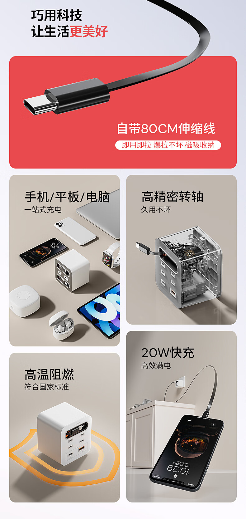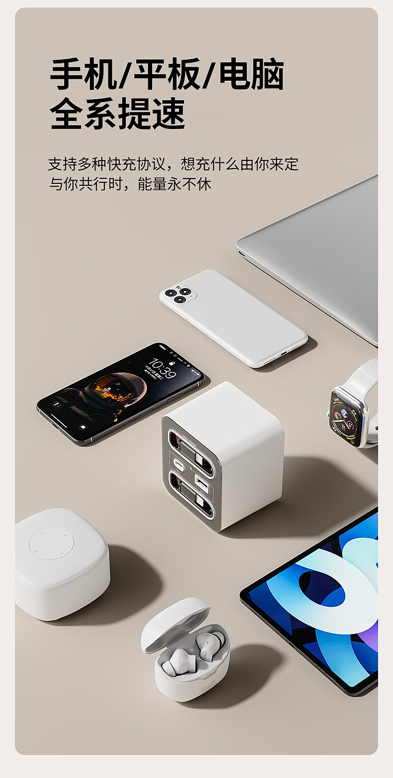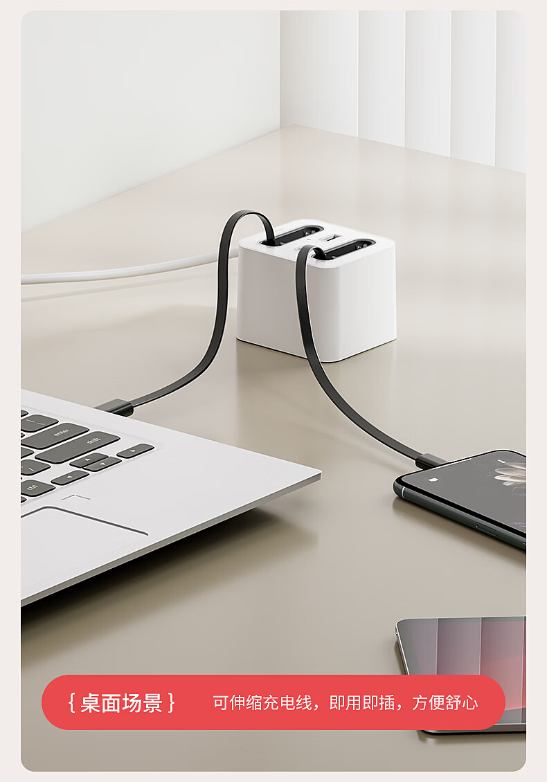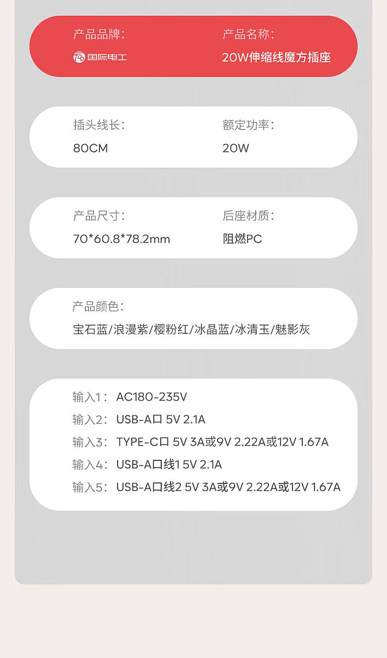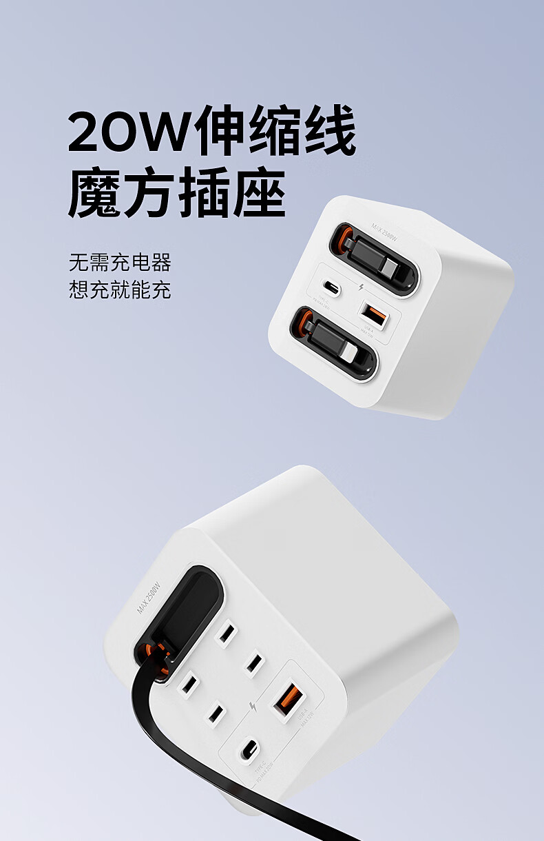 国际电工20W快充家用无线魔方插座带线转换器USB可移动电源无需充电器插头 蓝色20w快充安卓伸缩线四孔+U+C