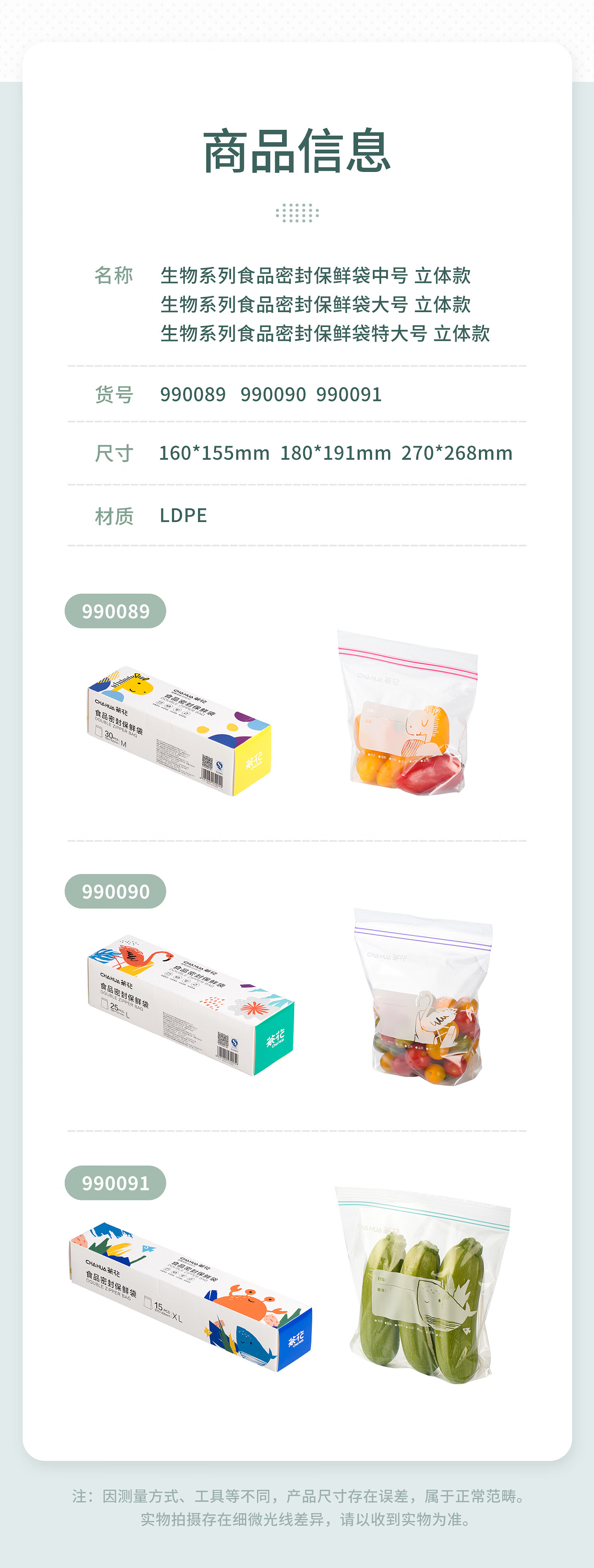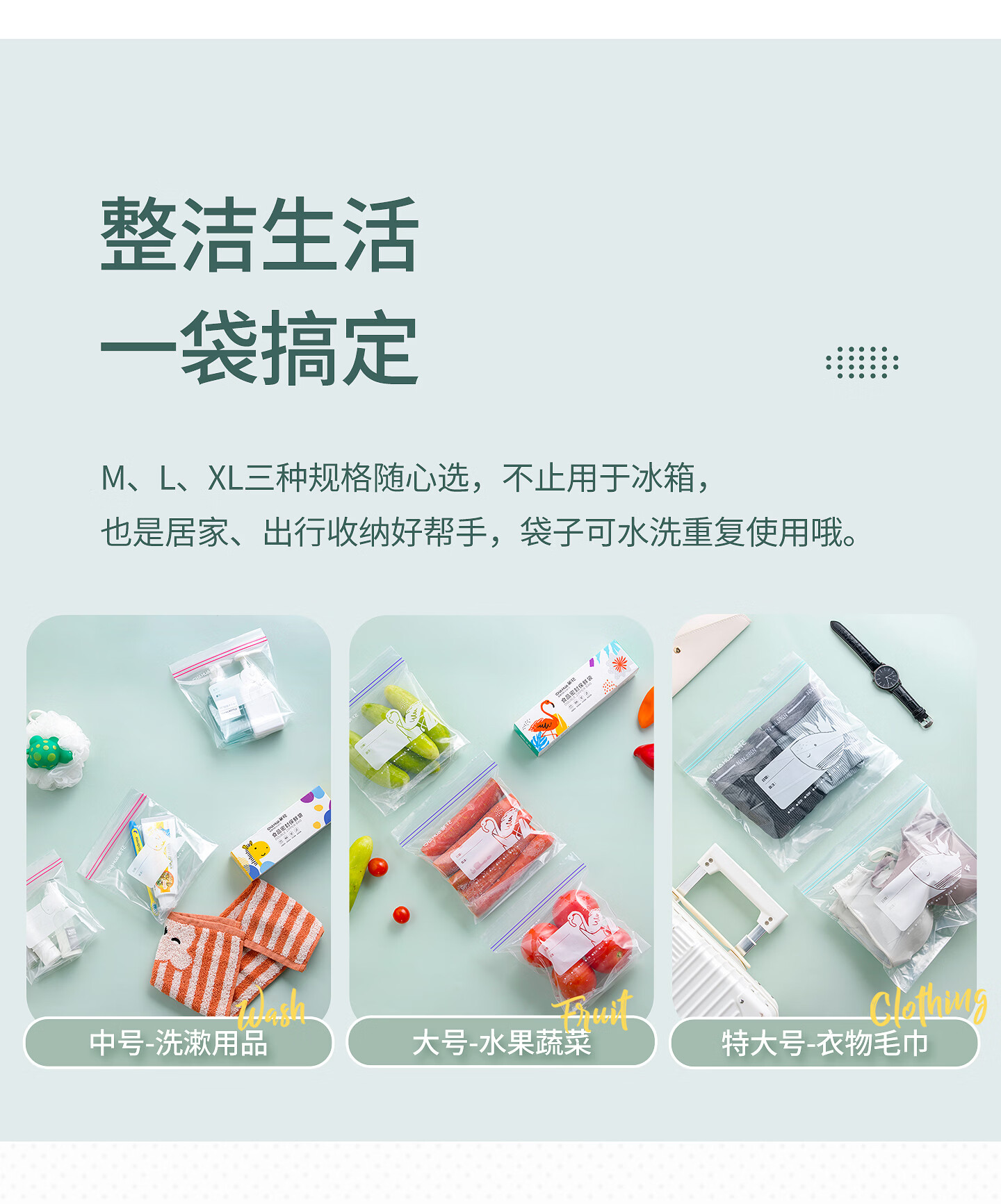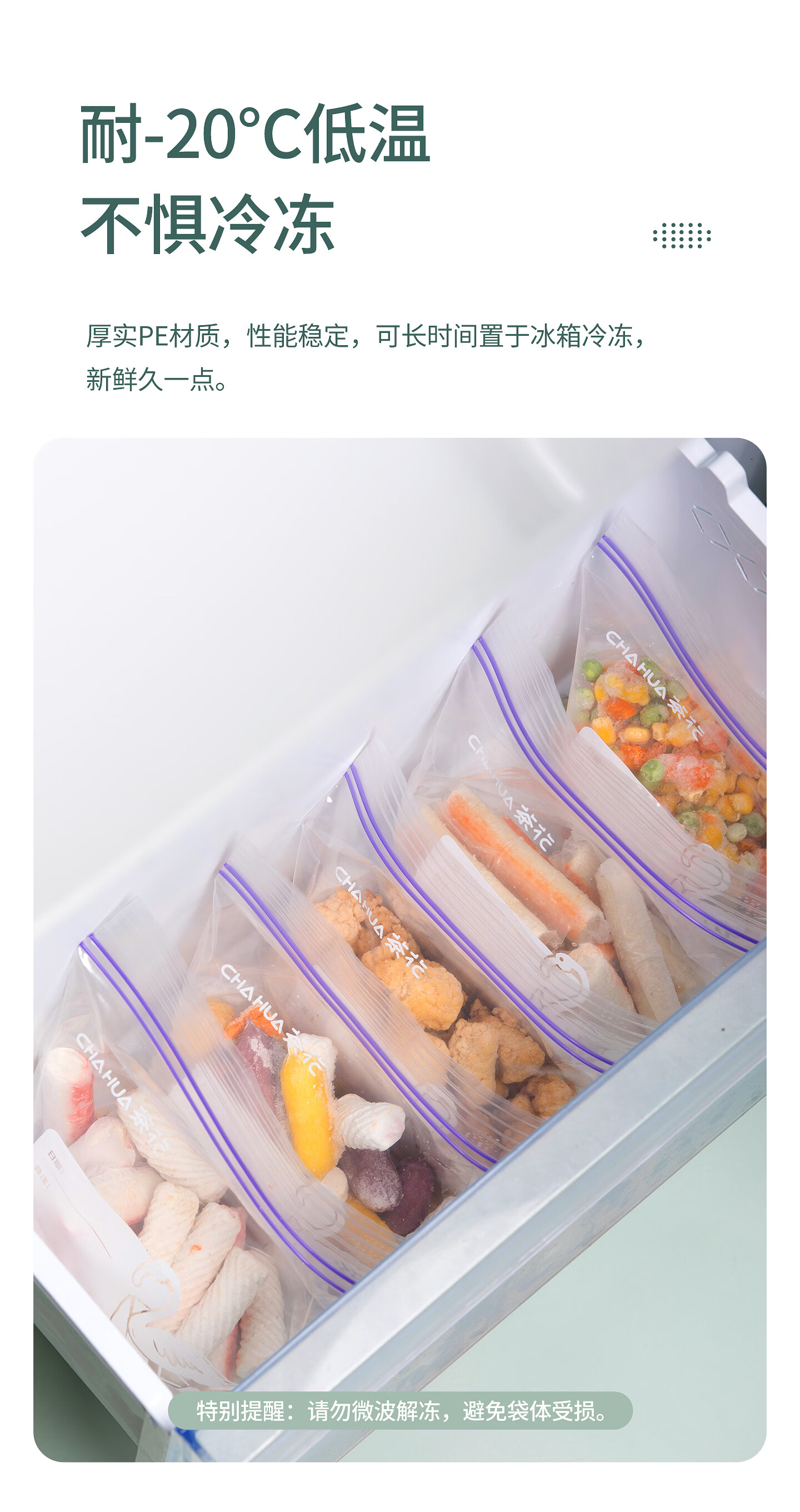 CHAHUA生物系列家用拉链密封袋密实袋食品袋收纳分装冷冻透明保鲜袋 【共70只】中号30只+大号25只+特大号15只
