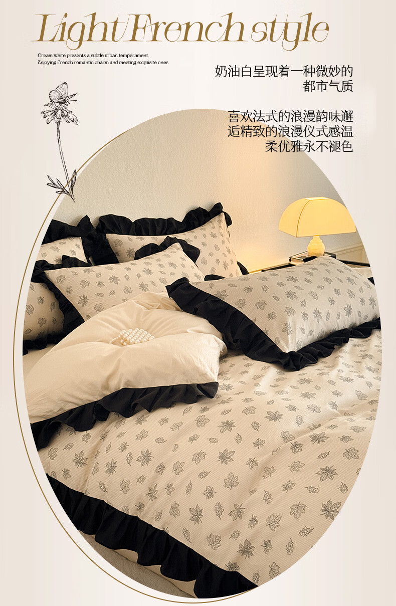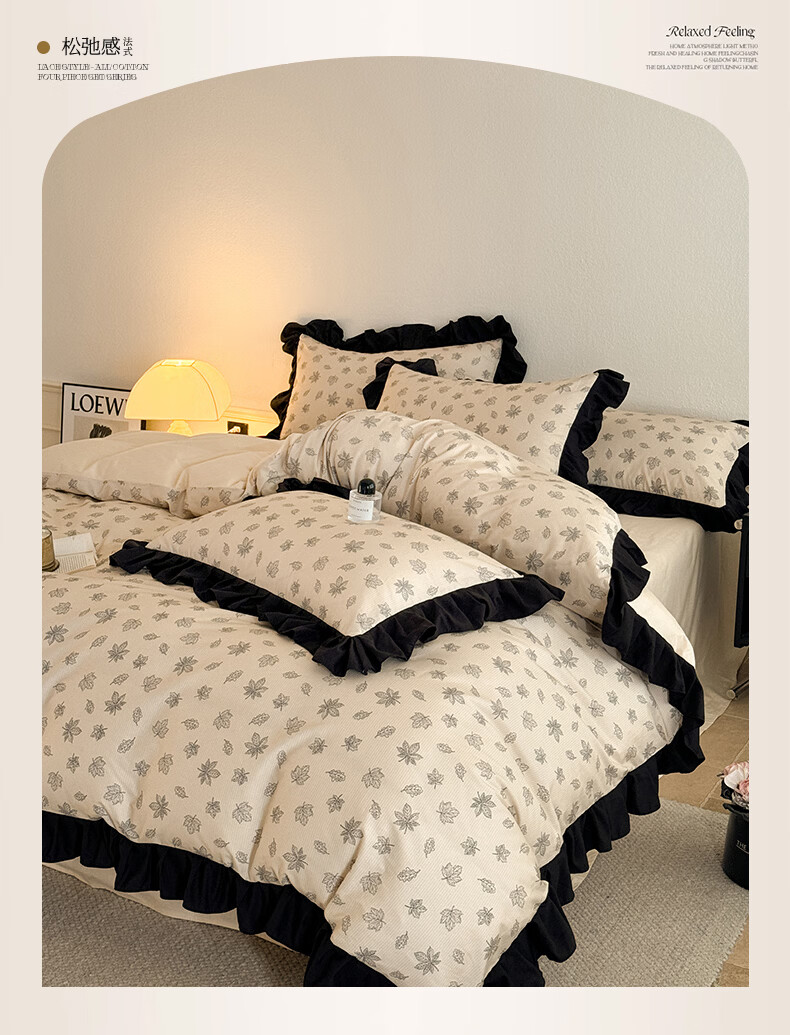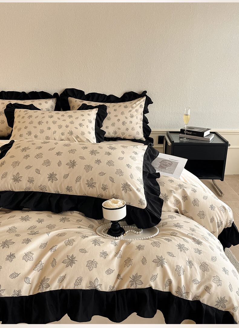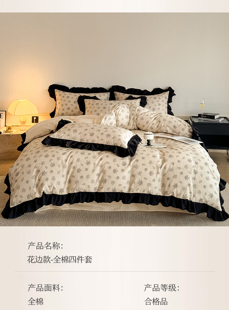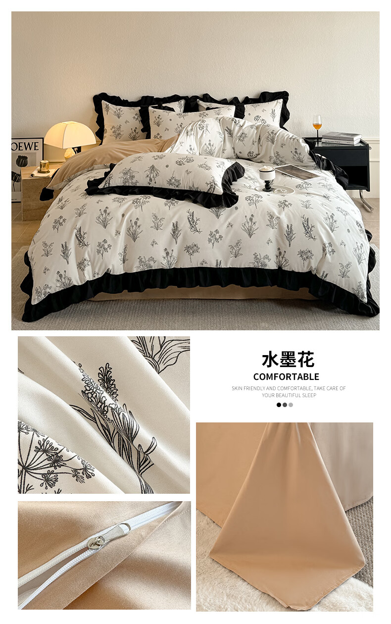 无印良品法式花边纯棉床上四件套全棉高端轻奢高级感床单被套家用床笠套件 水墨花【100%全棉 柔软舒适】 1.8m 床单款 四件套-被套200x230cm