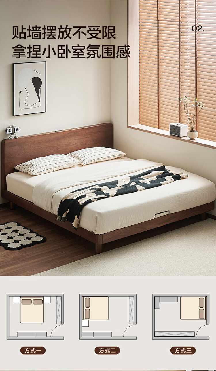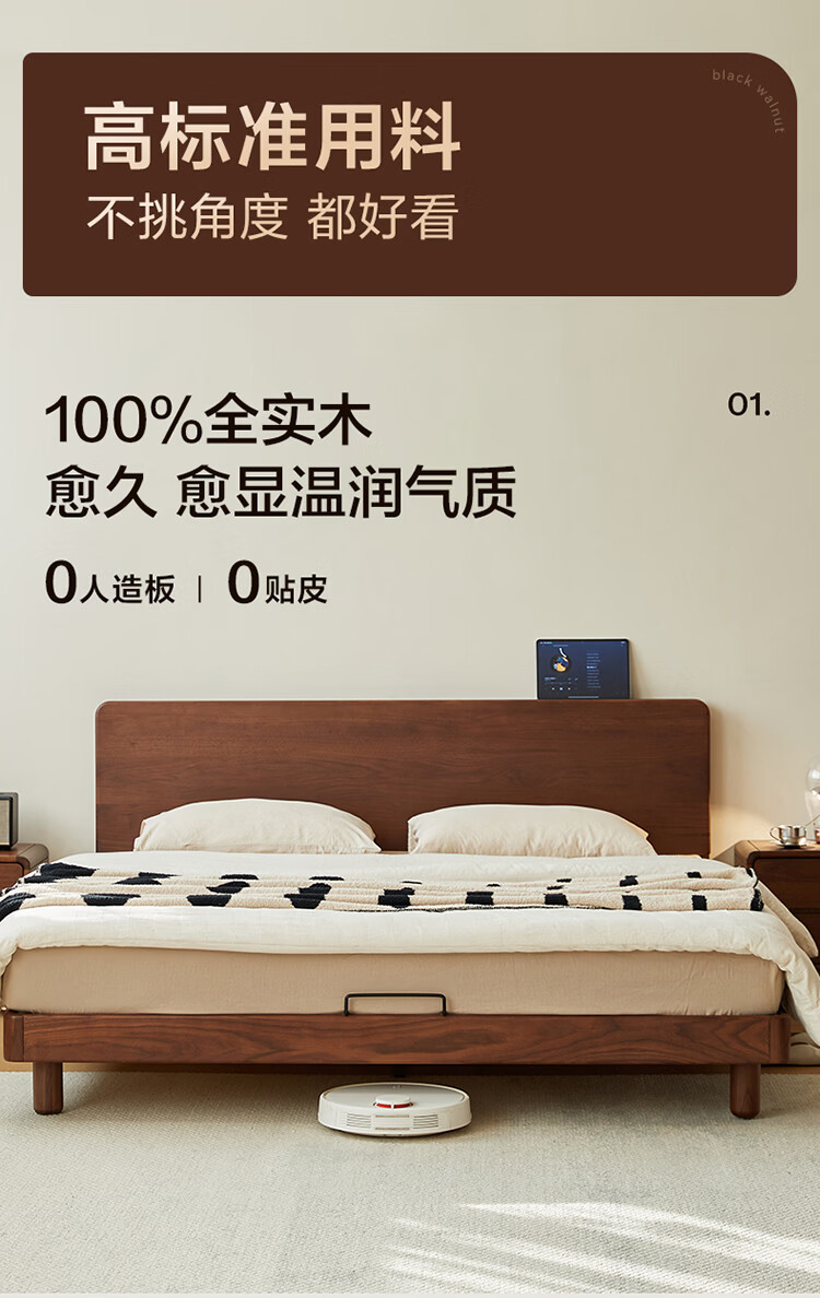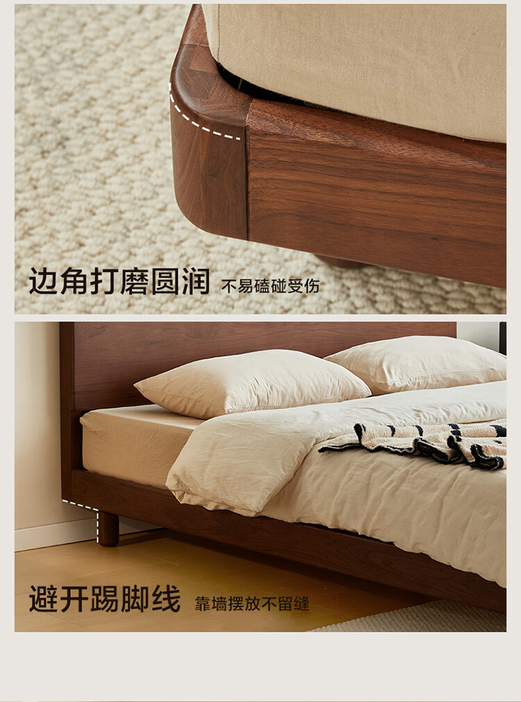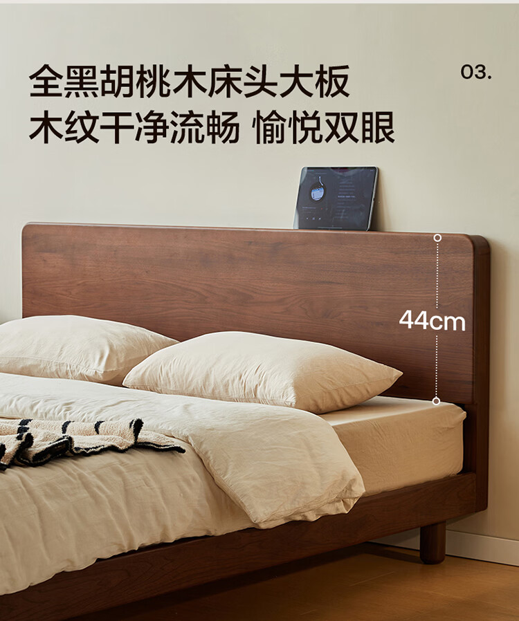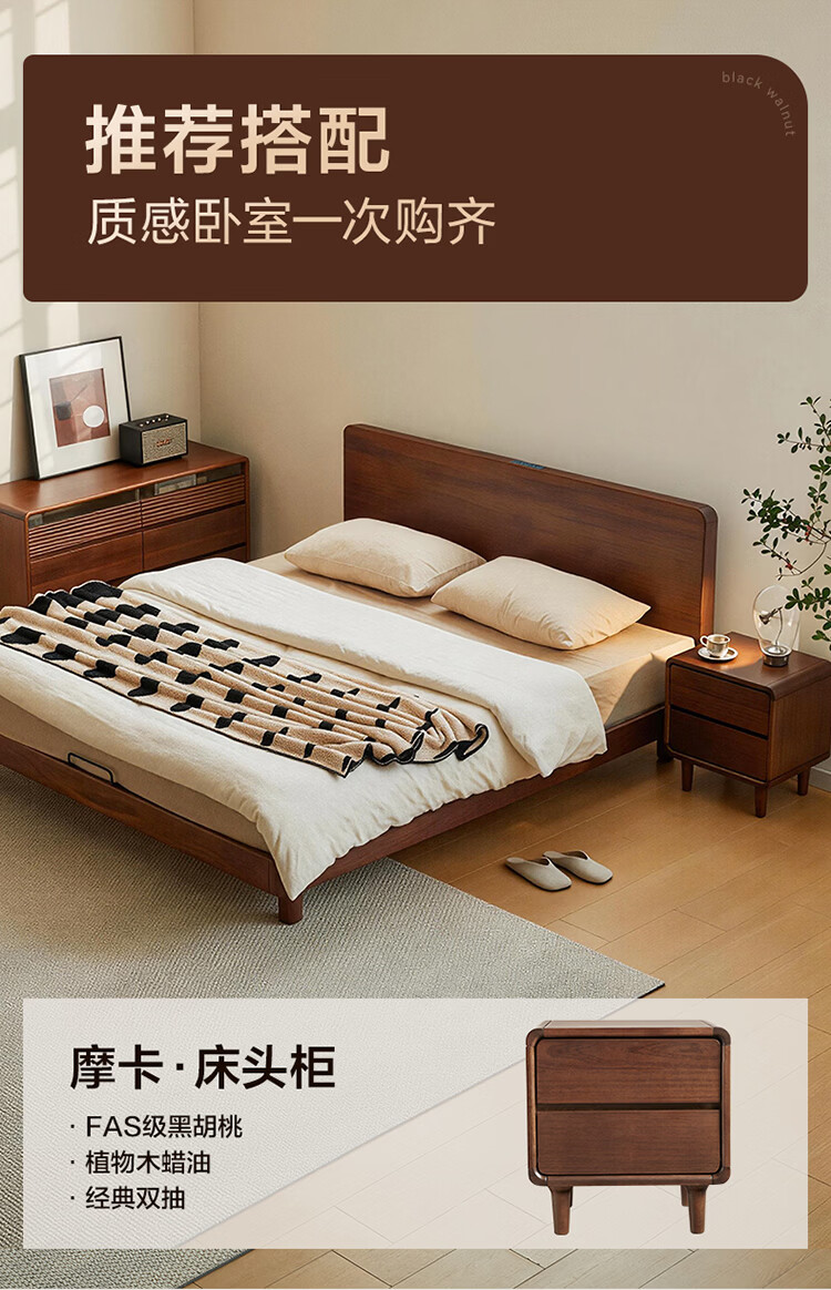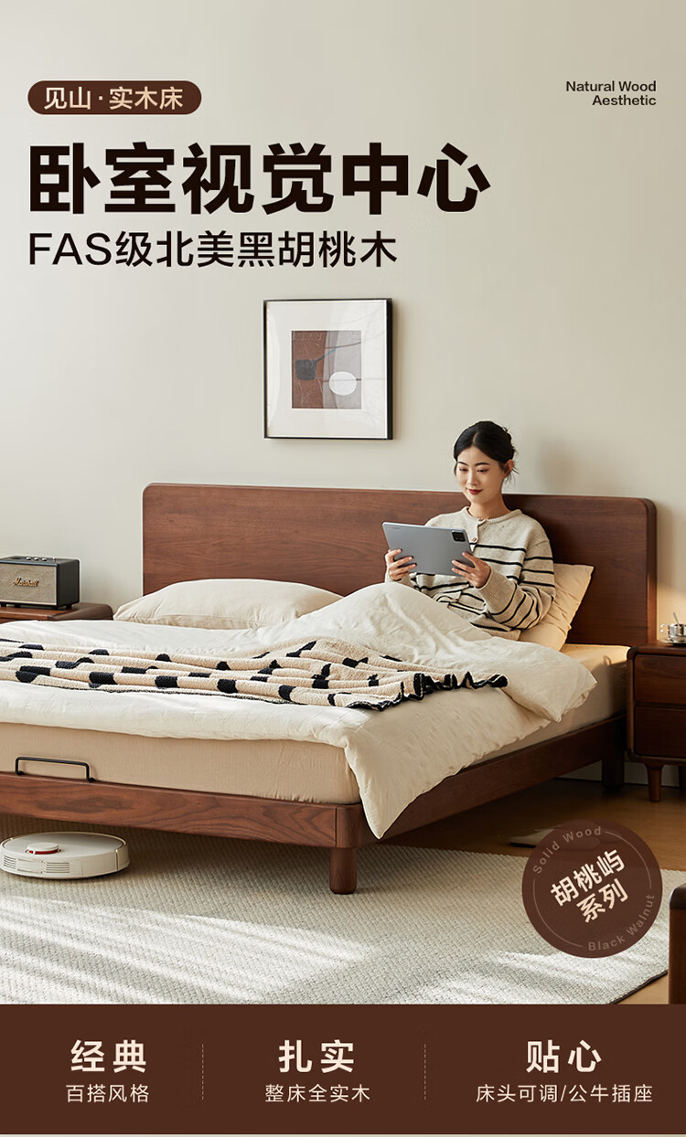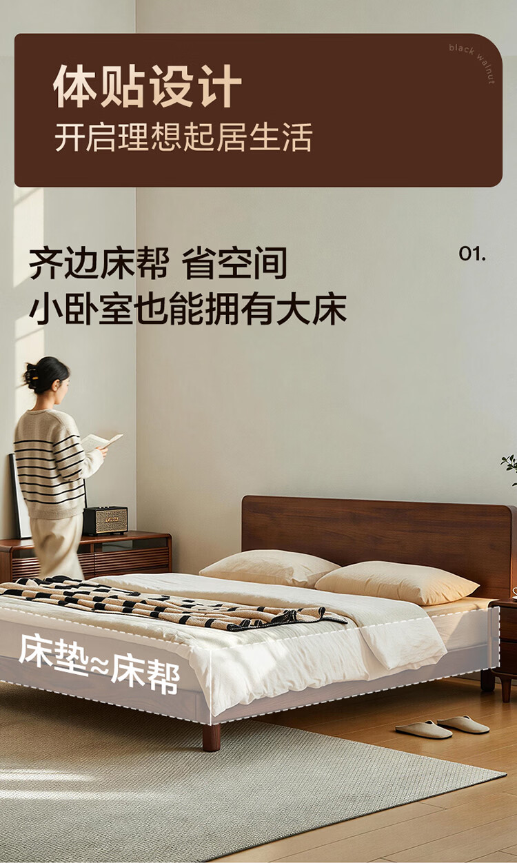 全友家居原木风北美黑胡桃实木床2026新款小户型齐边床主卧室双人大床 【黑胡桃木 | 公牛插座 | 松木铺板】高脚款 1.8米x2米 床