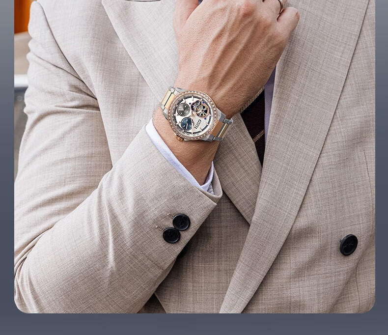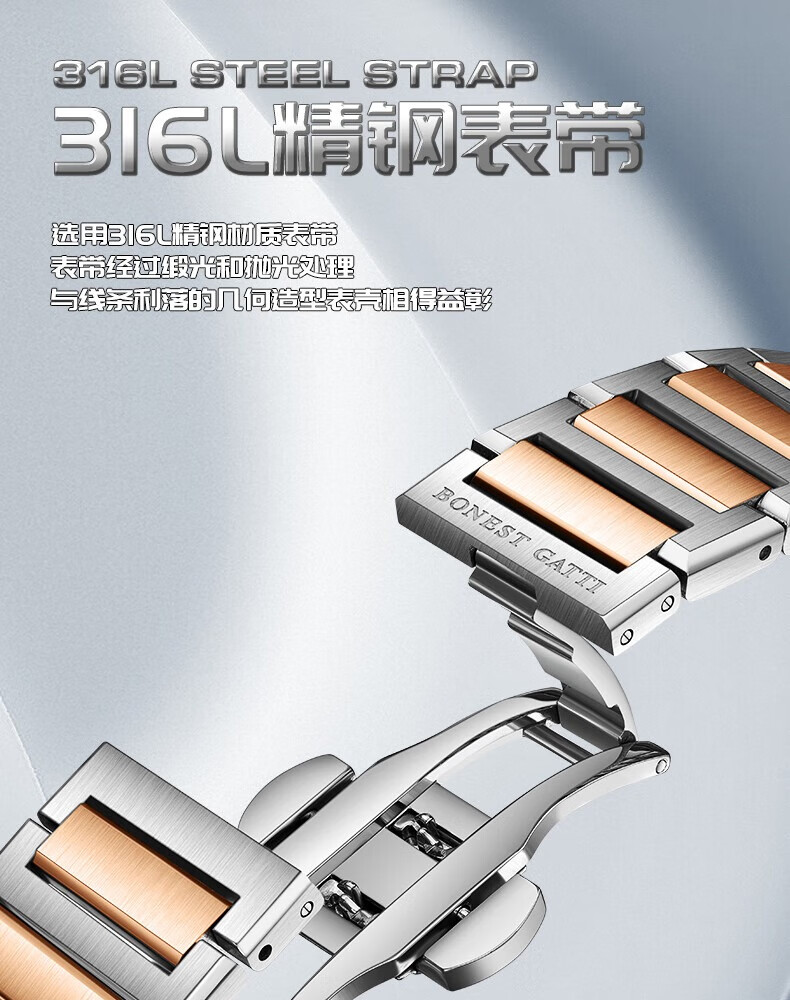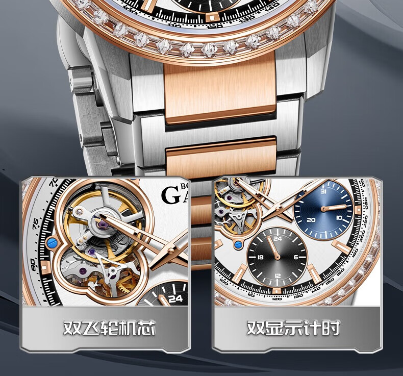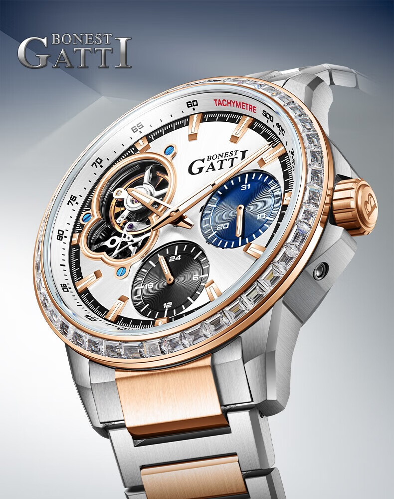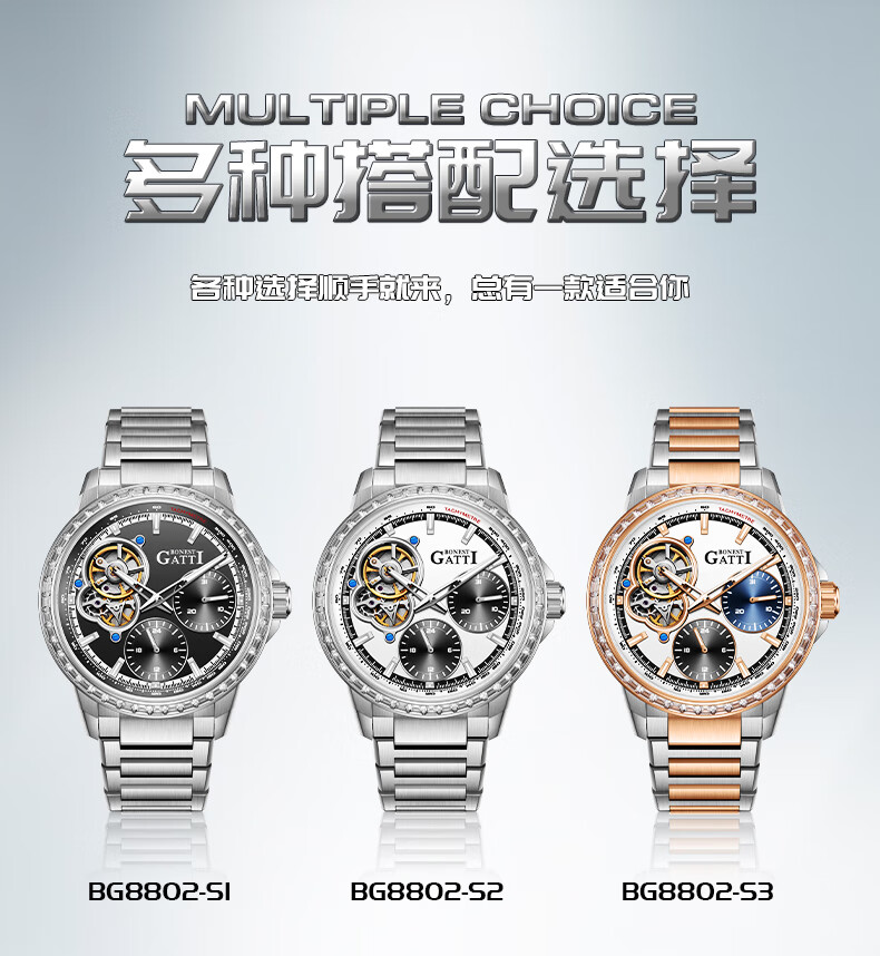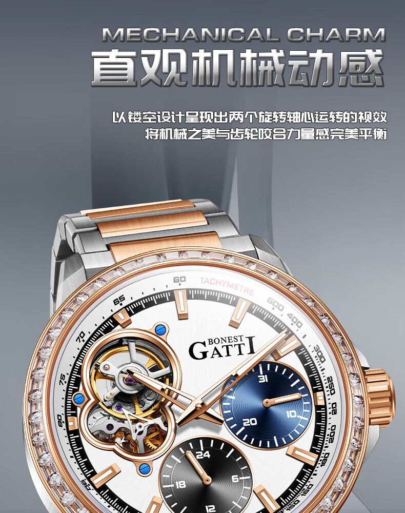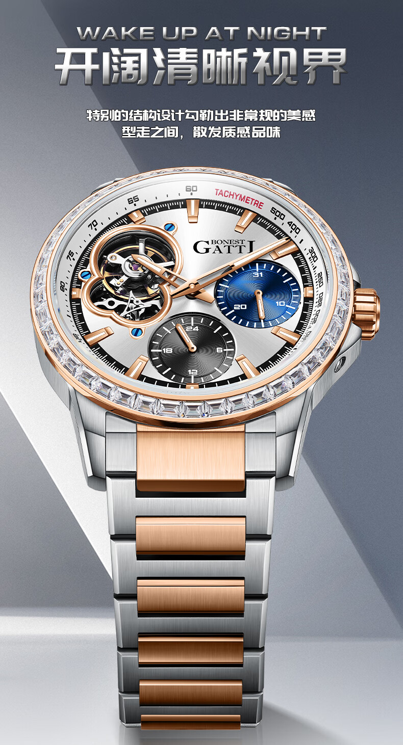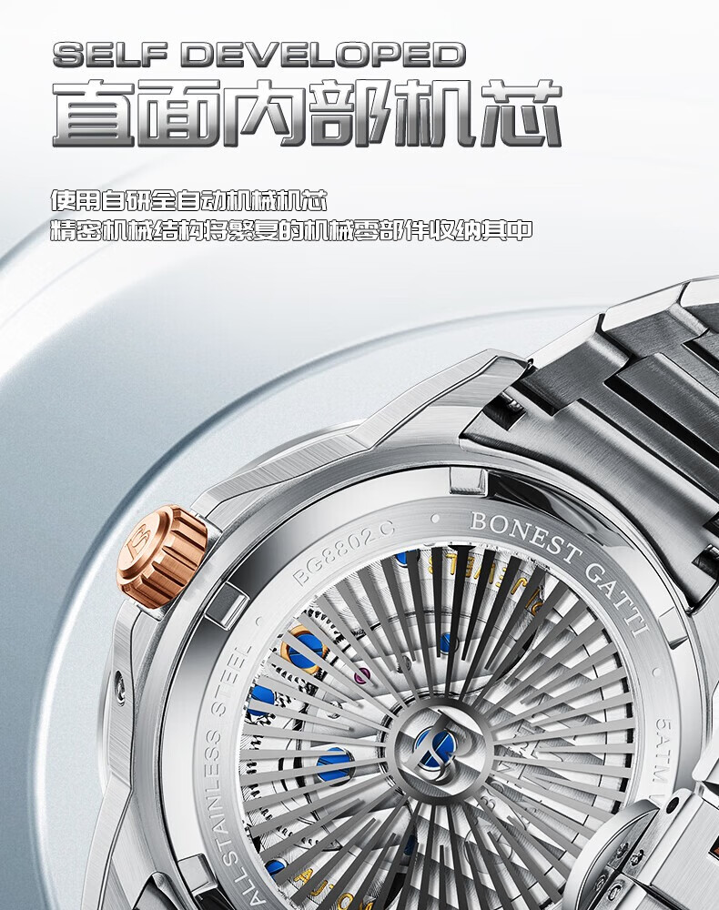布加迪(BONEST GATTI)手表德国全自动机械表镂空男士腕表钢带款新年情人节礼物送男友 BG8006玫壳白面玫钢带