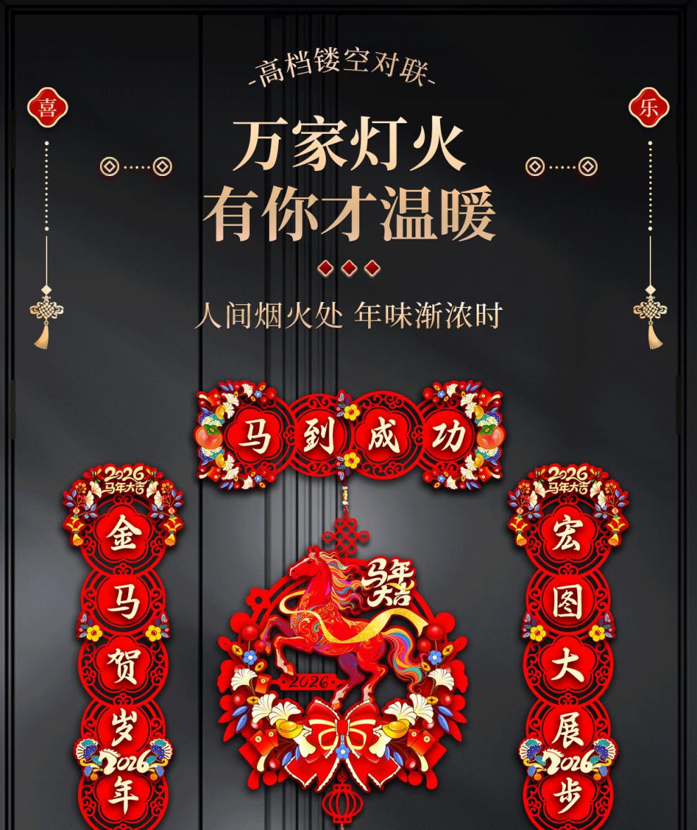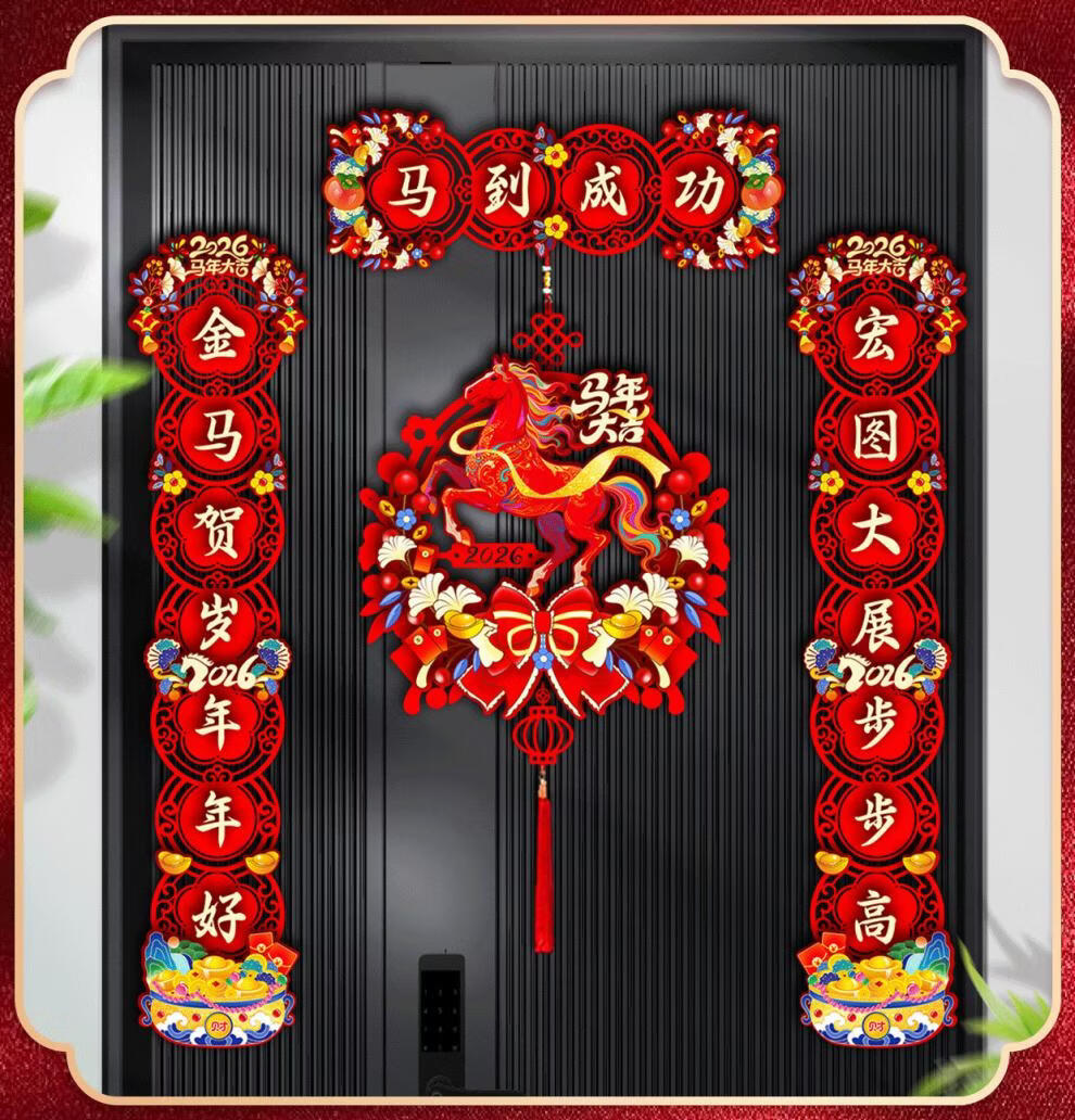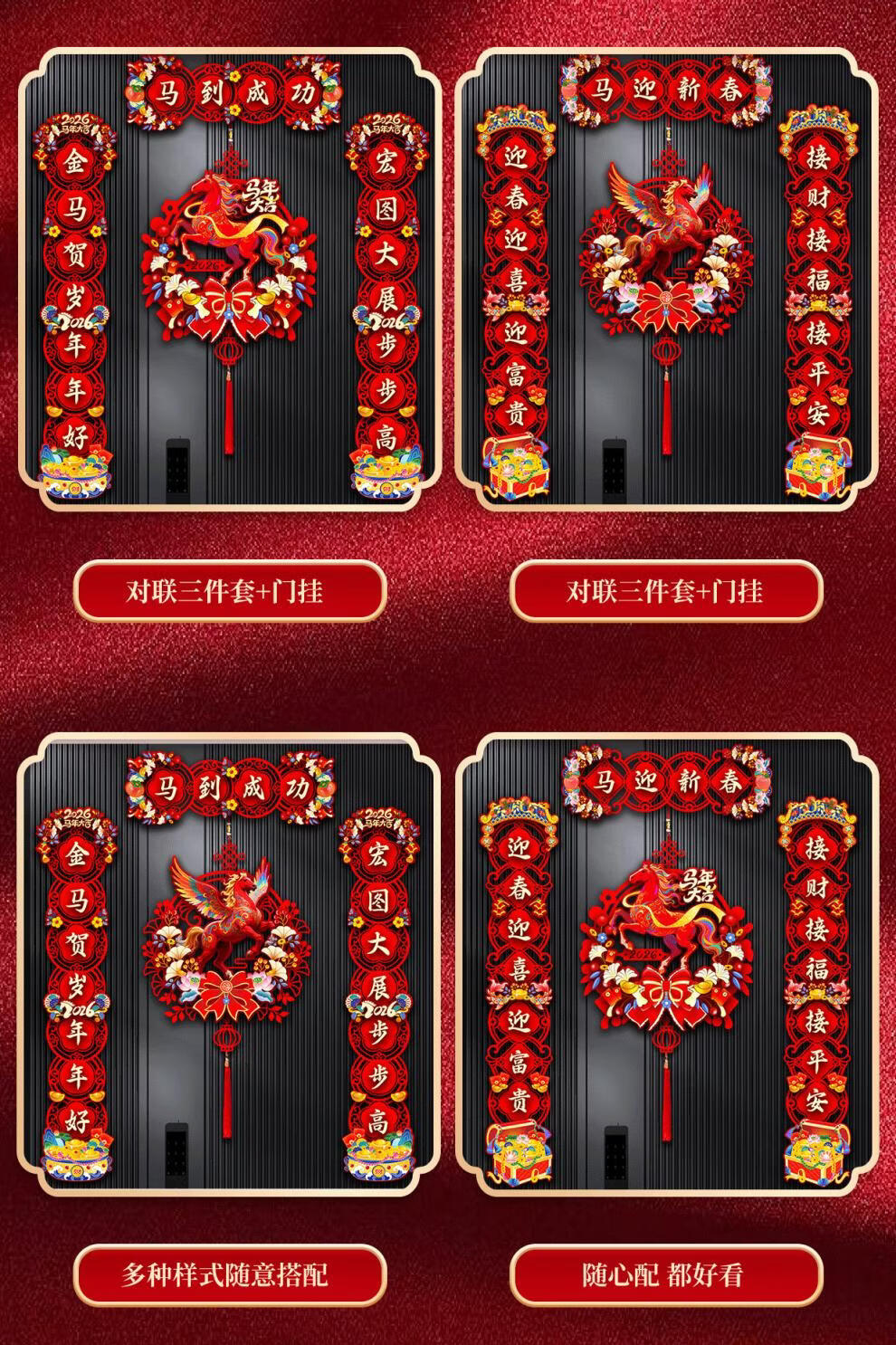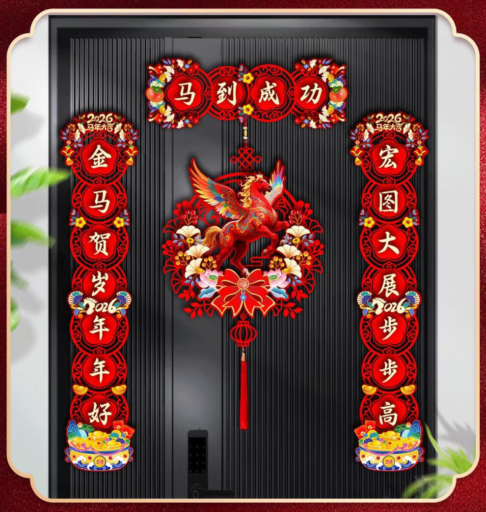 古慕妮与辉同款磁吸对联2026马年新年春联家用春节过年福字门贴布置装饰 马到成功对联+新年快乐挂件+生肖贴 2026年新年新款[送磁吸贴片+双面胶]