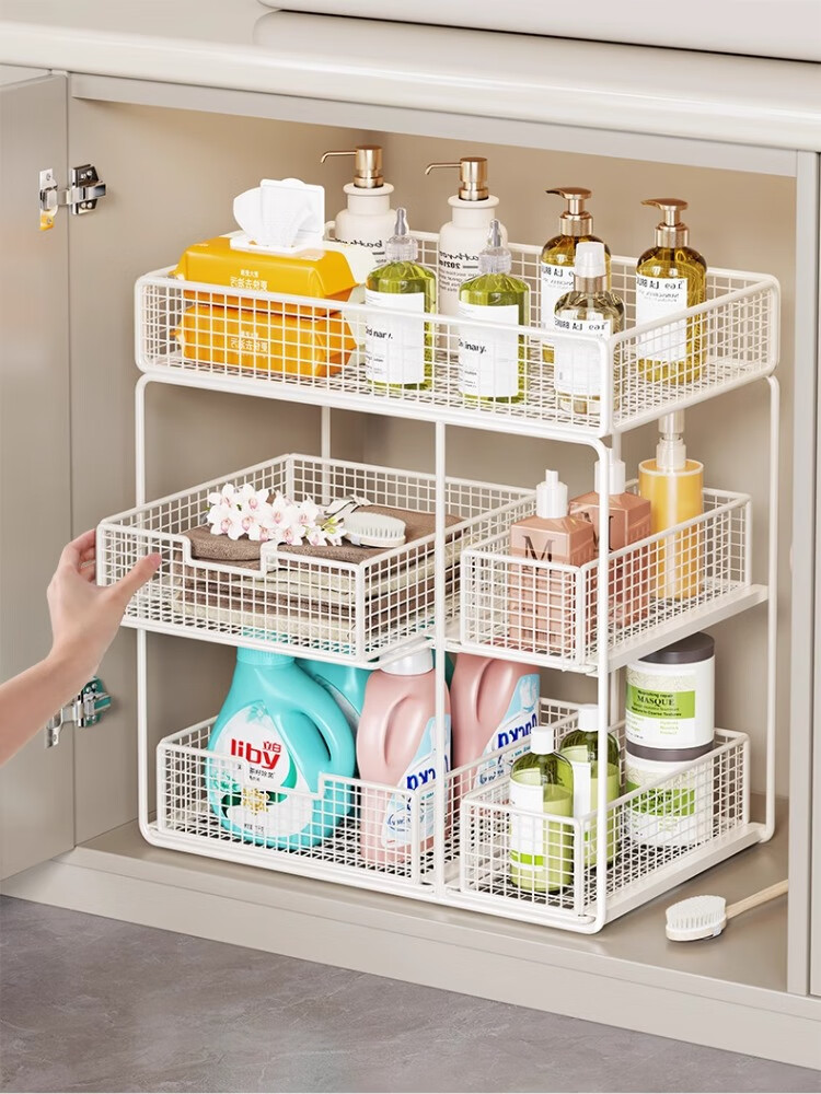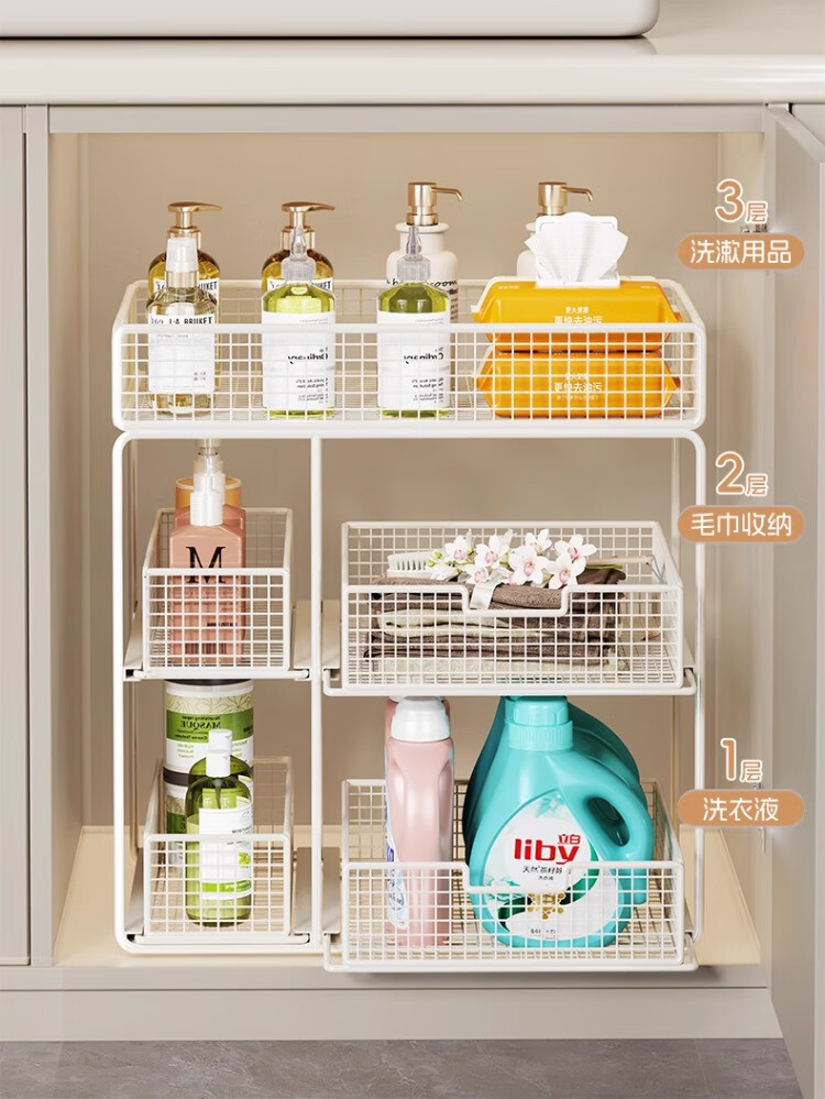尔思家卫生间置物架多层收纳架下水槽浴室柜内可抽拉洗手台多功能分层架 白色超值款