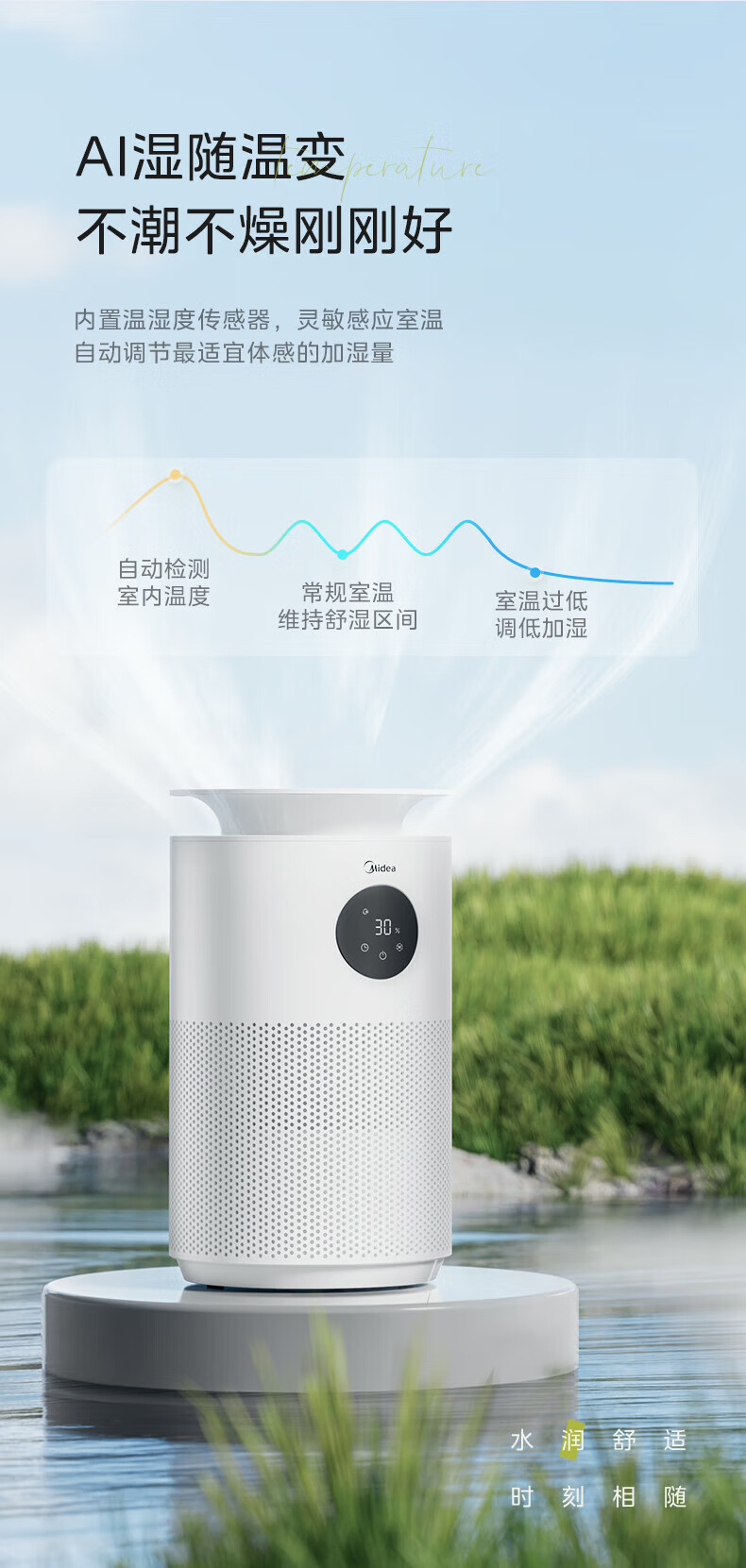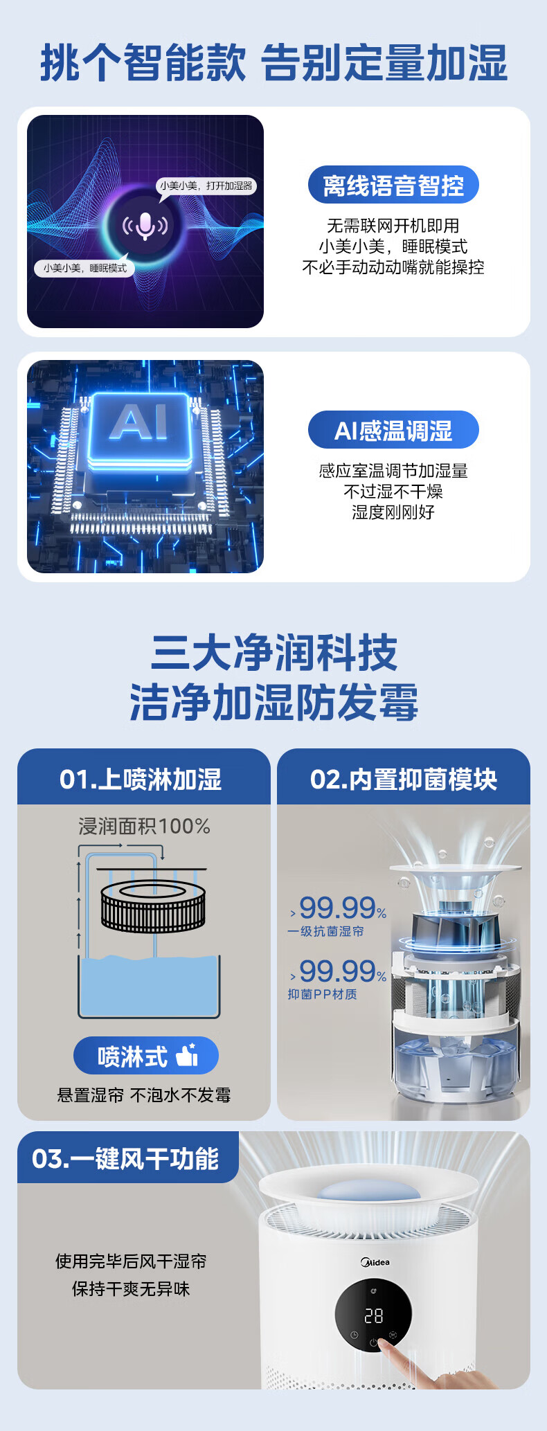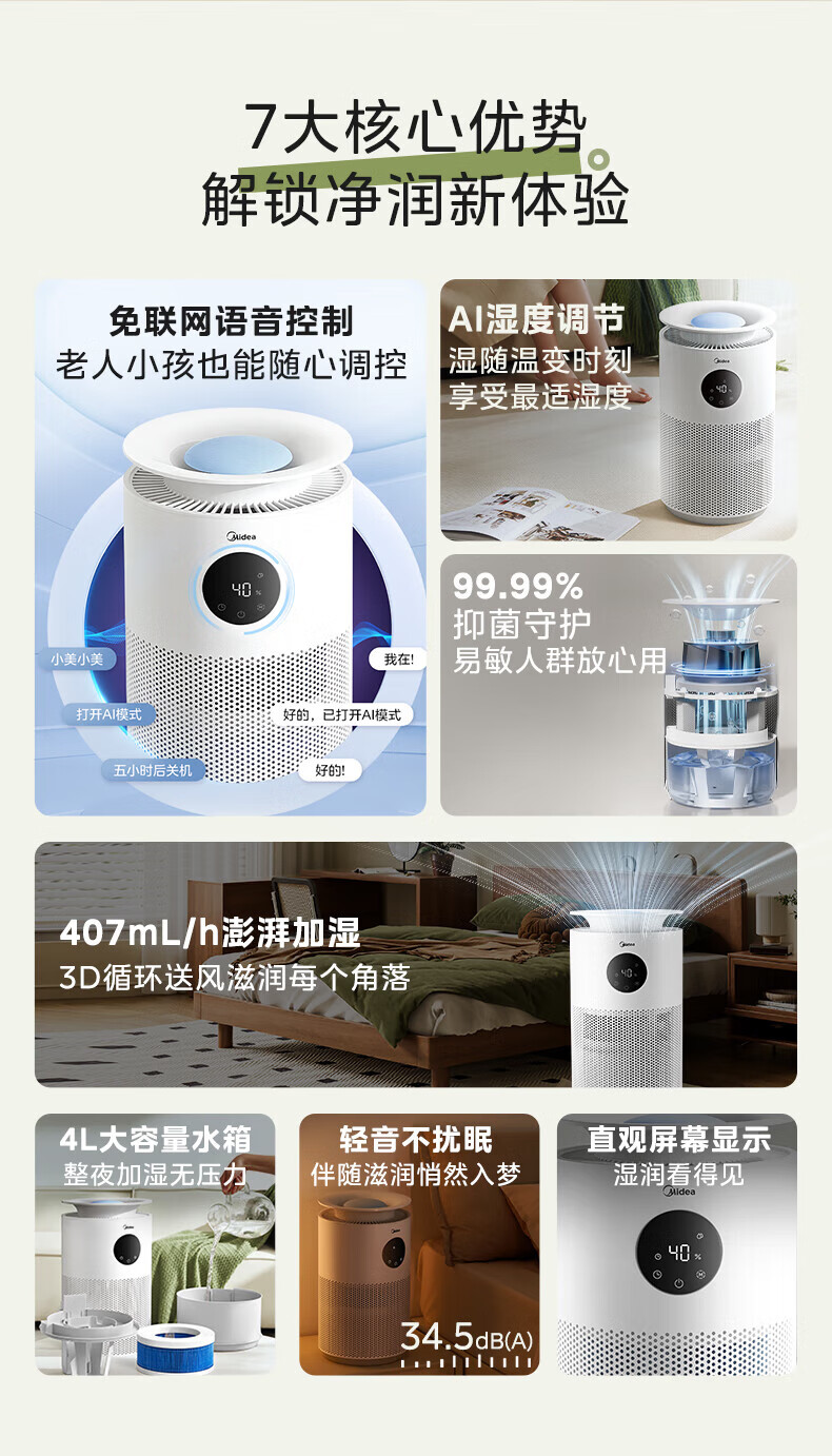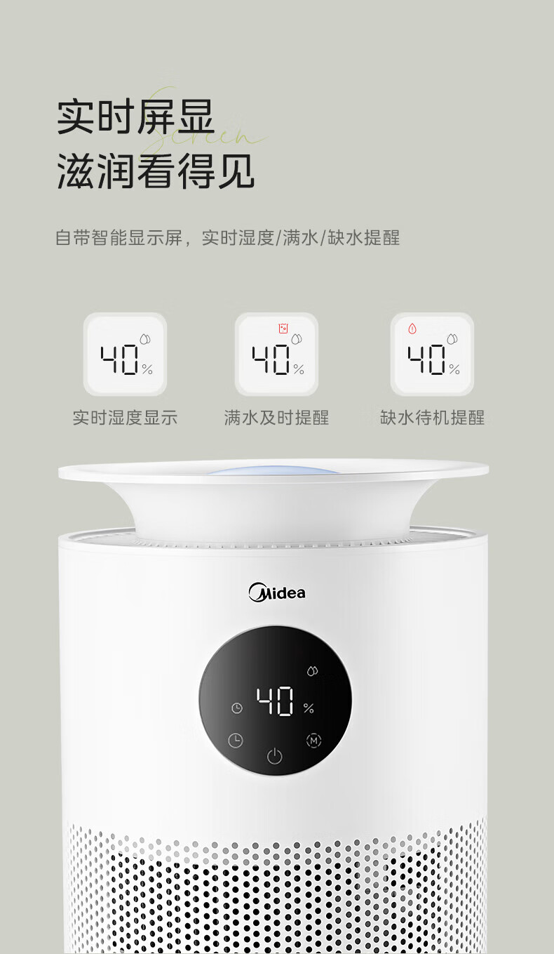 美的(Midea)【AI智能语音】无雾加湿器空气净化落地式冷蒸发雾化器静音母婴级专用礼物取暖降燥除菌SZY-W40S 【AI智能语音】