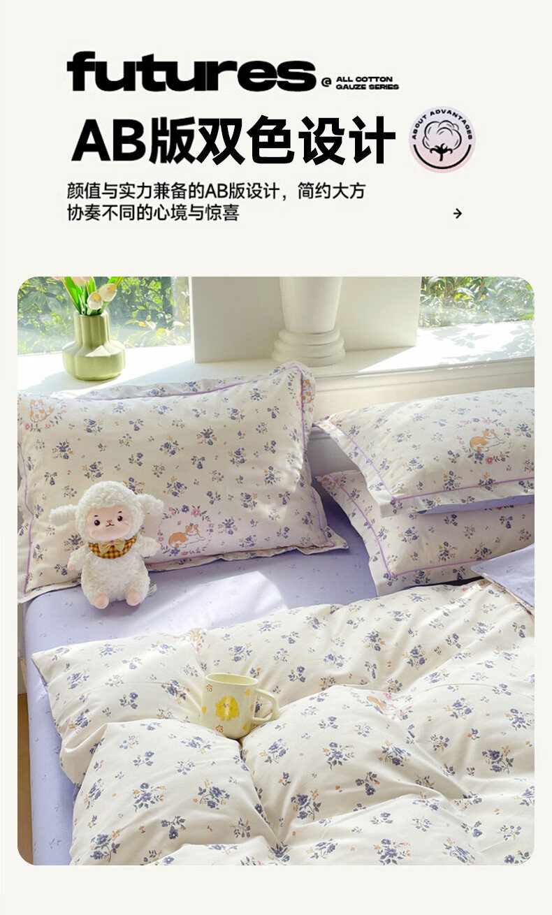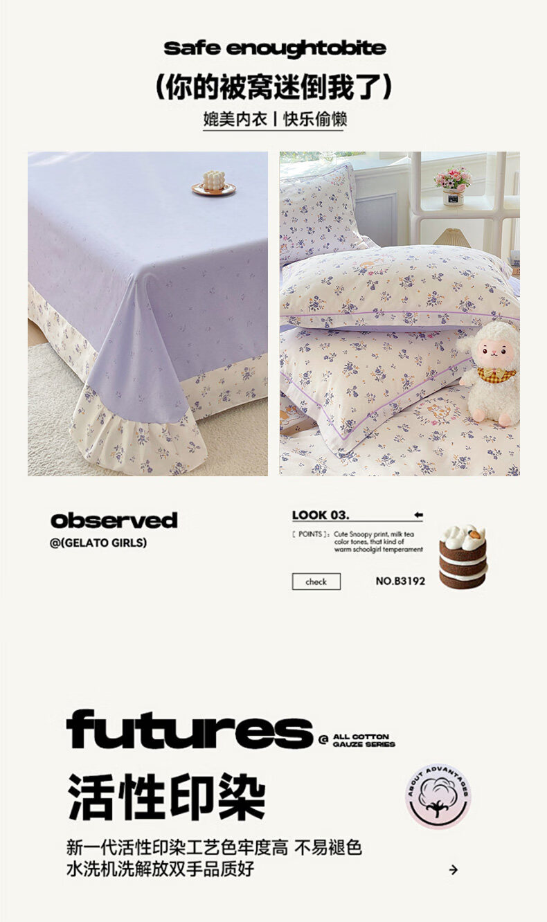 ROLAND LIVE简约风精梳棉色织双层纱四件套亲肤裸睡1.8米床被套床单床上用品 YB 色织双层纱四件套-青岚粉芭乐 1.8米床 床单款 【被套200*230cm】