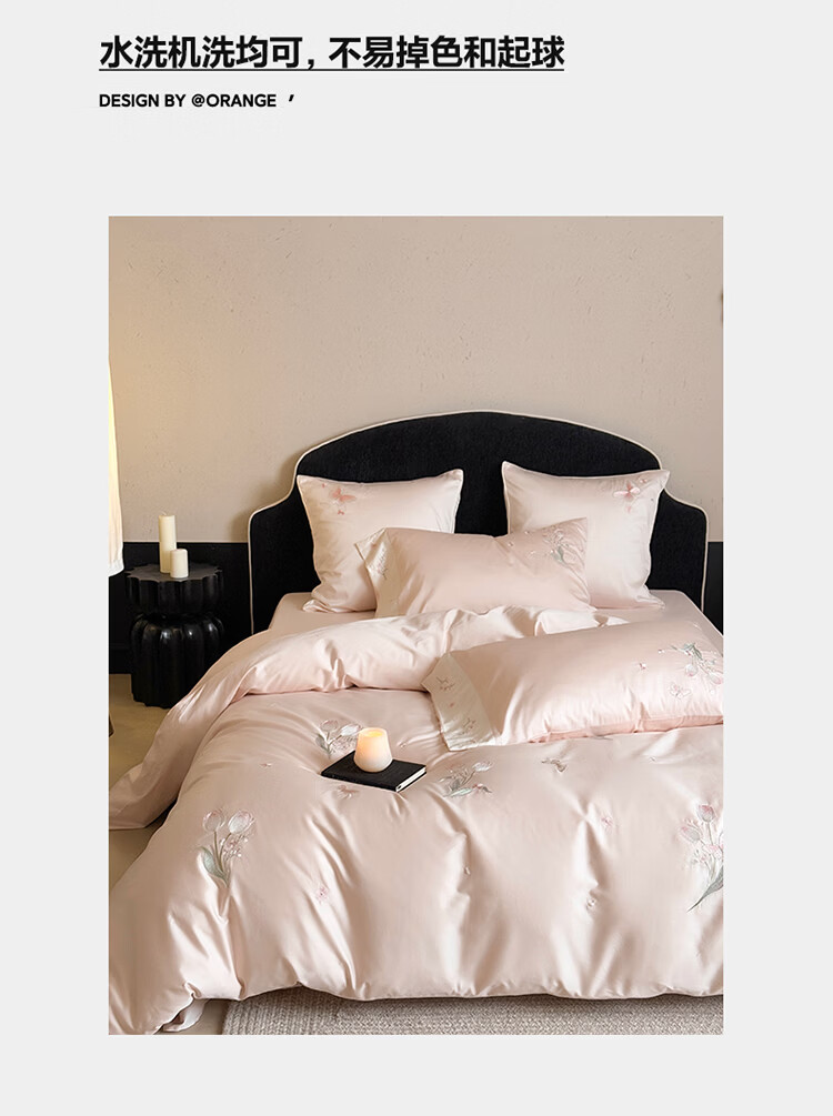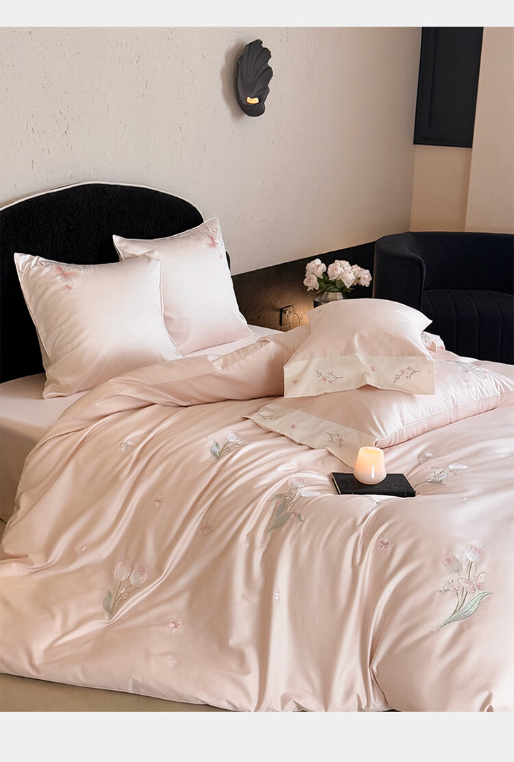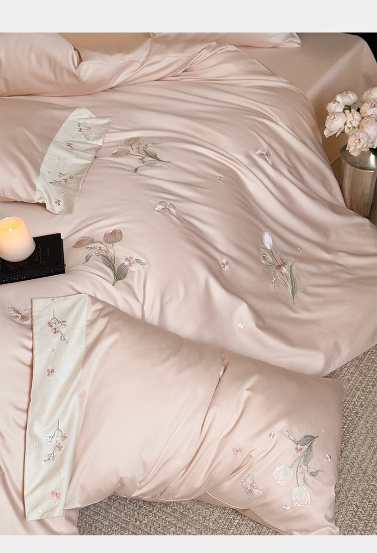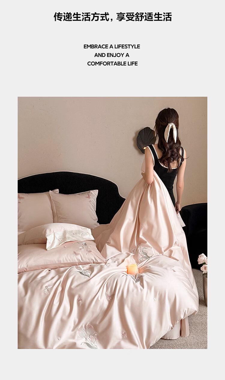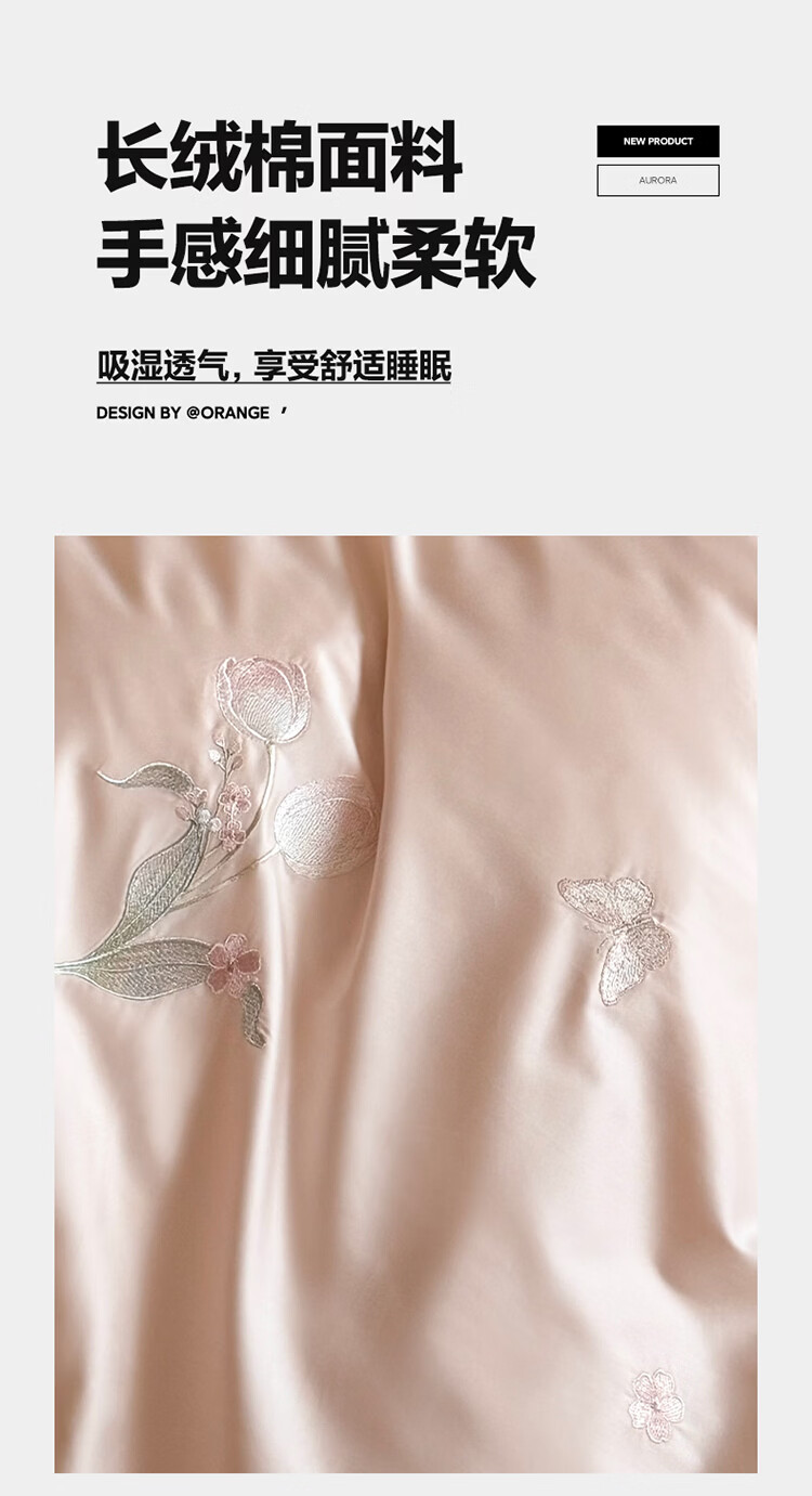 ROLAND LIVE长绒棉绣花四件套轻奢风被套床单全棉卧室三件套透气四季春季套件 LB 长绒棉套件-悦己如花粉色 2.0米床 床单款 【被套220*240cm】