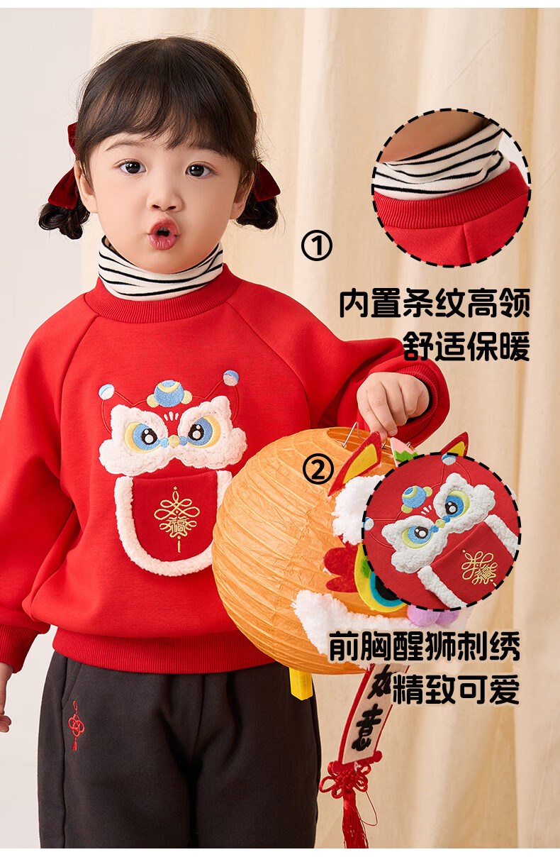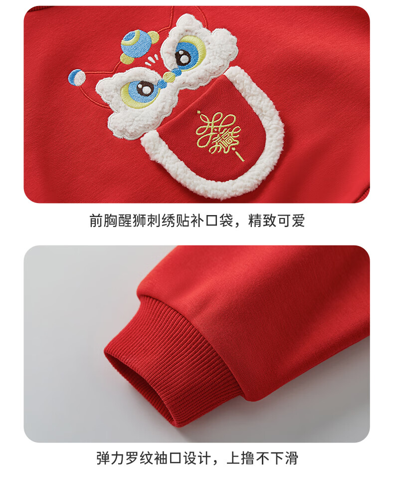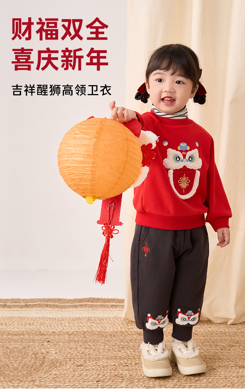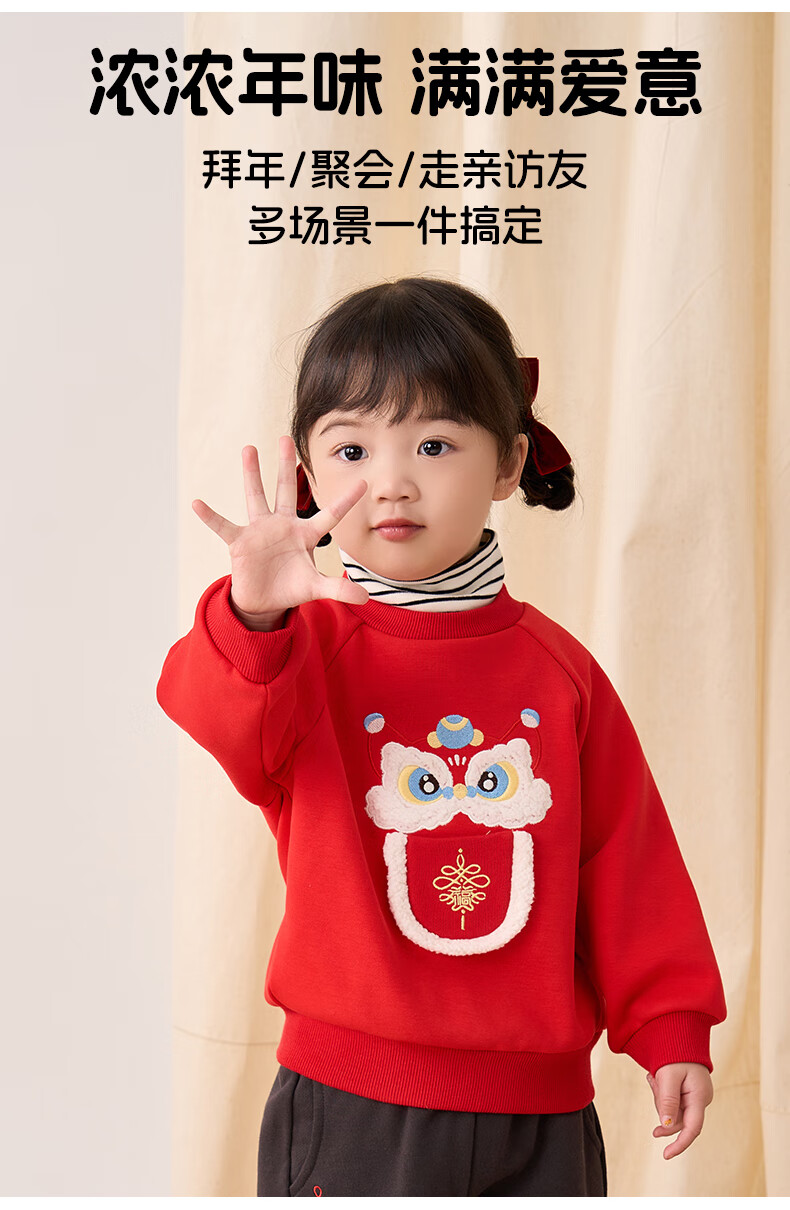 博睿恩(Pureborn)男女宝宝新年卫衣秋冬新款婴童加绒保暖醒狮女孩拜年服 爆竹红 120