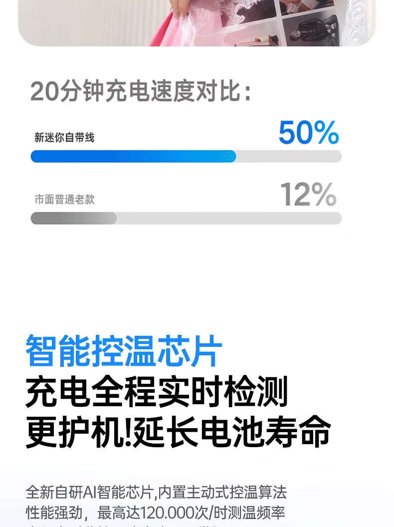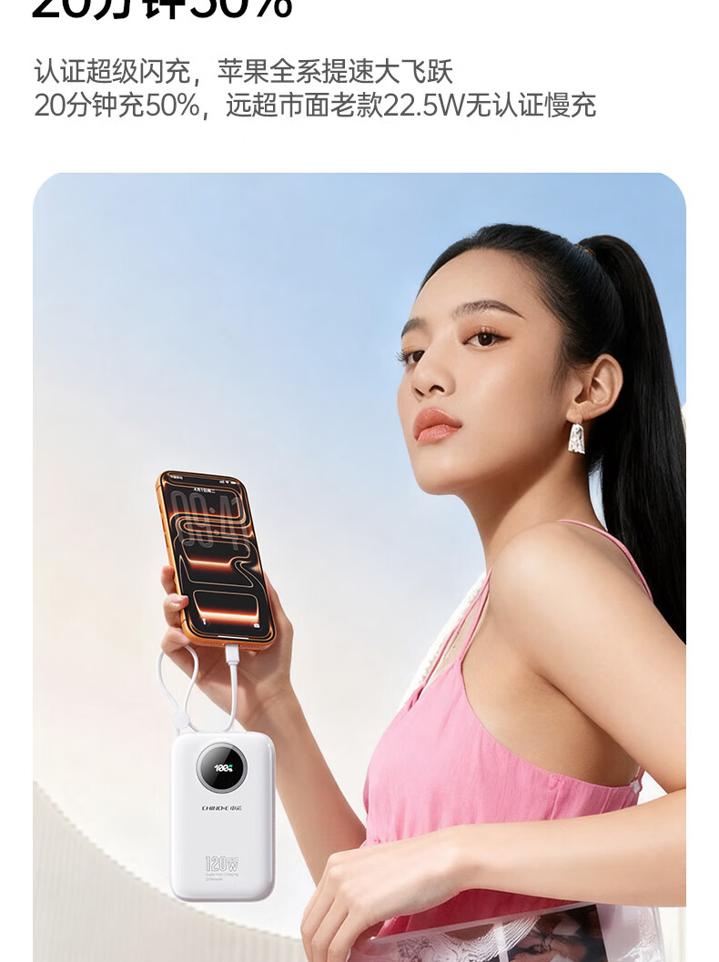 倍特源【3c认证丨顶配20000M】自带线充电宝大容量小巧便移动电源快充适用小米苹果安卓手机可上飞机高铁 粉色【自带线+国产电芯】3c认证丨可上飞机