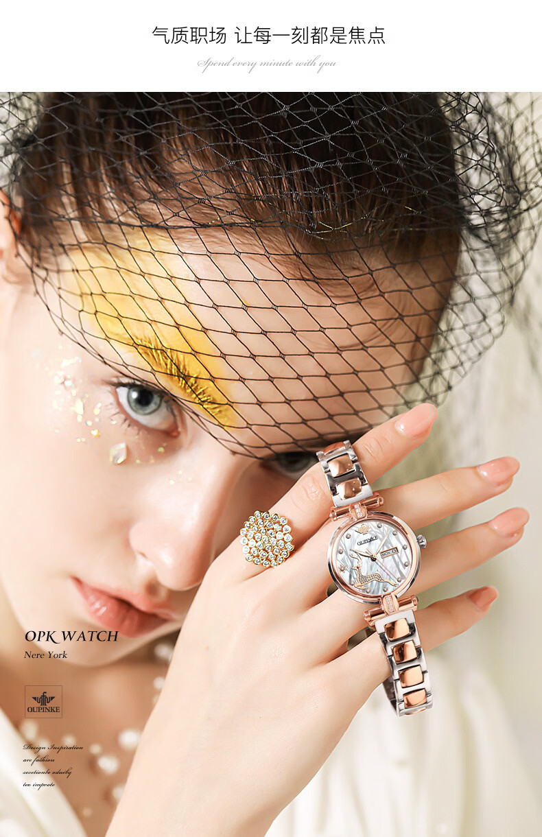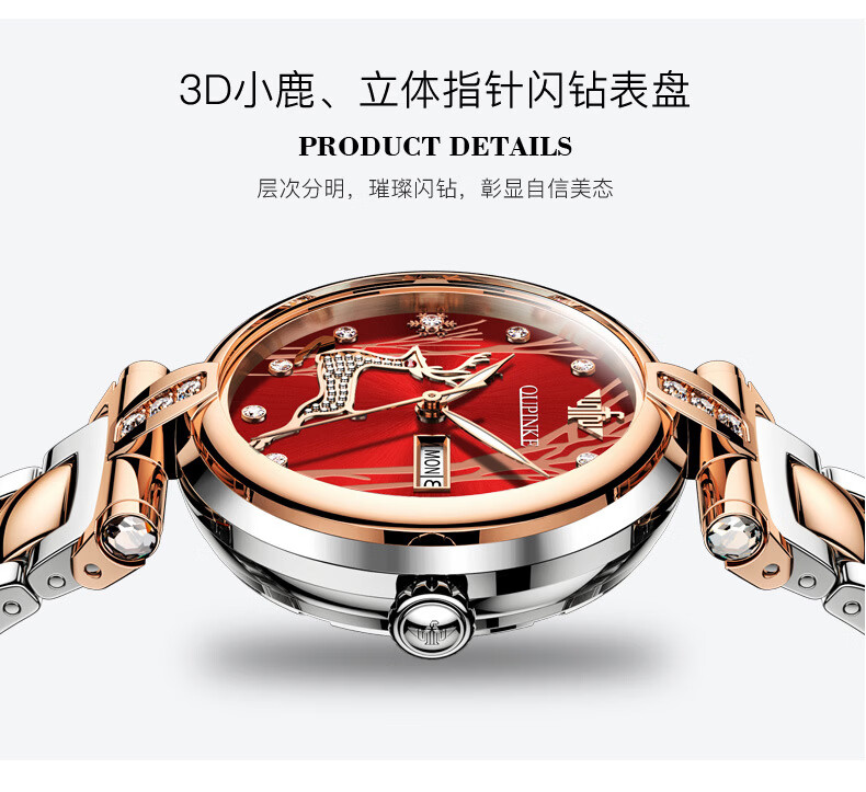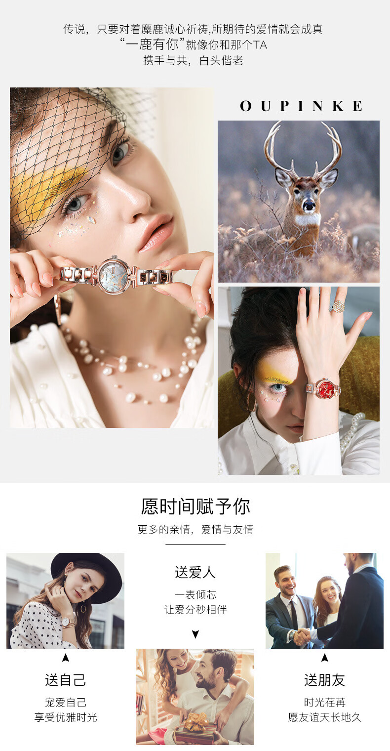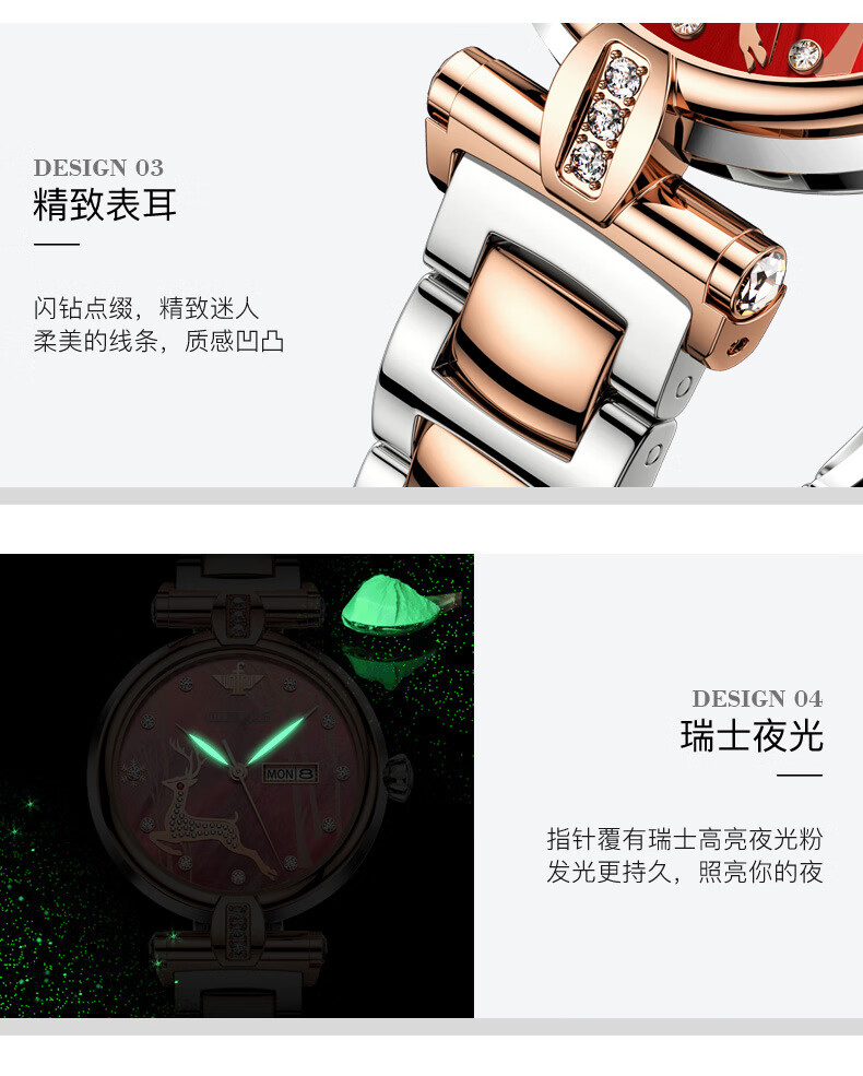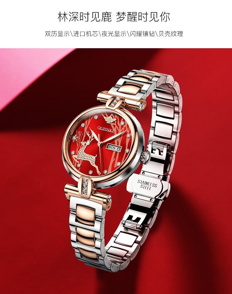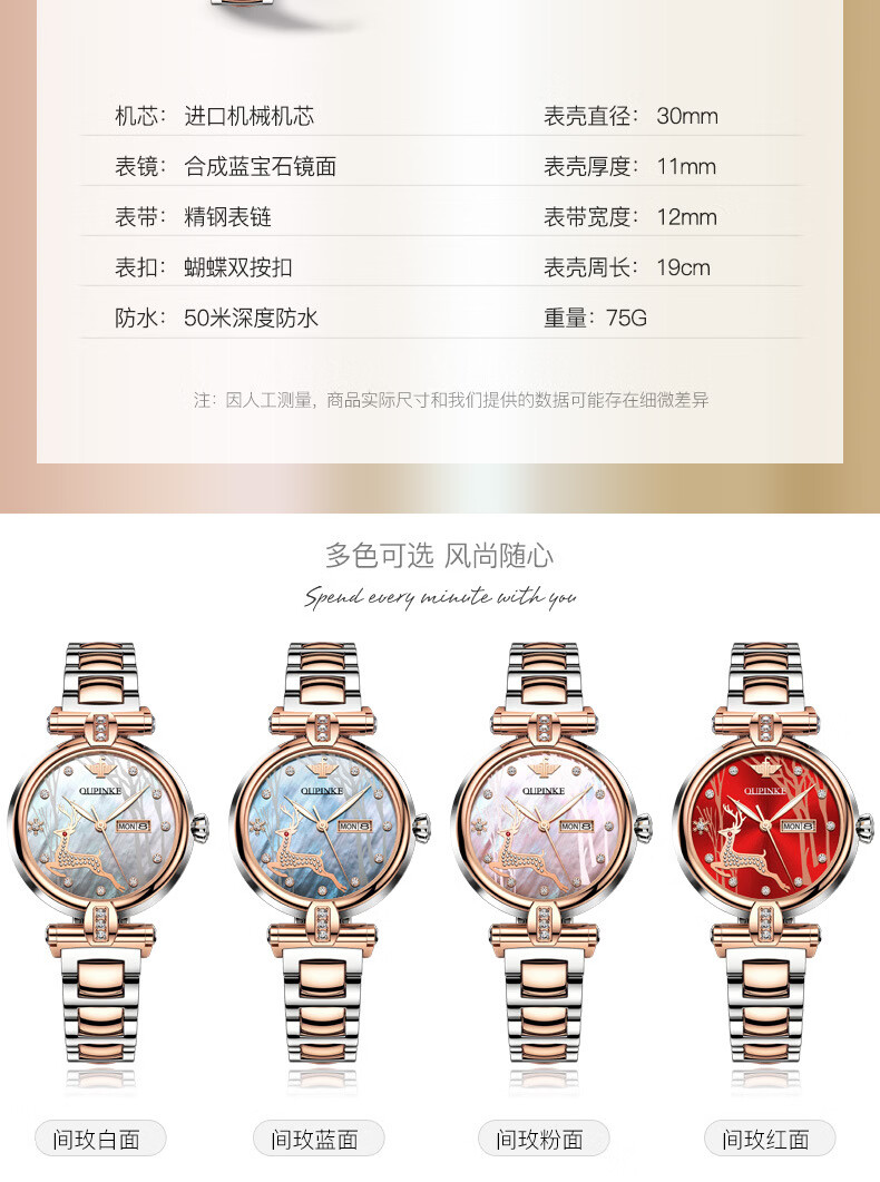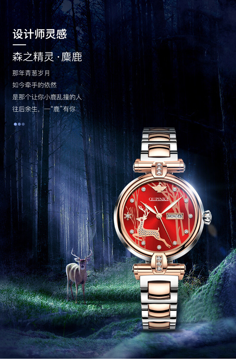 欧品客瑞士认证品牌全自动机械表女时尚潮流防水鹿图女士女表腕表 钢带间玫白面女