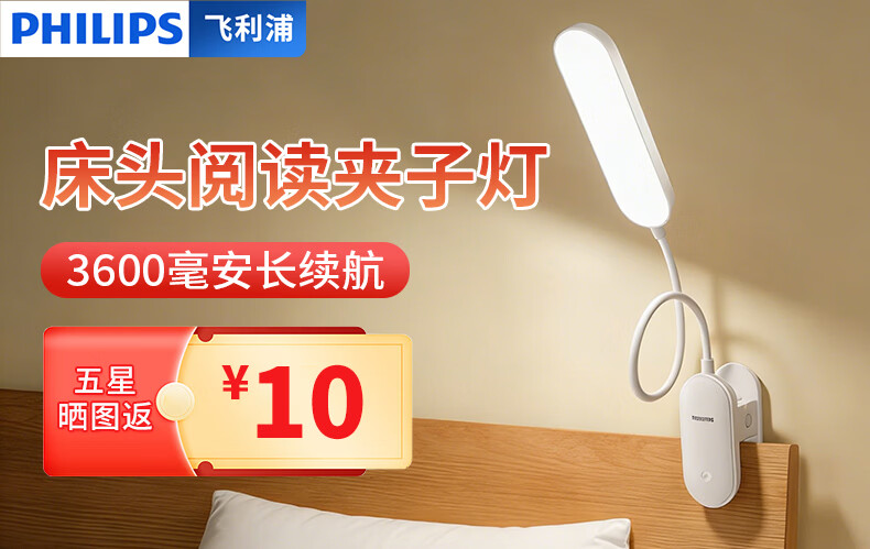 飞利浦夹子护眼台灯 led儿童卧室床头宿舍书桌学生学习充电式家用床头灯 【线+插头】3600毫安/充插两用 【无蓝光危害】【无可视频闪】