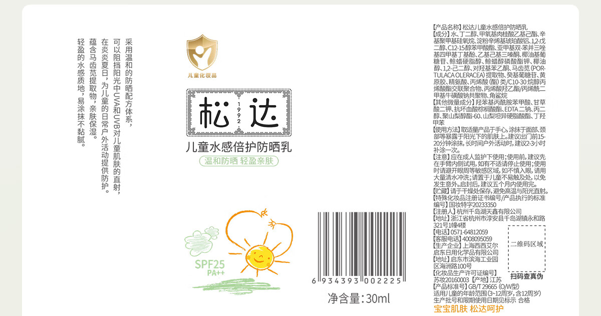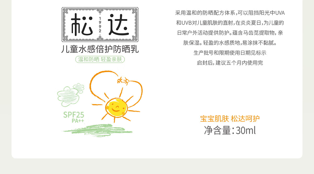 松达儿童防晒霜面部防晒大分子学生军训防晒宝宝婴幼儿保湿面霜30ml