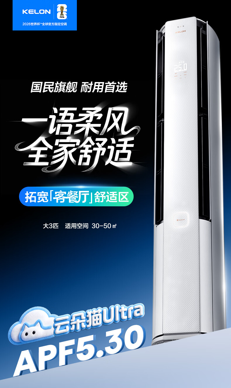 科龙空调3匹 海信出品 云朵猫Ultra 世界杯定制空调智能语音新一级立式变频柜机KFR-72LW/QS1Ultra-X1