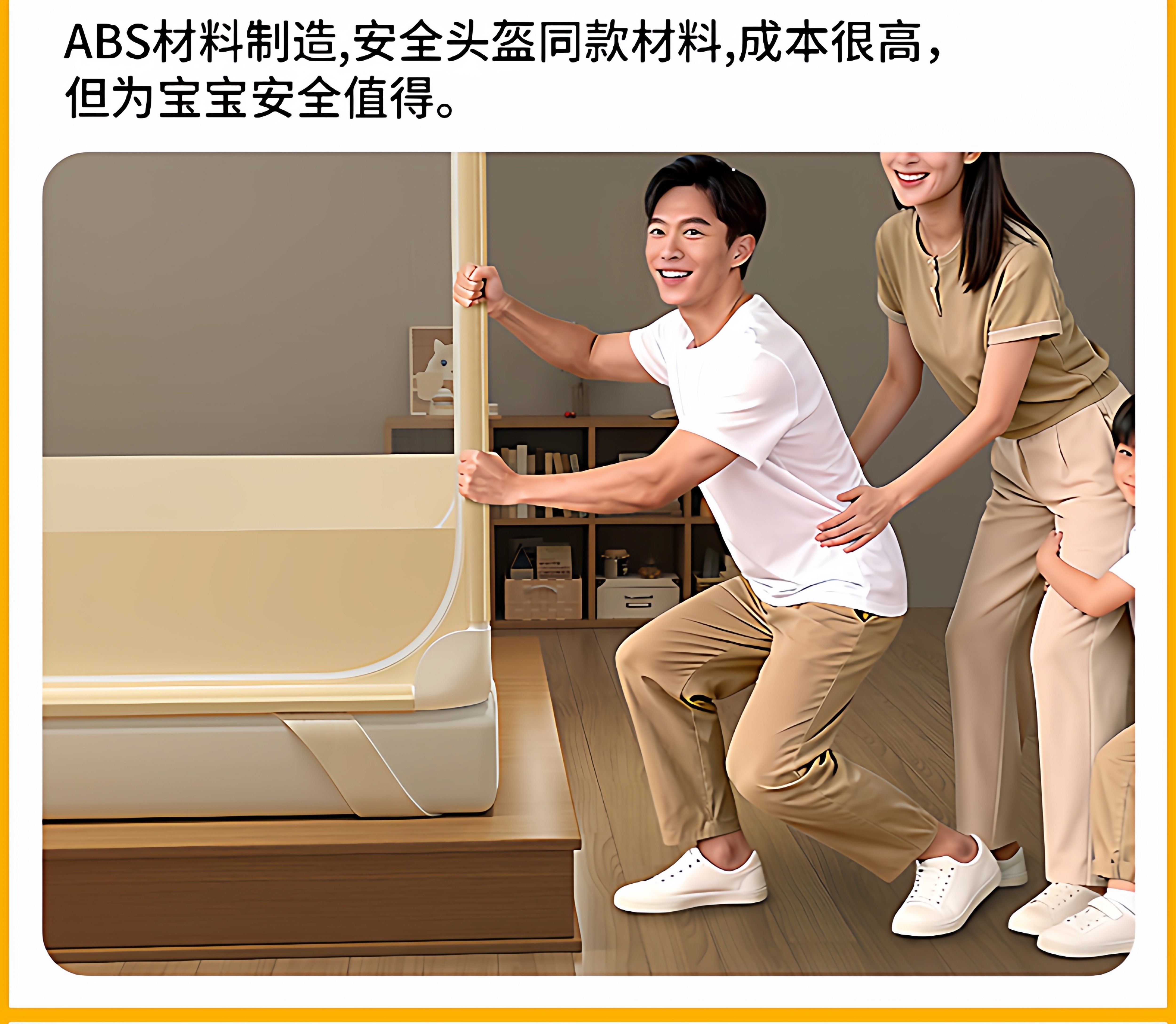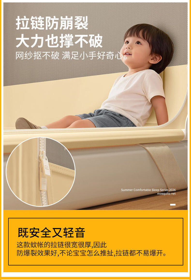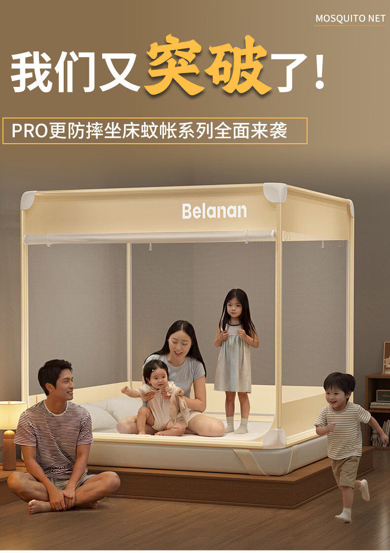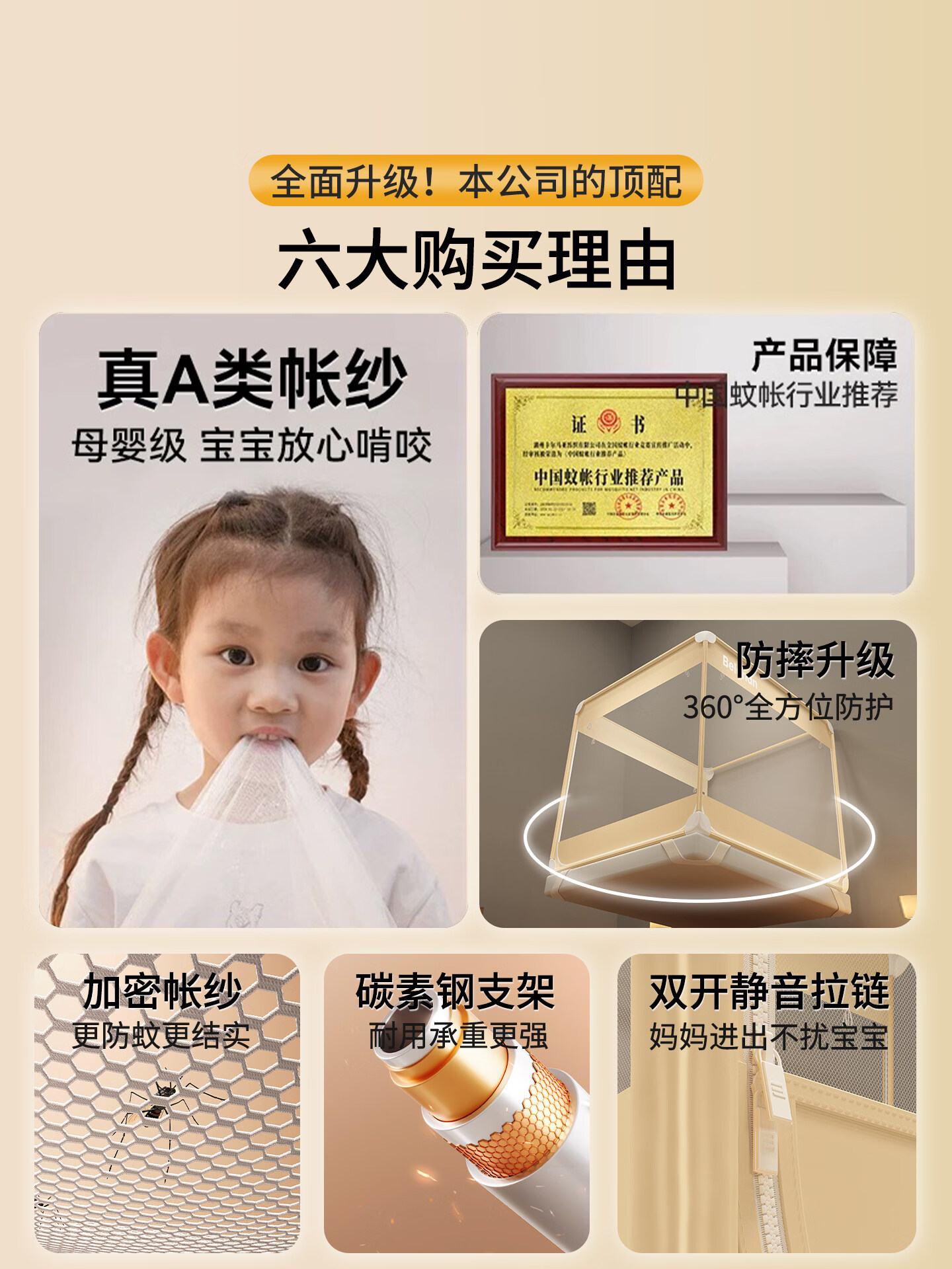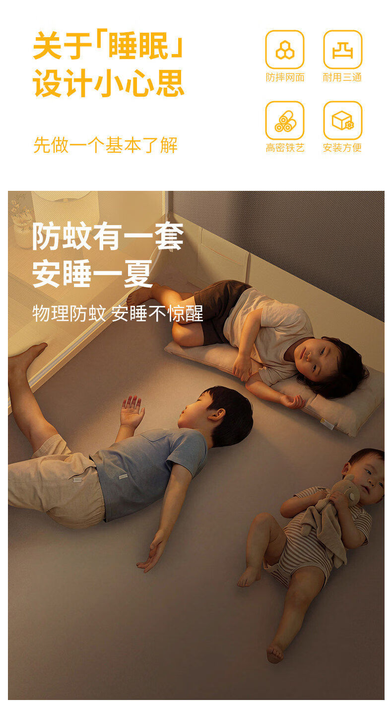 猫人(MiiOW)A类母婴儿防摔蚊帐1.8x2米家用一体式免安装床围栏加粗加厚带支架 max-米色【加固防护宝宝安全】加粗35%支架 【适用1.8x2.0m床】真防摔免拼接支架