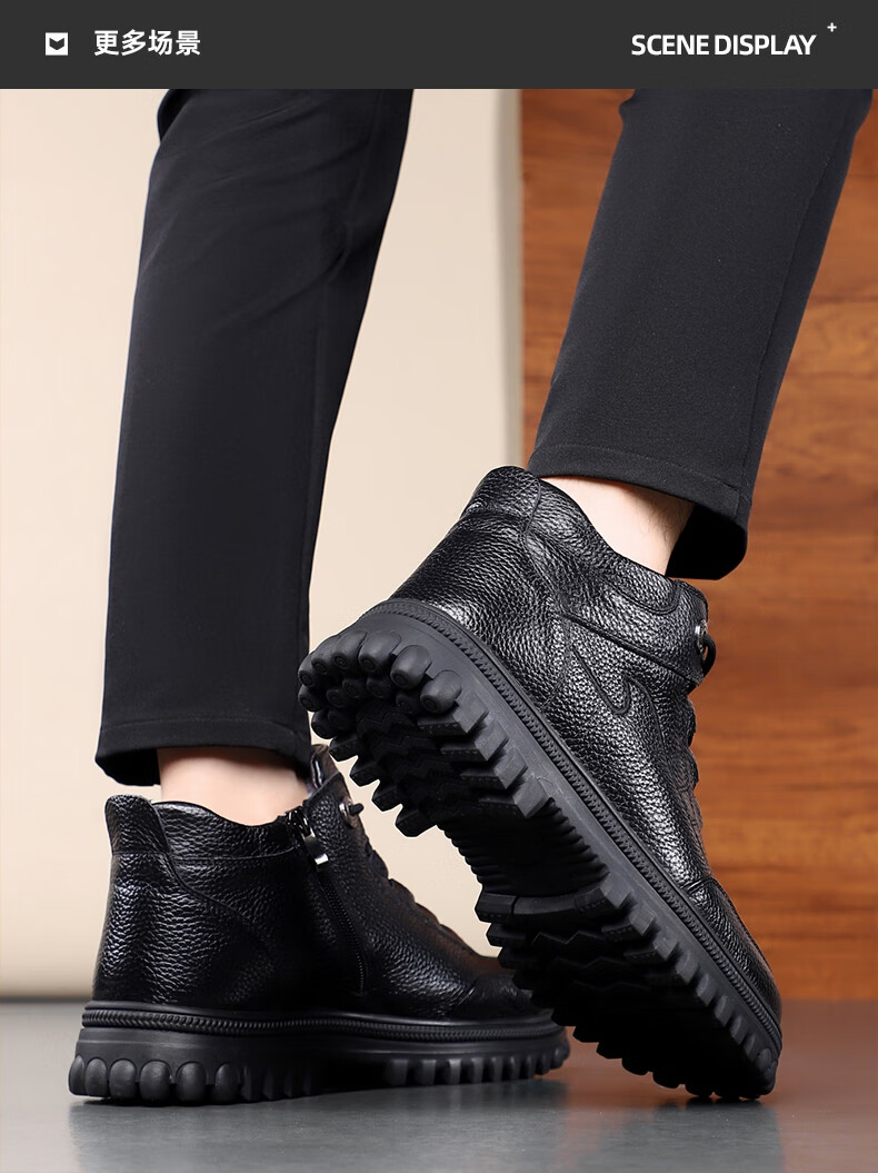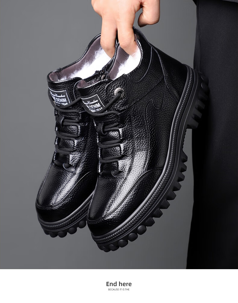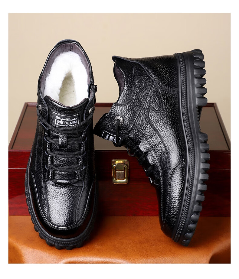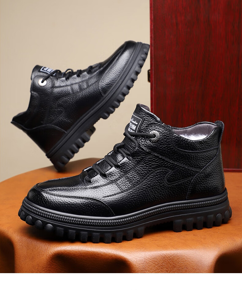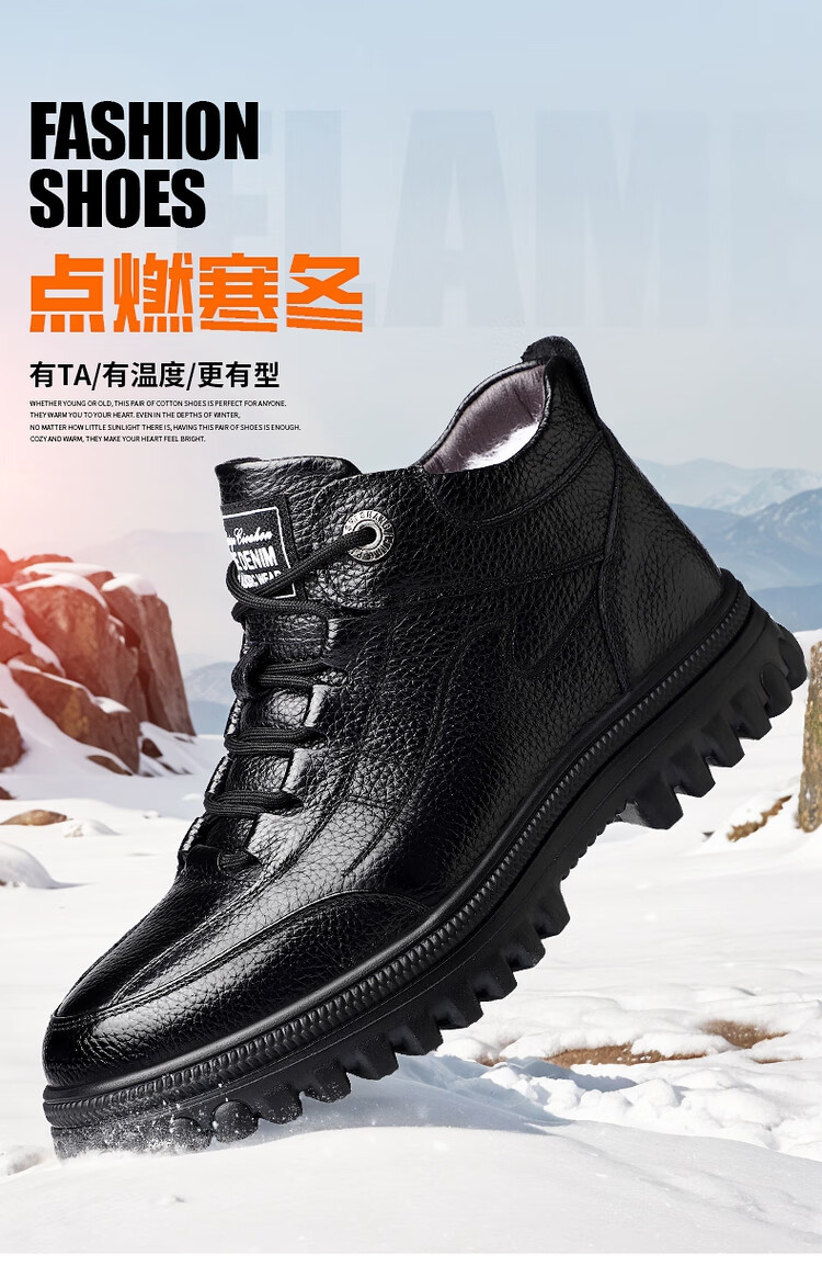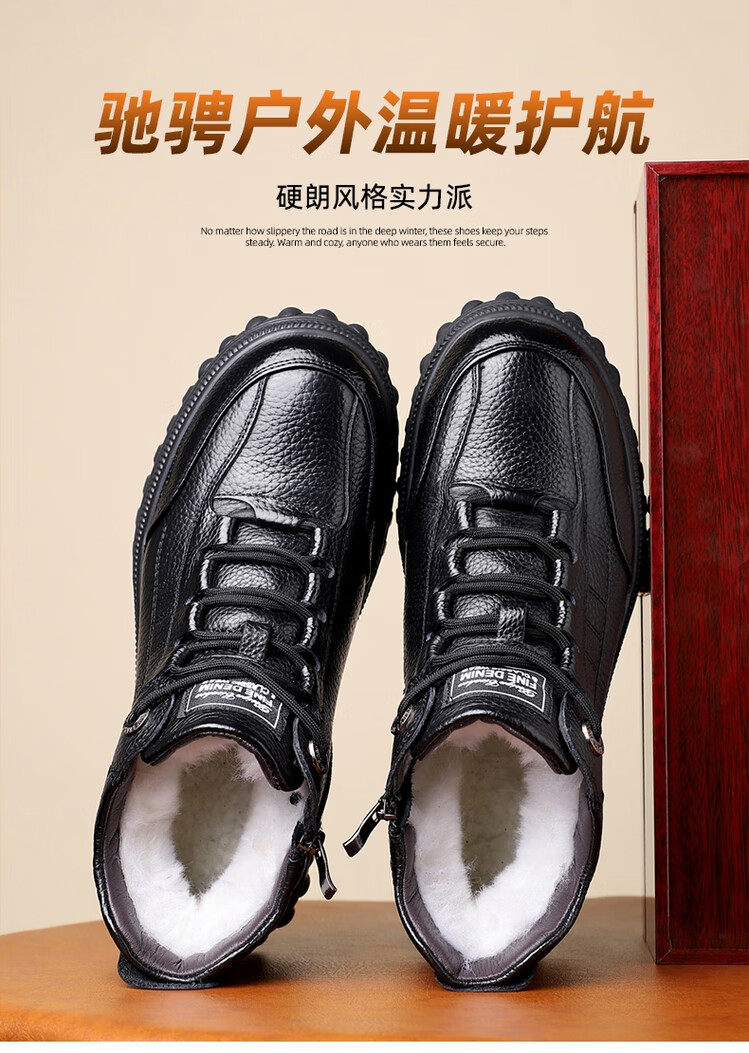稻草人(MEXICAN)头层牛皮纯羊毛雪地棉鞋男高帮加绒皮鞋保暖加厚冬鞋冬季中年爸爸 黑色 38