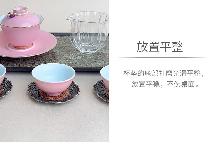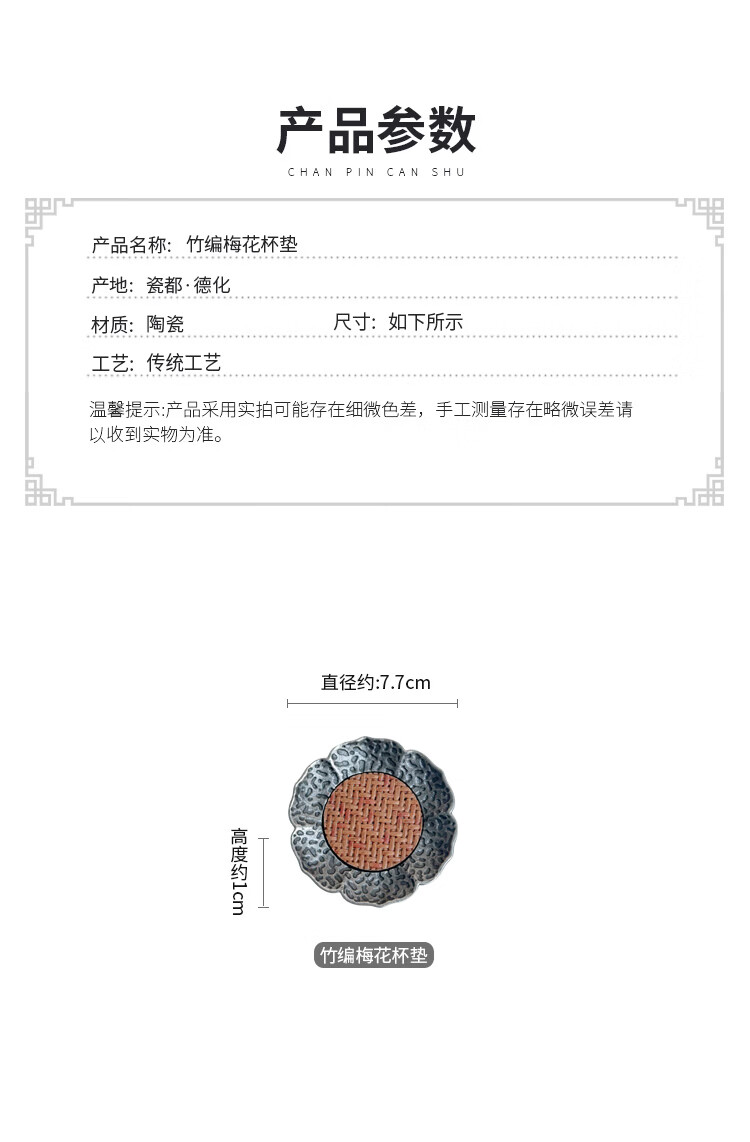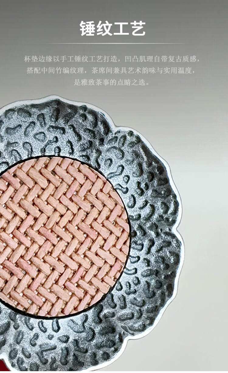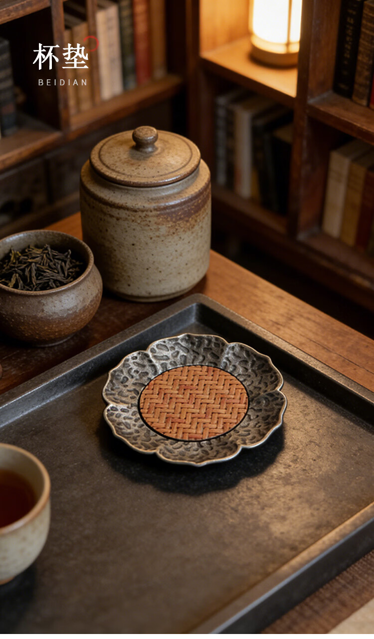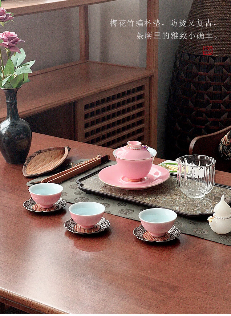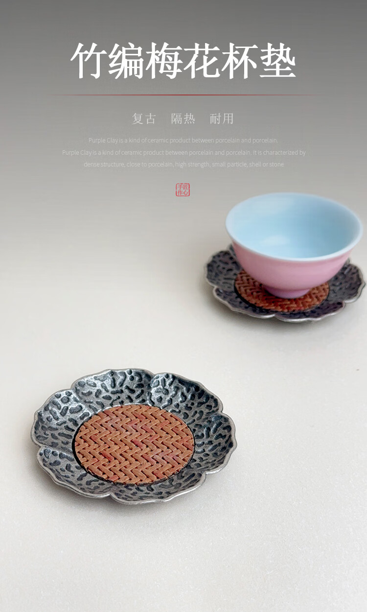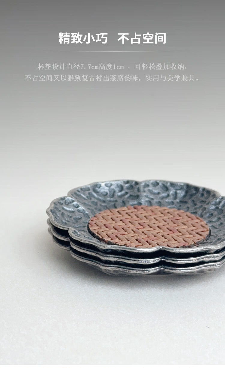 聚器堂复古合金竹藤茶杯垫防滑壶垫功夫茶杯托茶道隔热垫茶碟茶具配件 竹编梅花杯垫(3片组合)
