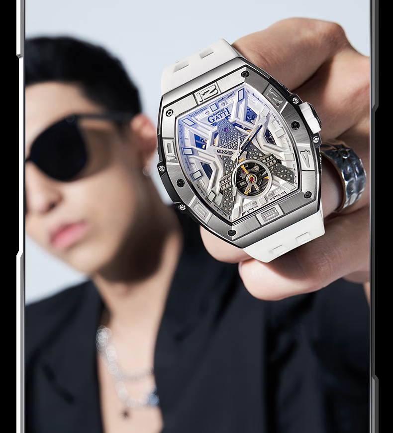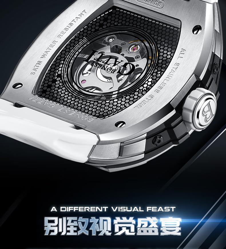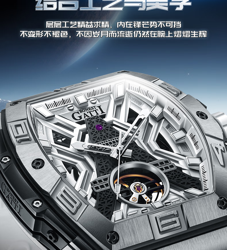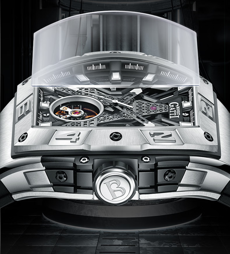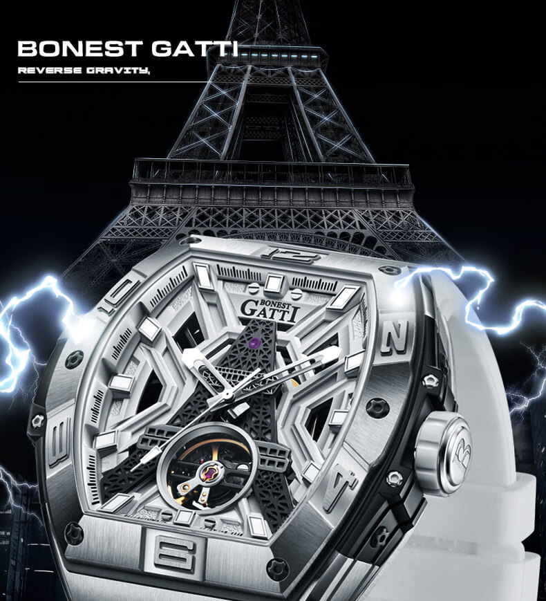布加迪(BONEST GATTI)德国水晶陀飞轮机械防水夜光运动男士镂空腕表情人节送男友礼物 BG7002-G1银壳白面玻璃带
