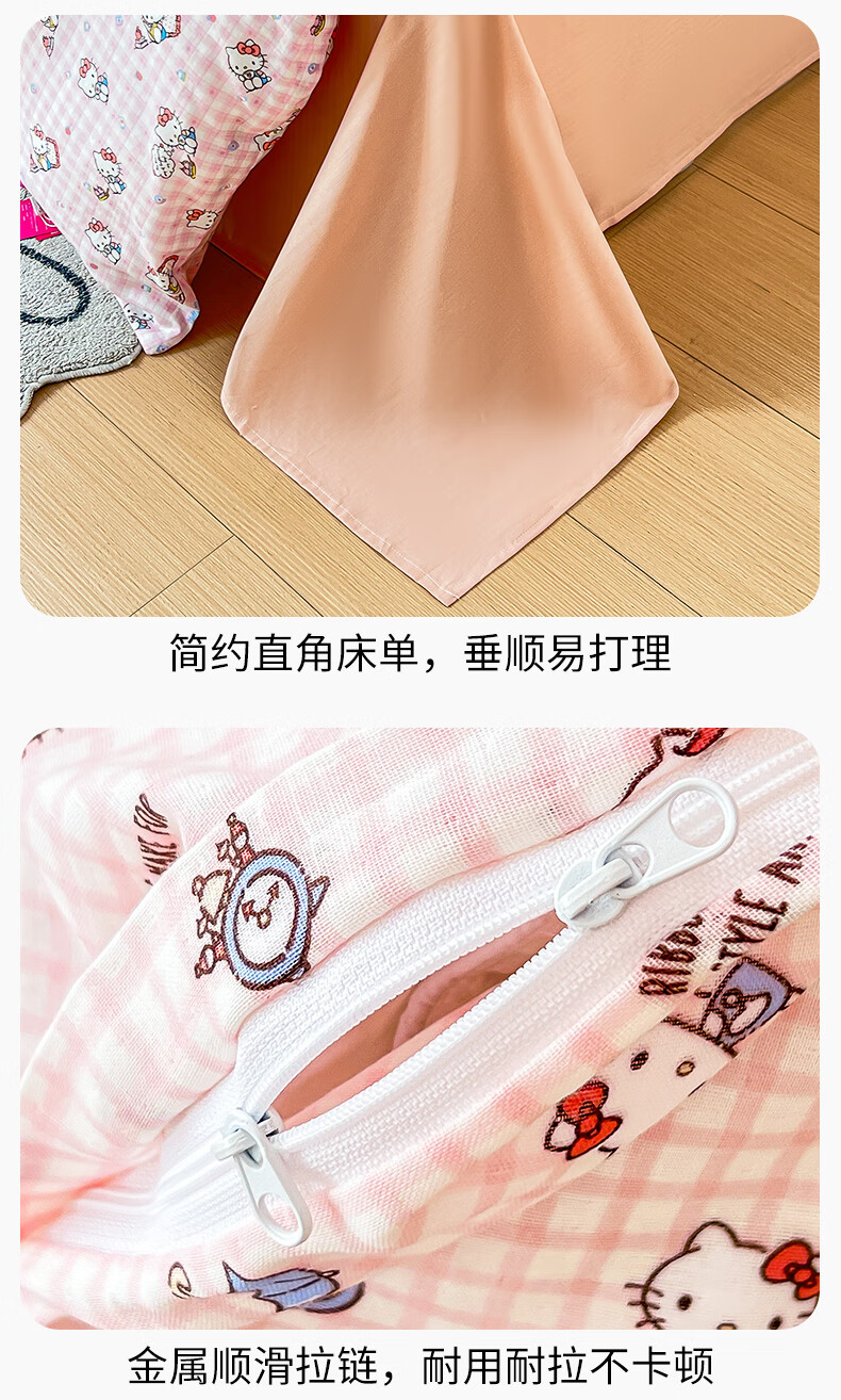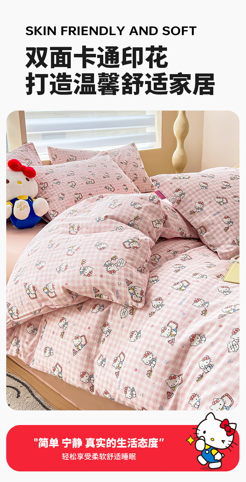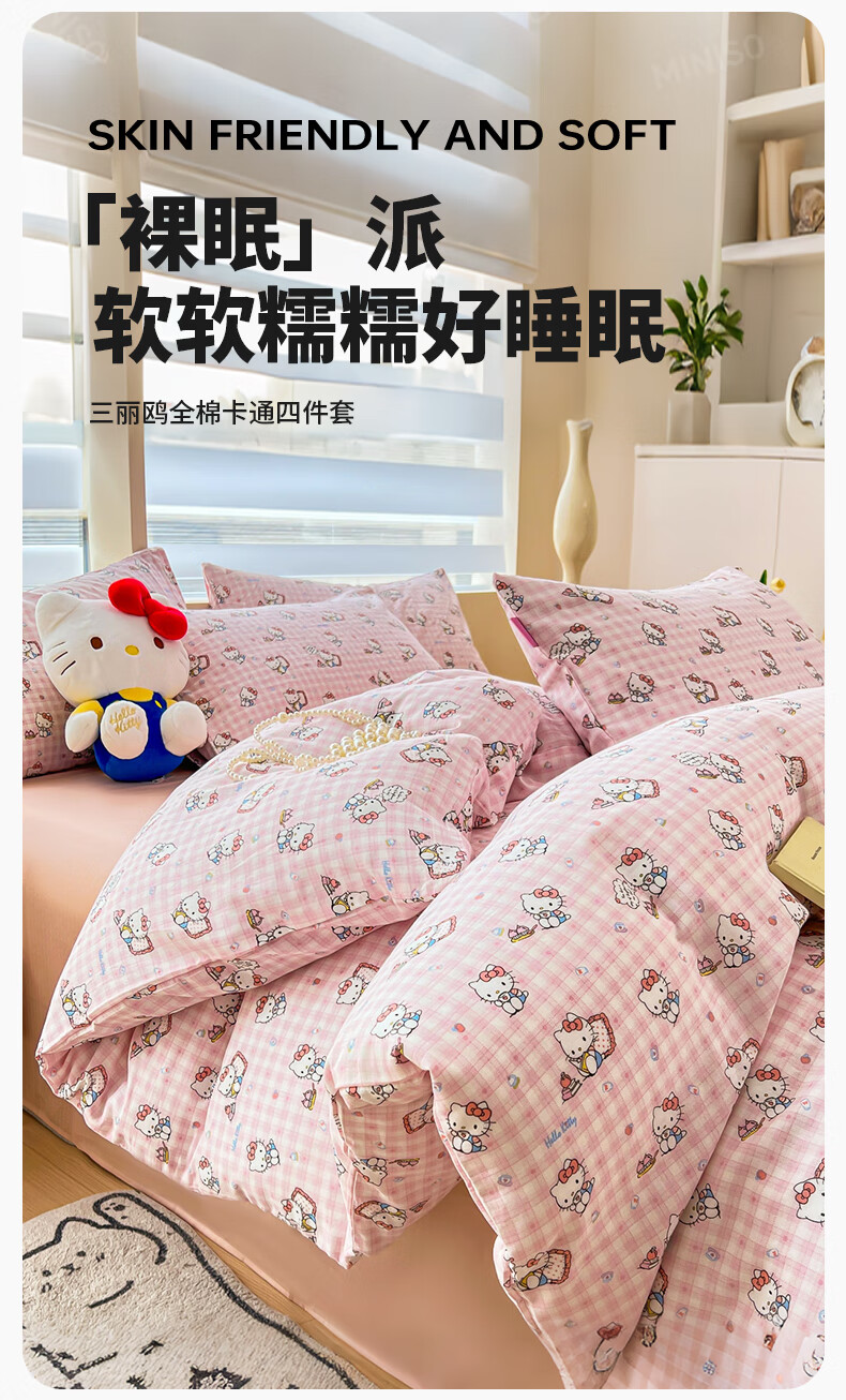 名创优品三丽鸥纯棉床上四件套 全棉床单被套罩床笠单双人学生宿舍床品 MINISO-悠闲午后粉 1.2 床单款 三件套(被套150*200cm)