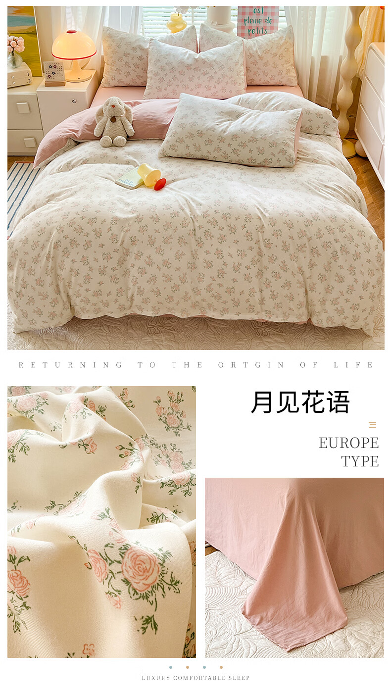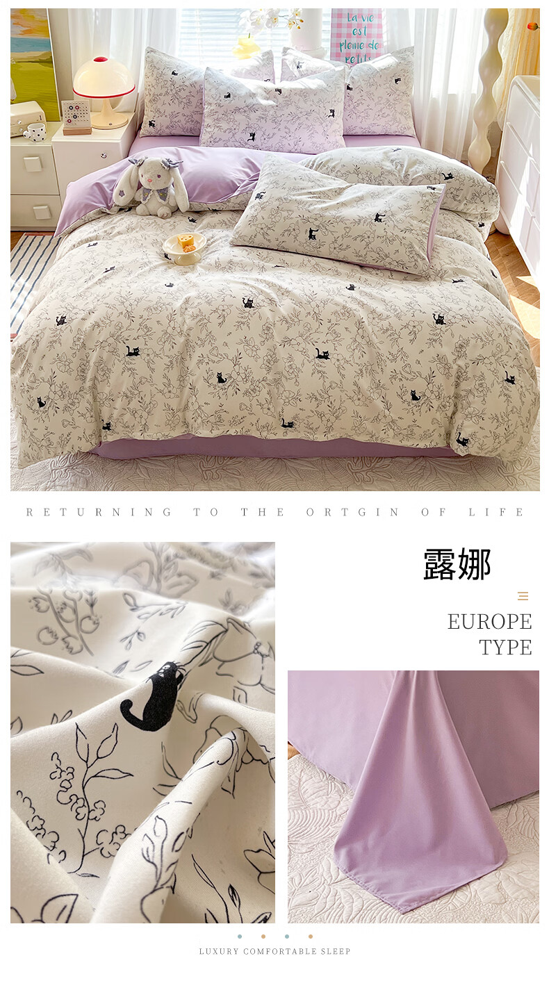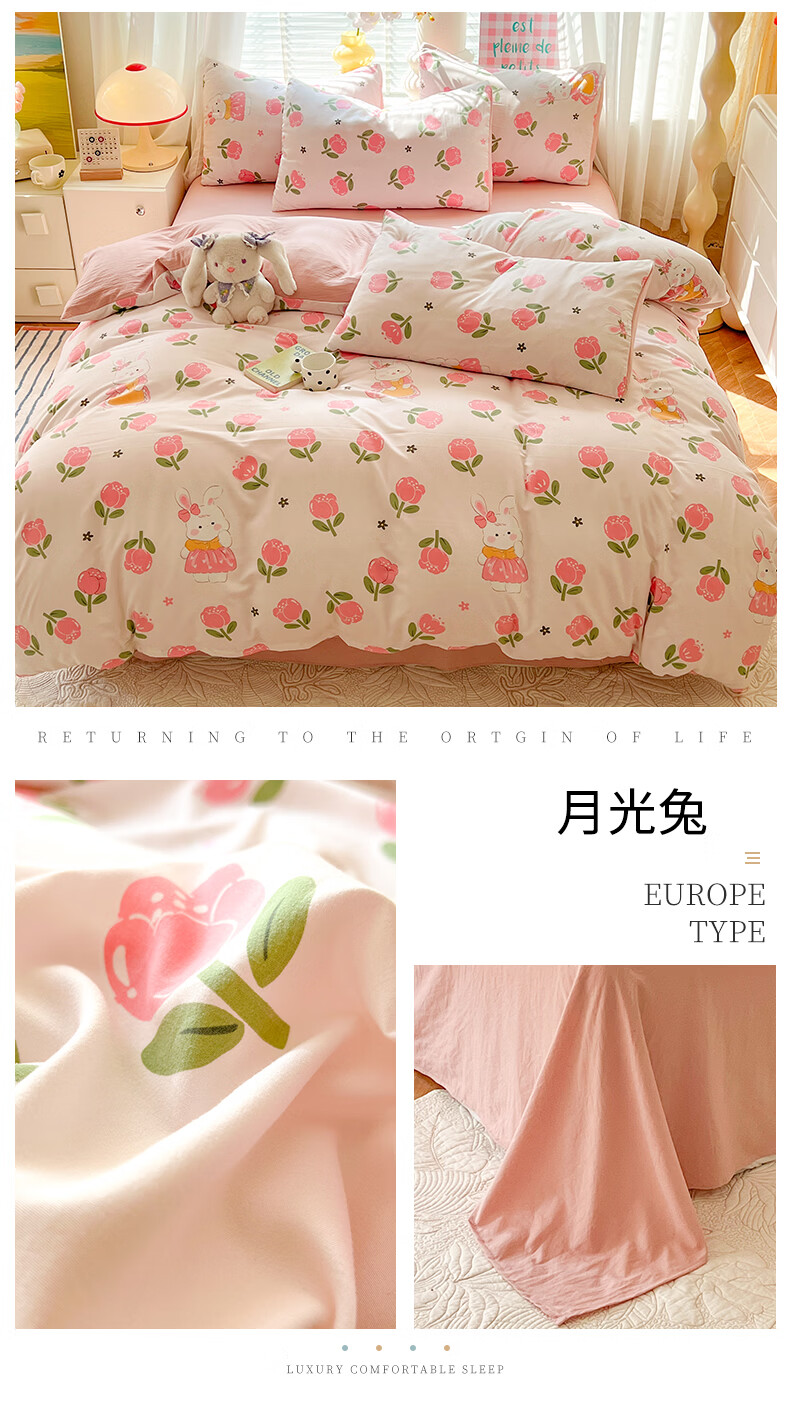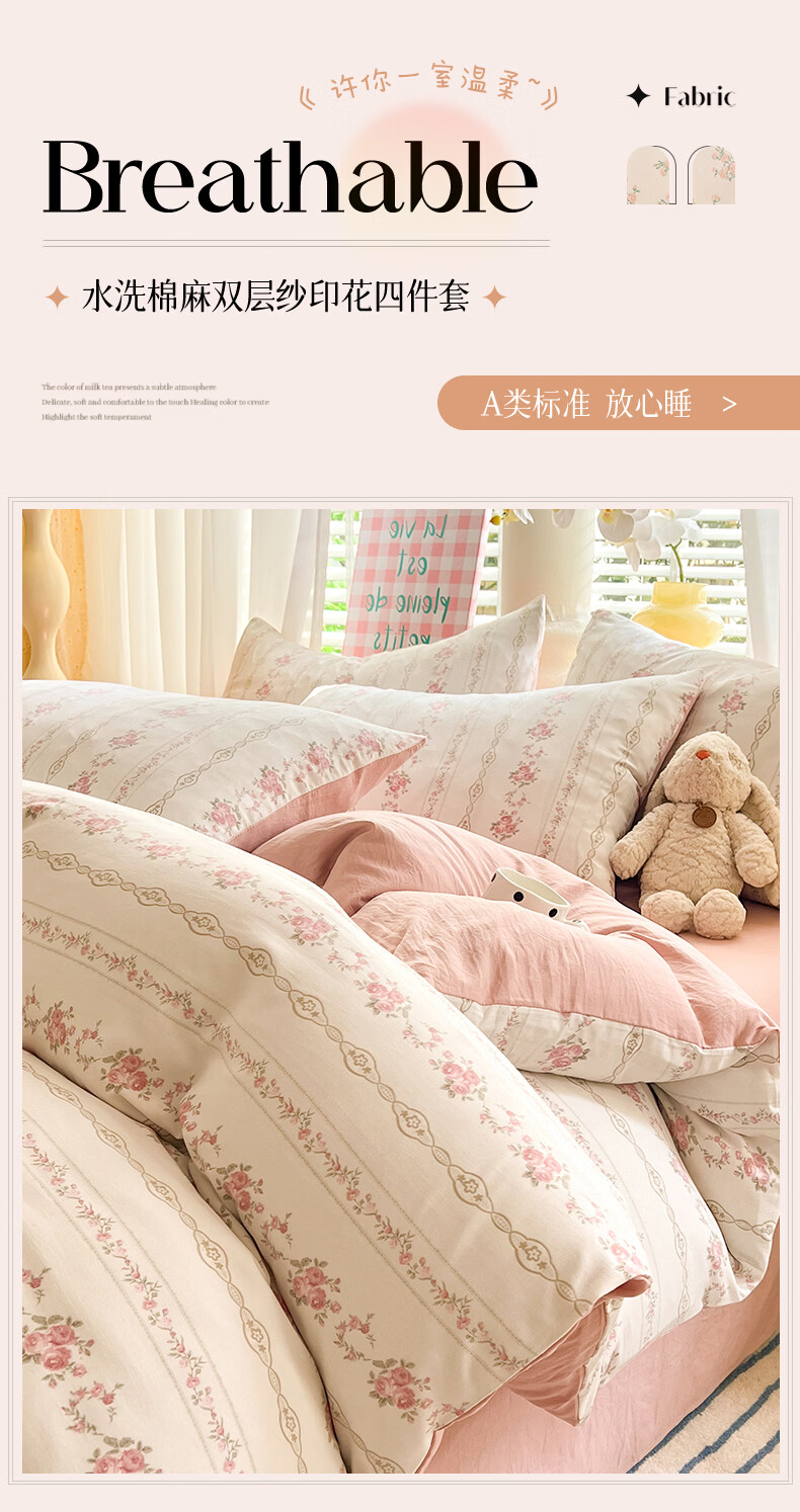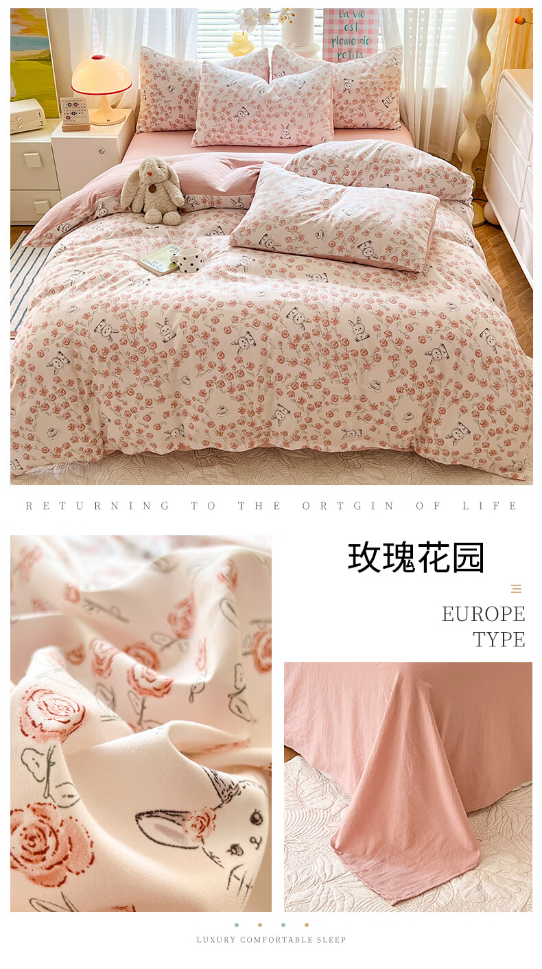浪莎(LangSha)水洗棉床上四件套亲肤双层纱床单被罩套床笠款学生宿舍三件套床品 熊猫家园 床单款 单被套-150*200cm