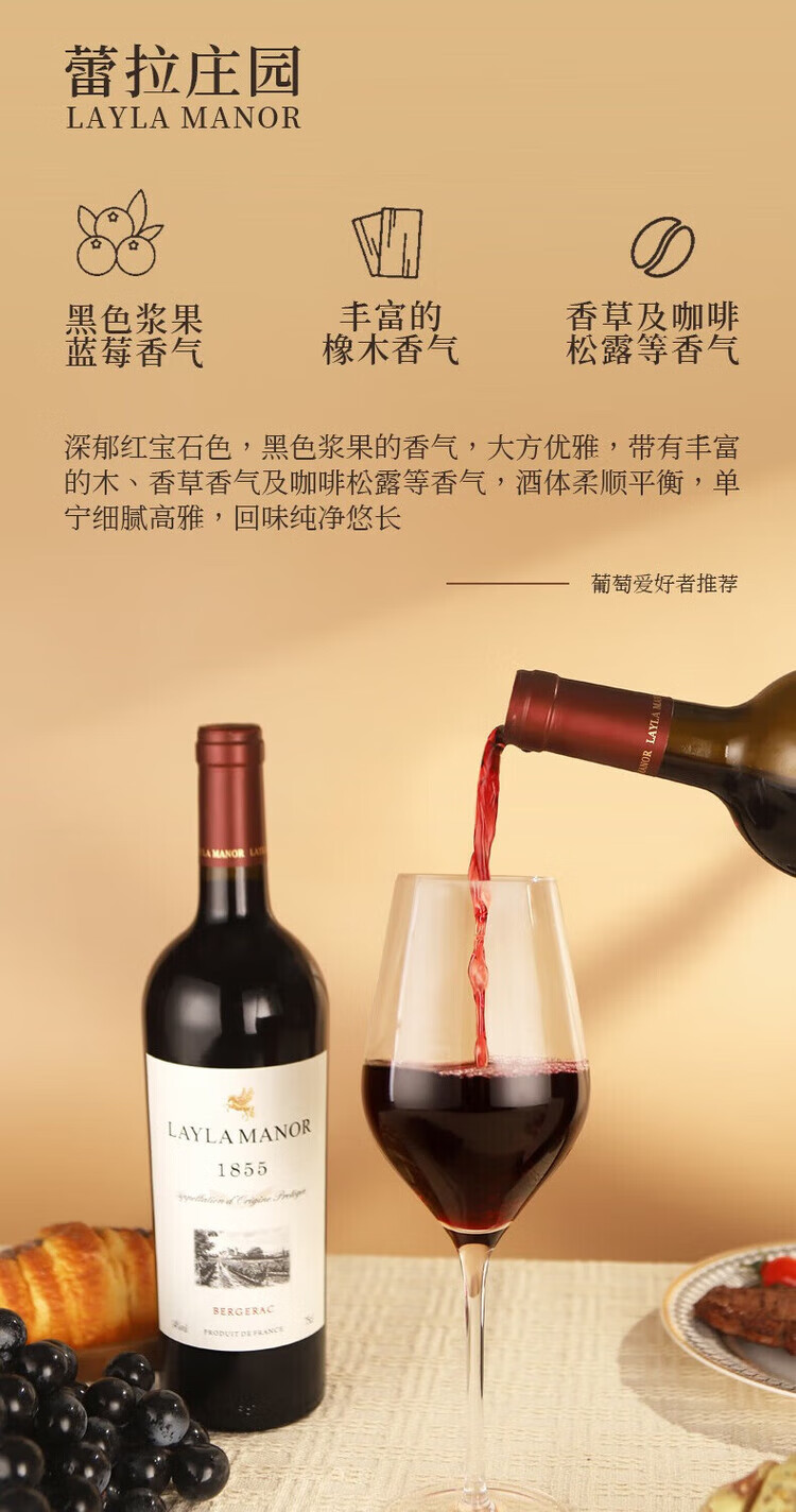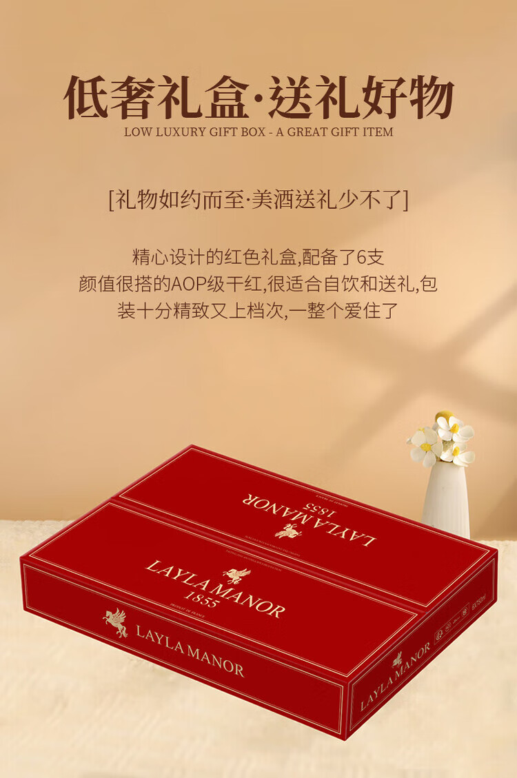 LAYLA【法国蕾拉】进口红酒14度AOP级老藤干红葡萄酒750mlX6支礼盒装
