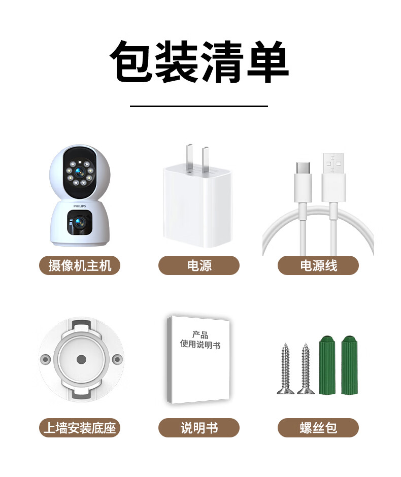 飞利浦(PHILIPS)摄像头家用监控器360度无死角带夜视全景监控无需连wifi终身免流量手机远程可对话室内高清监视器 WiFi版双摄+7天循环录像+终身免费回放
