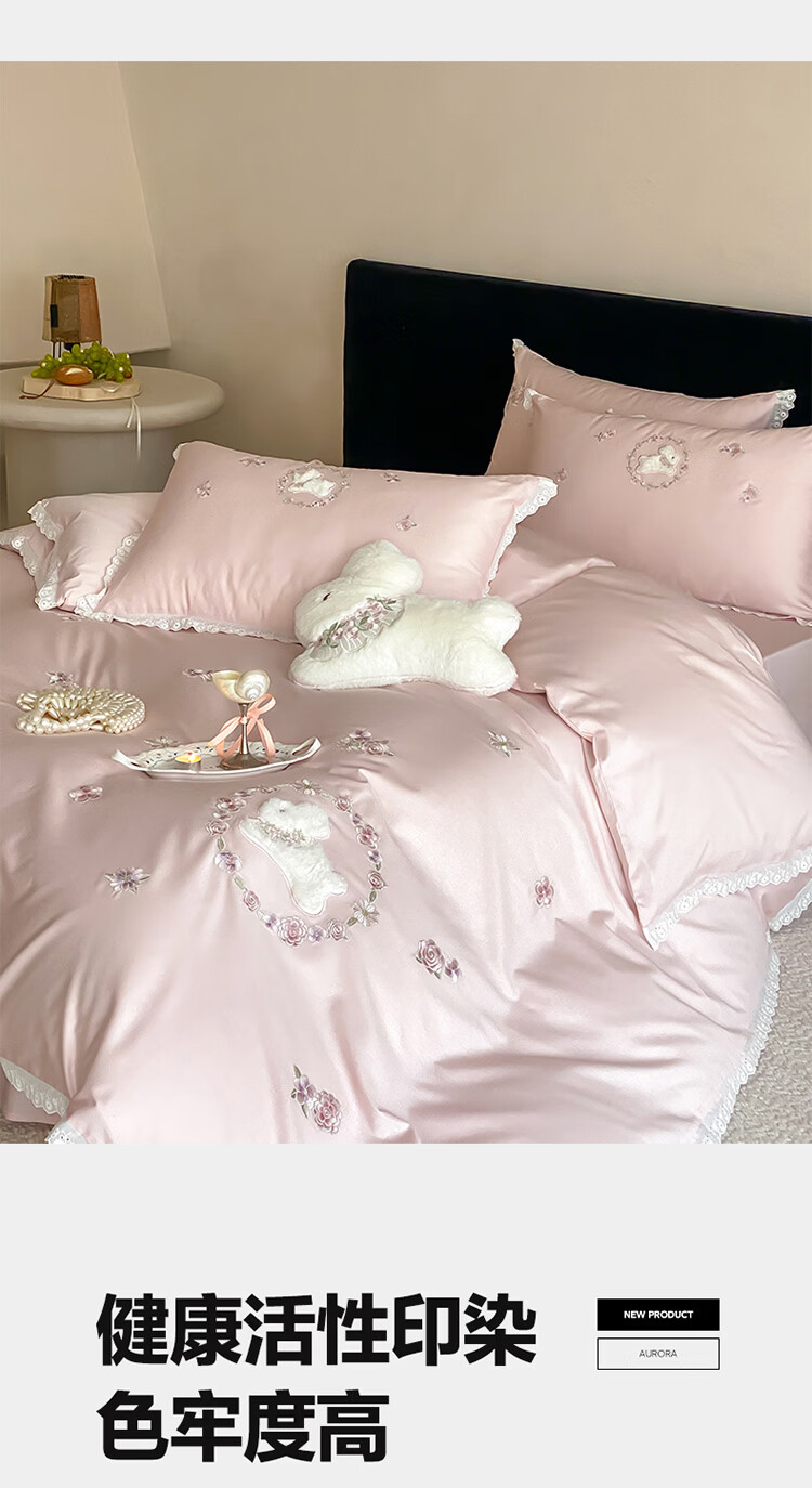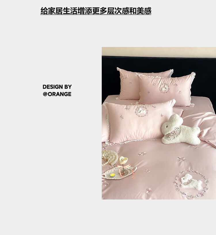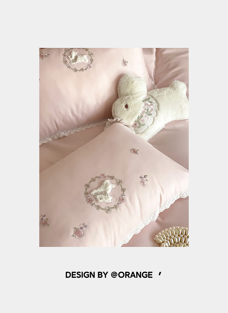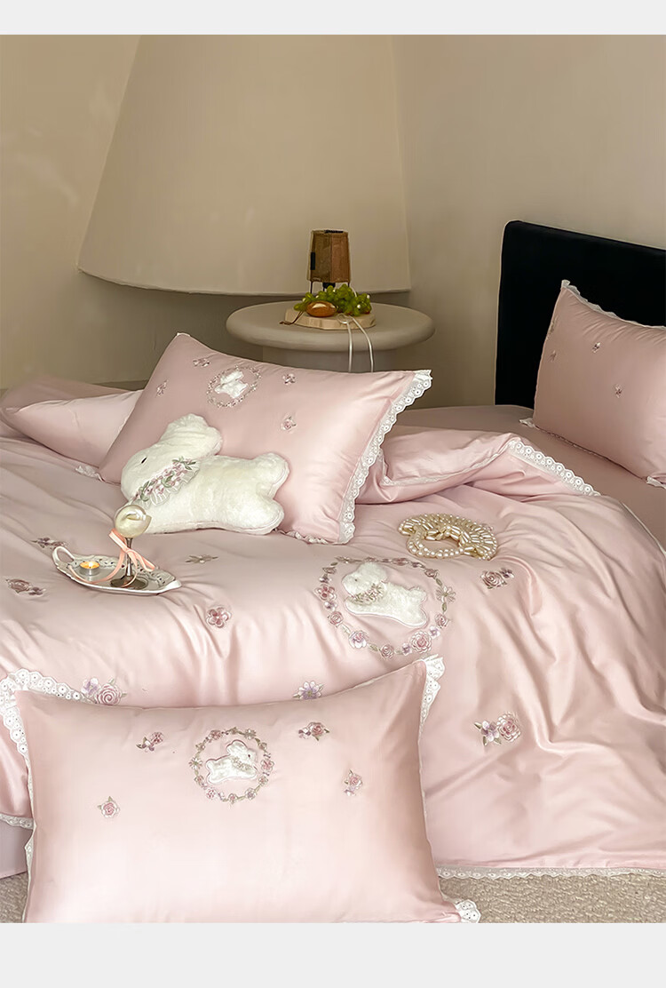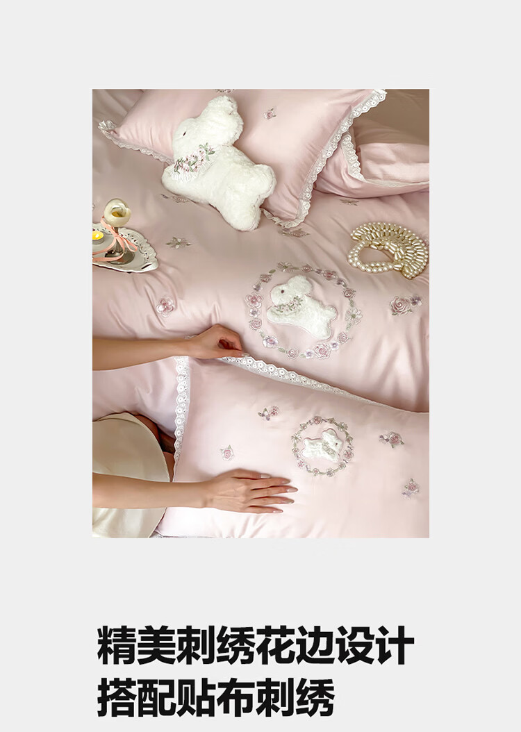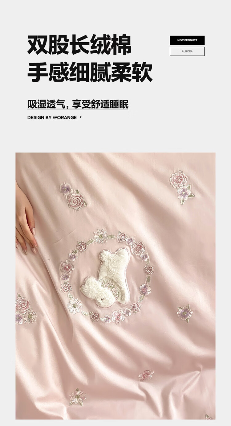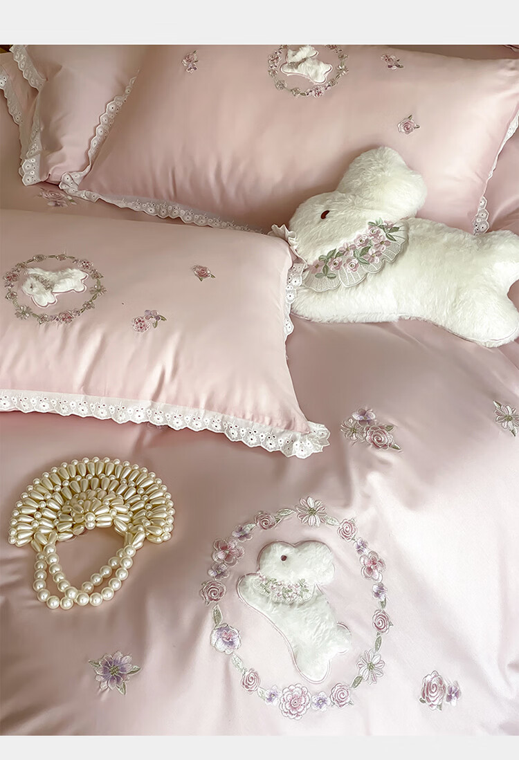 ROLAND LIVE长绒棉刺绣四件套春夏可爱兔子被套全棉少女心四季床上用品三件套 FX 长绒棉套件-朵朵兔粉色 1.2米床 床单款 【被套150*200cm】