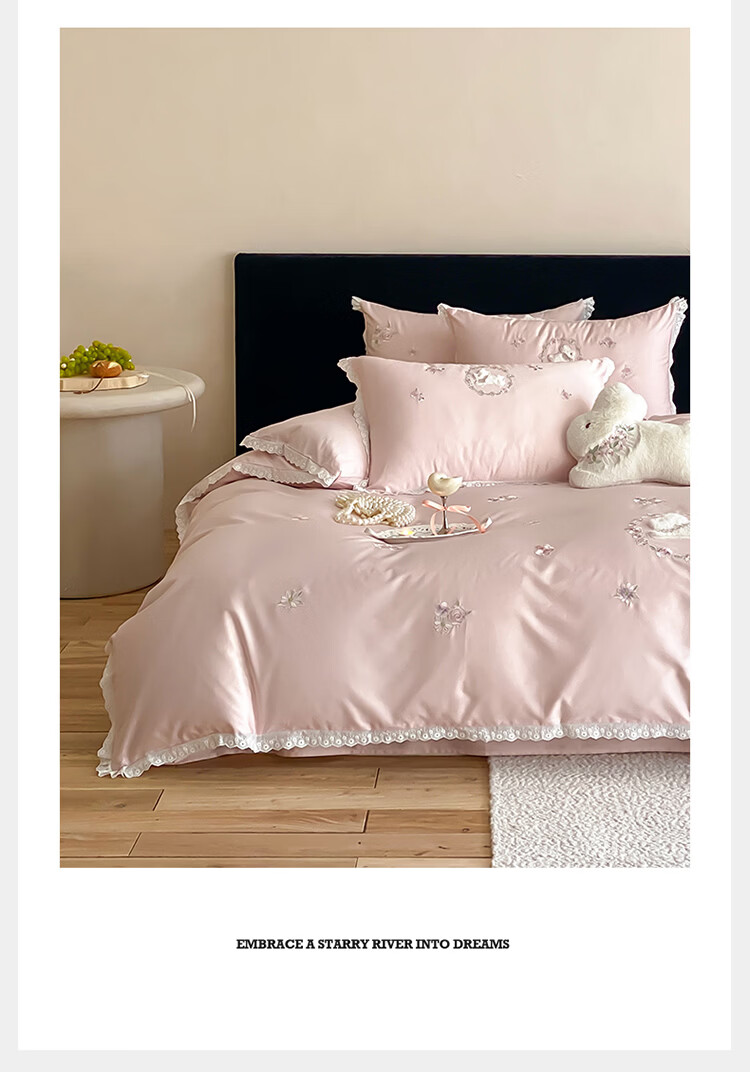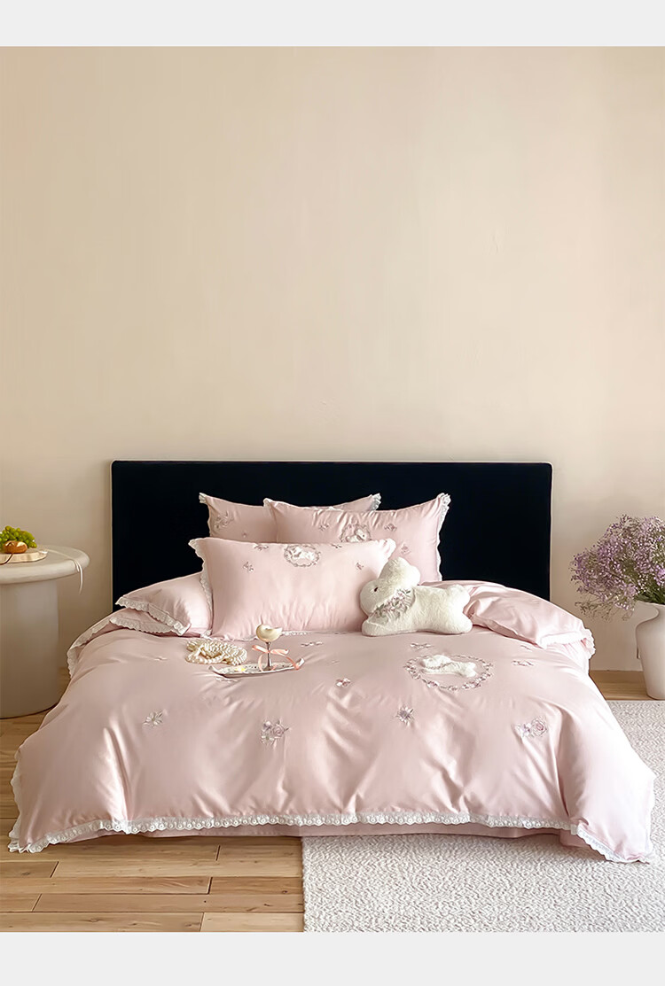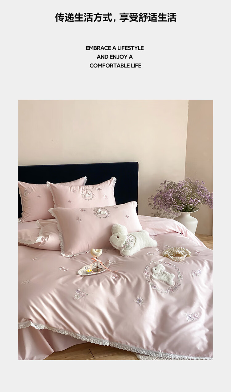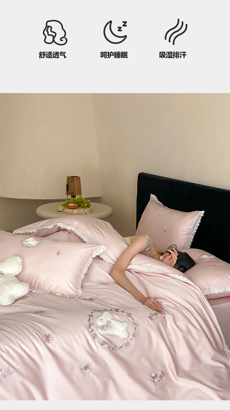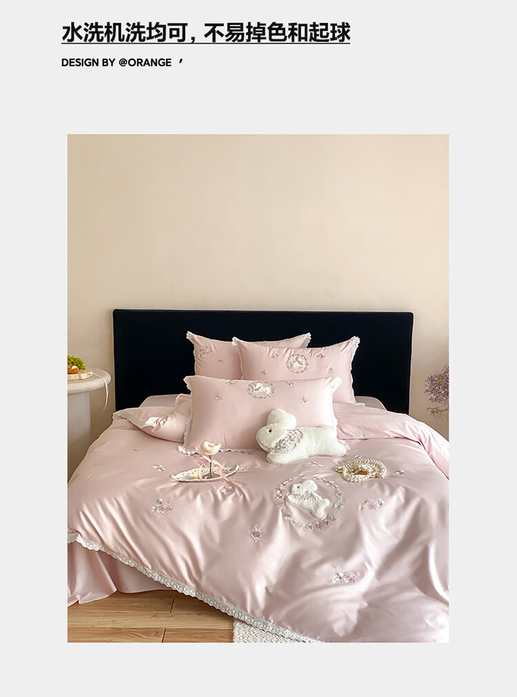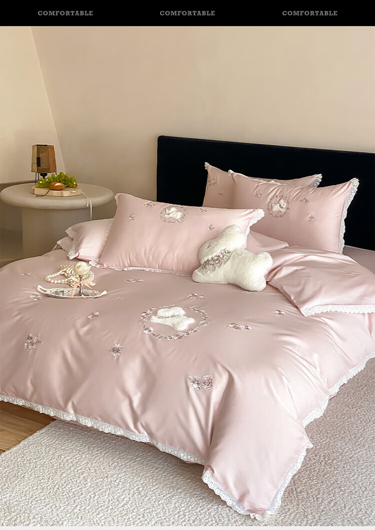 ROLAND LIVE长绒棉刺绣四件套春夏可爱兔子被套全棉少女心四季床上用品三件套 FX 长绒棉套件-朵朵兔粉色 1.2米床 床单款 【被套150*200cm】