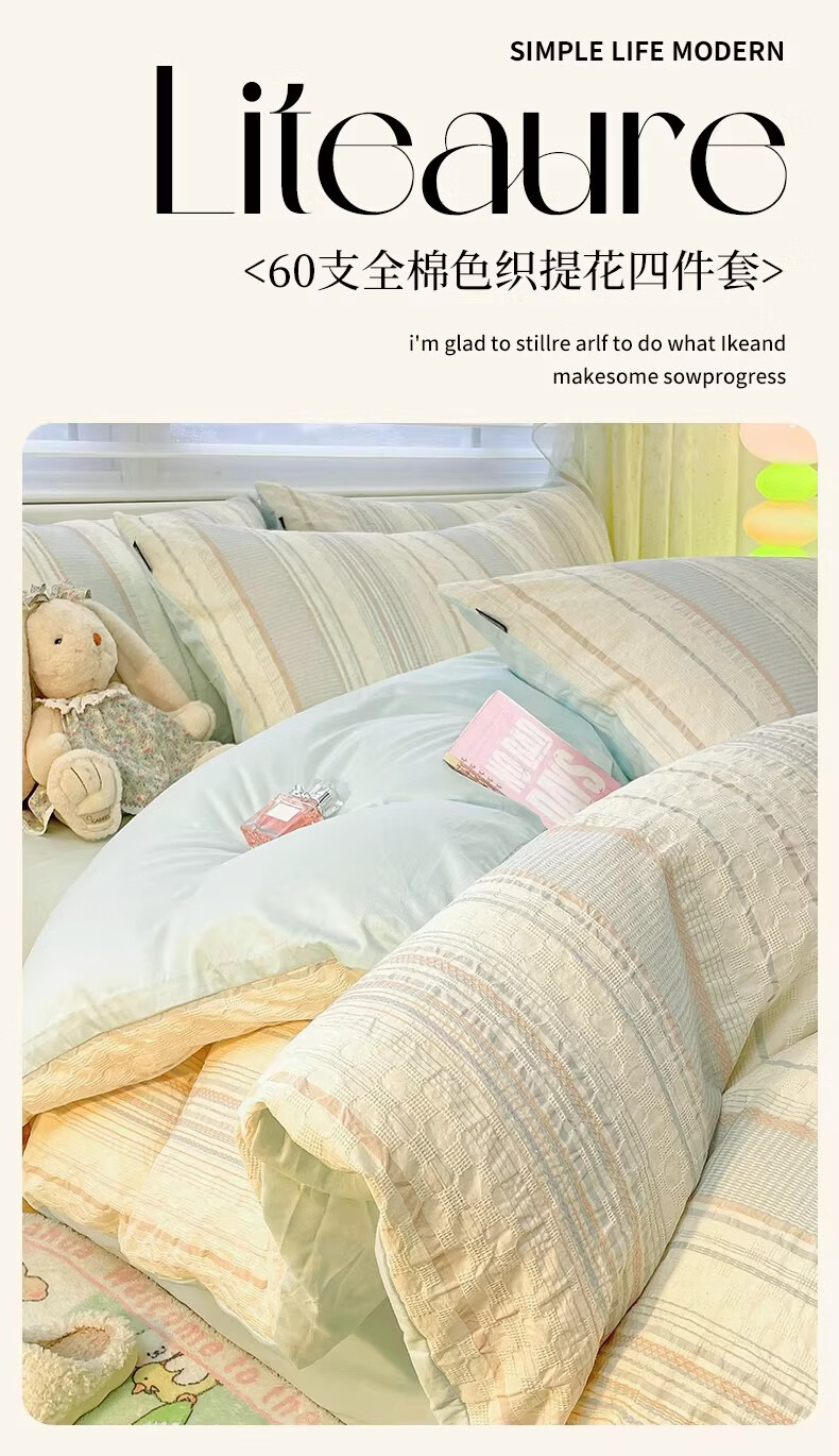 无印良品全棉色织提花四件套100%纯棉床单被套家用高级感床笠裸睡床上用品 未来海岸-绿 【A类全棉面料 柔软舒适】 2.0m 床单款 四件套-被套220x240cm