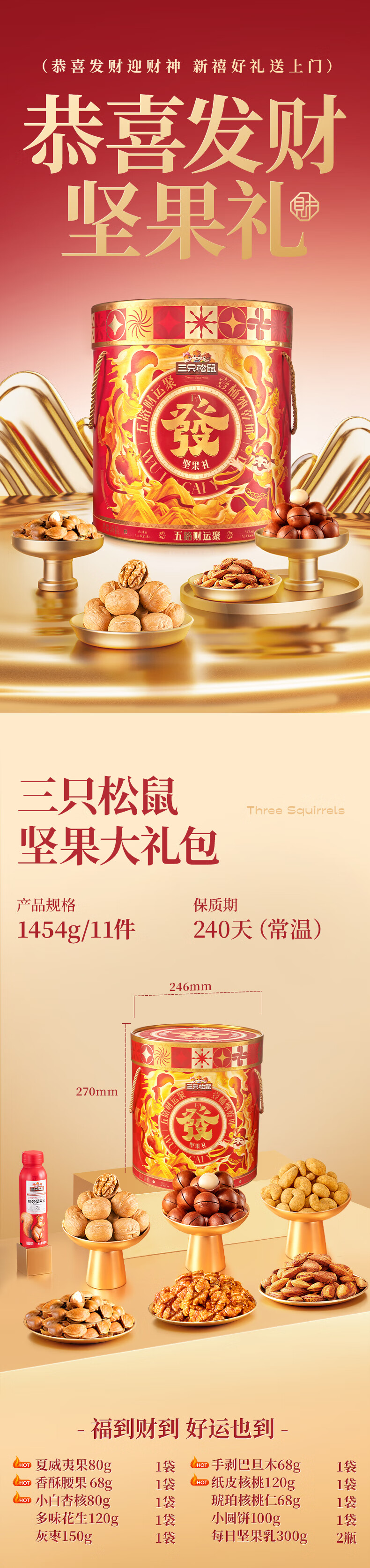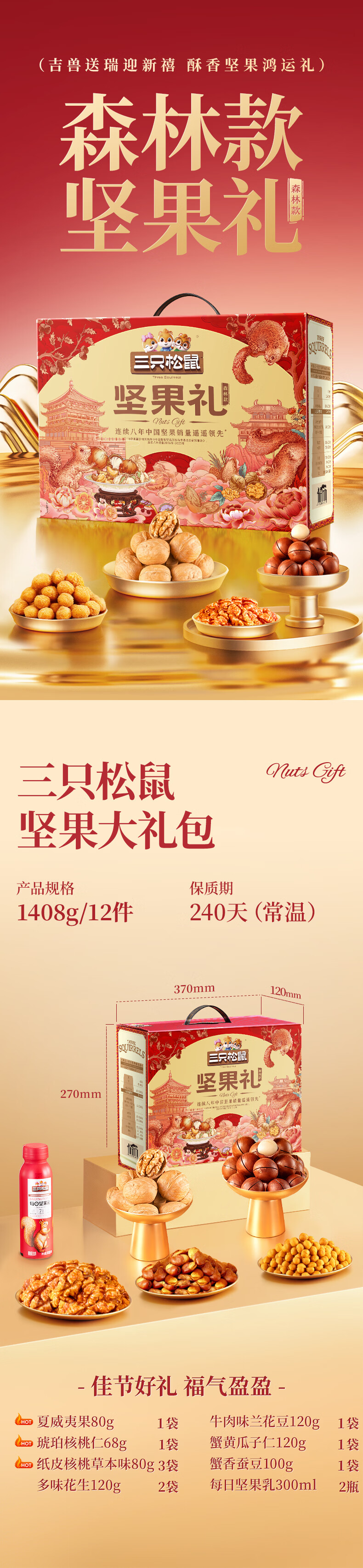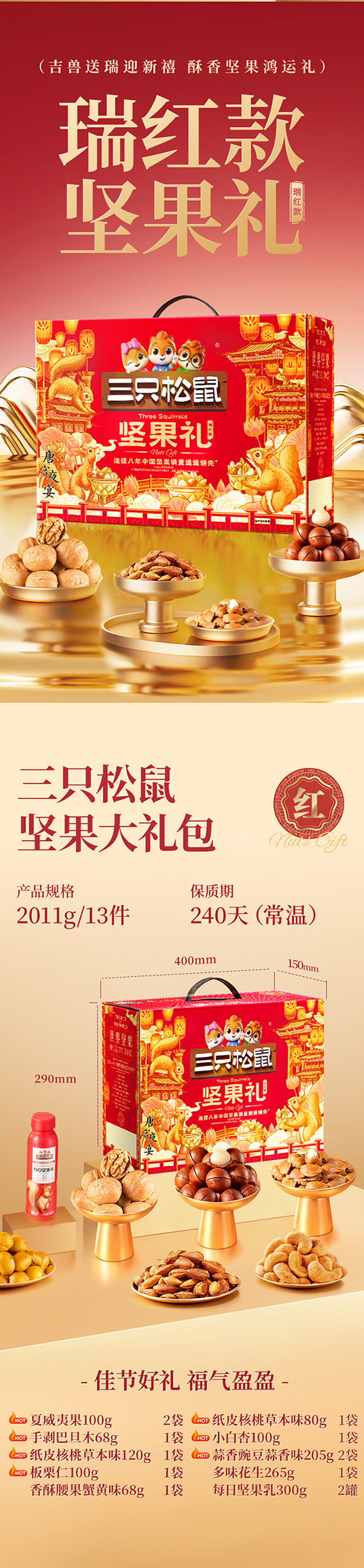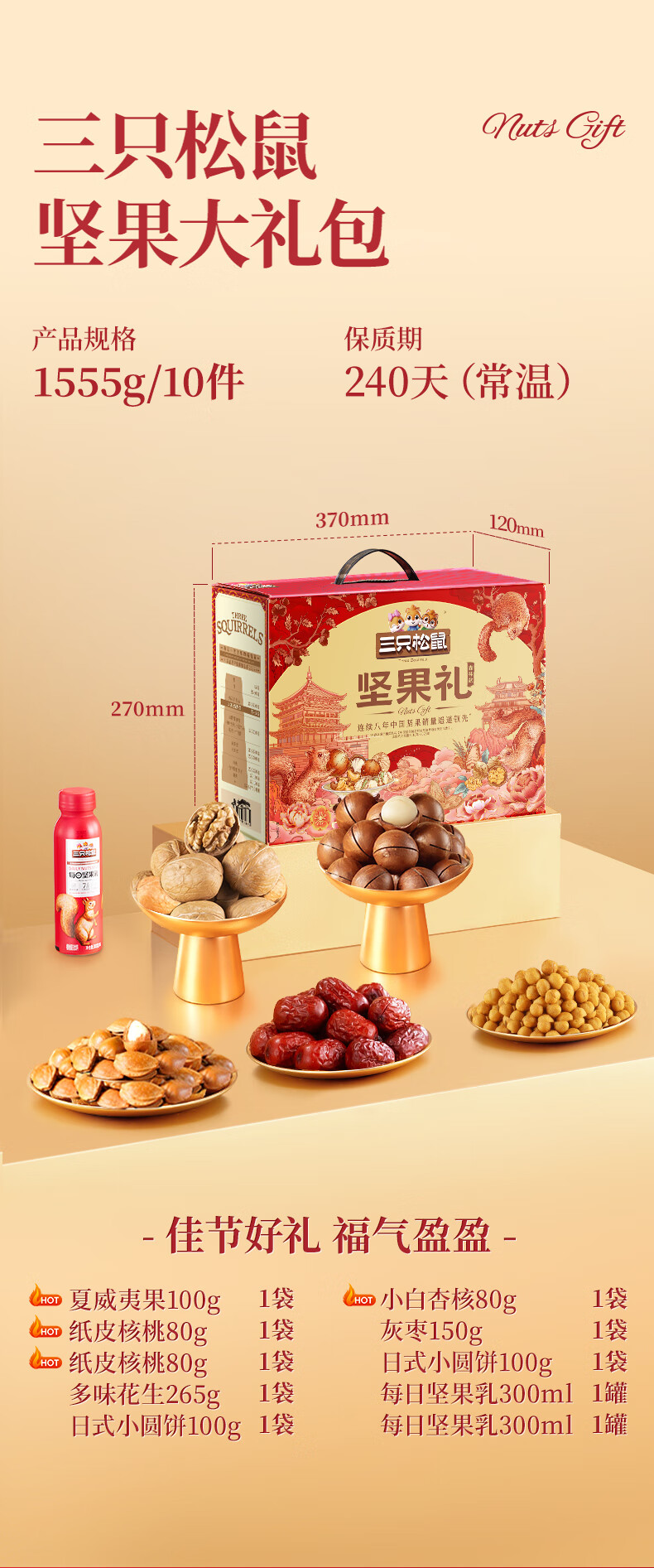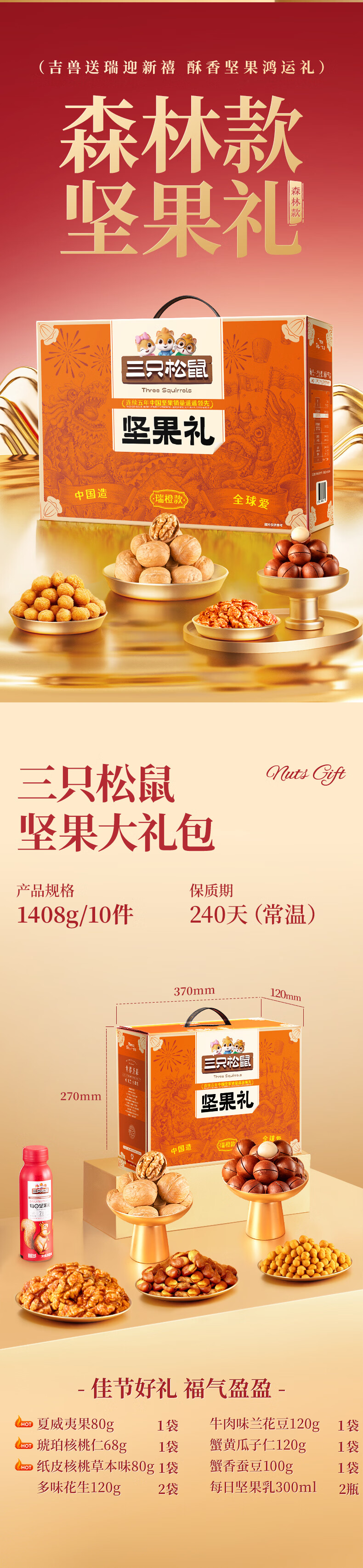 三只松鼠坚果炒货零食大礼包每日坚果果干春节年货节日送礼礼盒整箱团购 【定制款/共10件】含3坚果5零食炒货2坚果乳/1408g