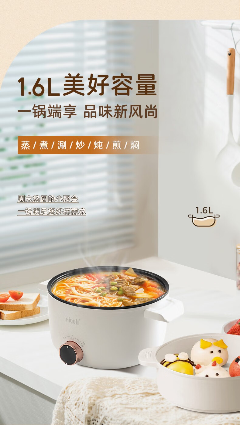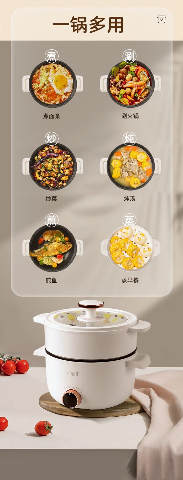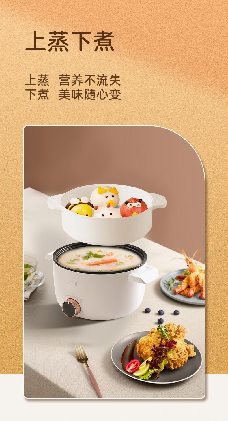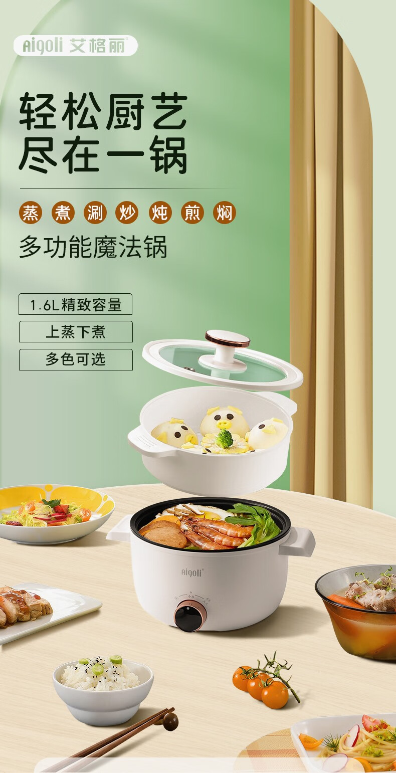艾格丽(Aigoli)电煮锅宿舍学生宿舍便携多功能一体锅小电锅家用迷你双层蒸煮锅泡面锅火锅 双层薄荷绿-1.6L煮锅+1.8L蒸格