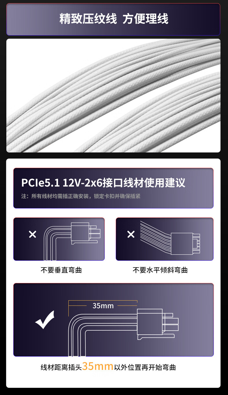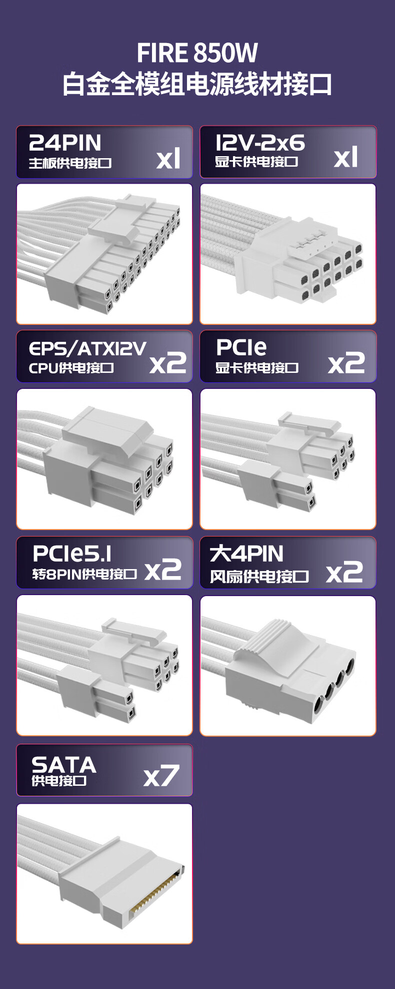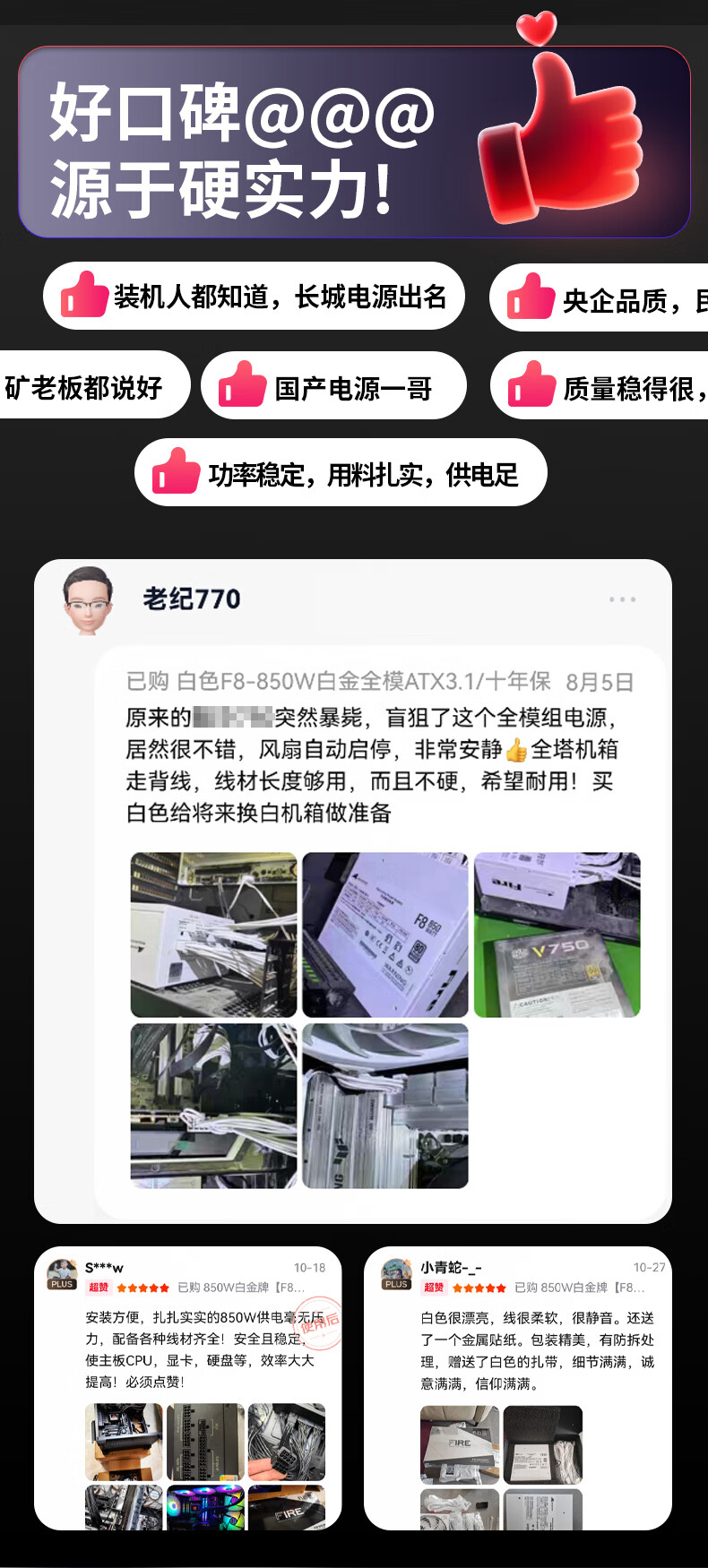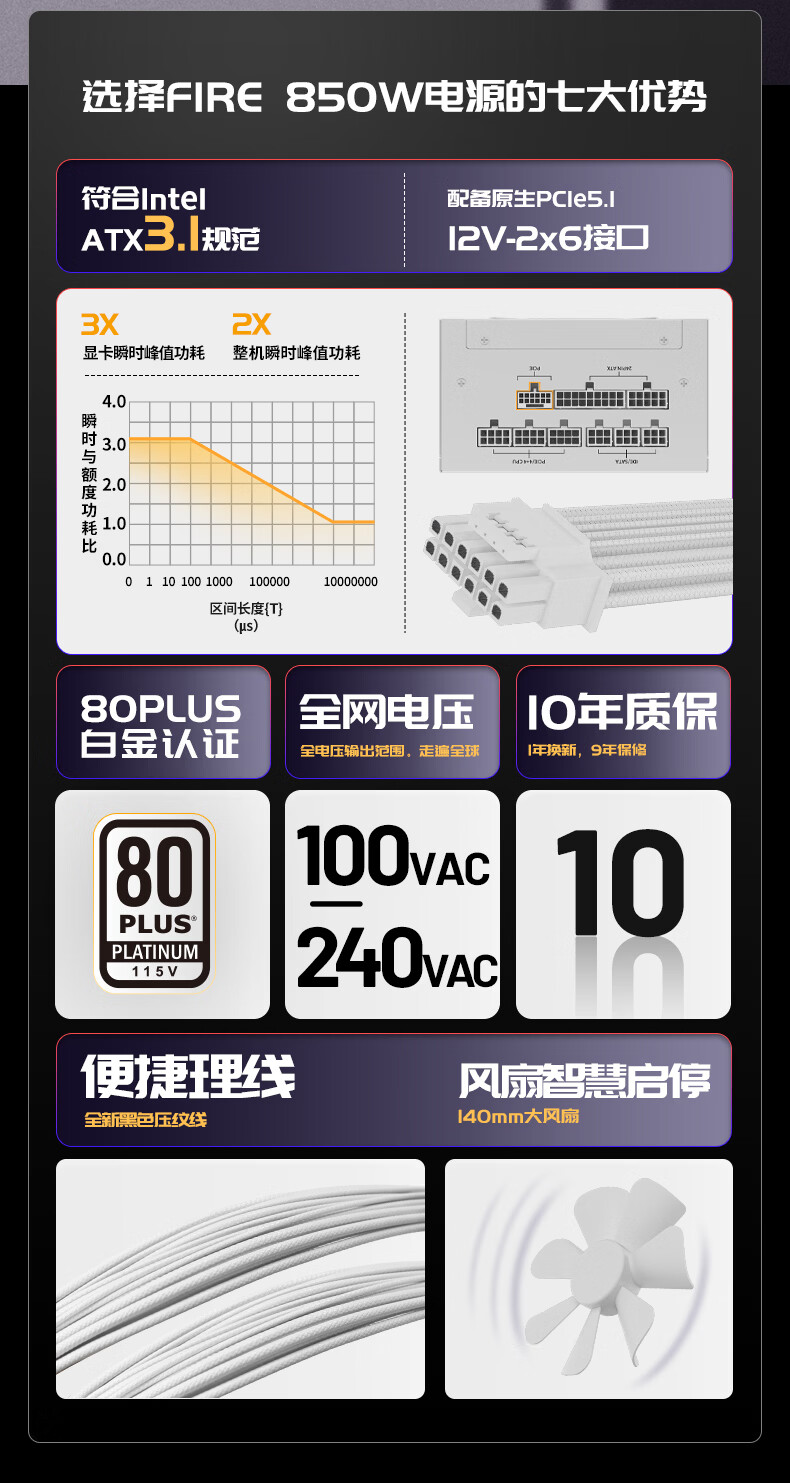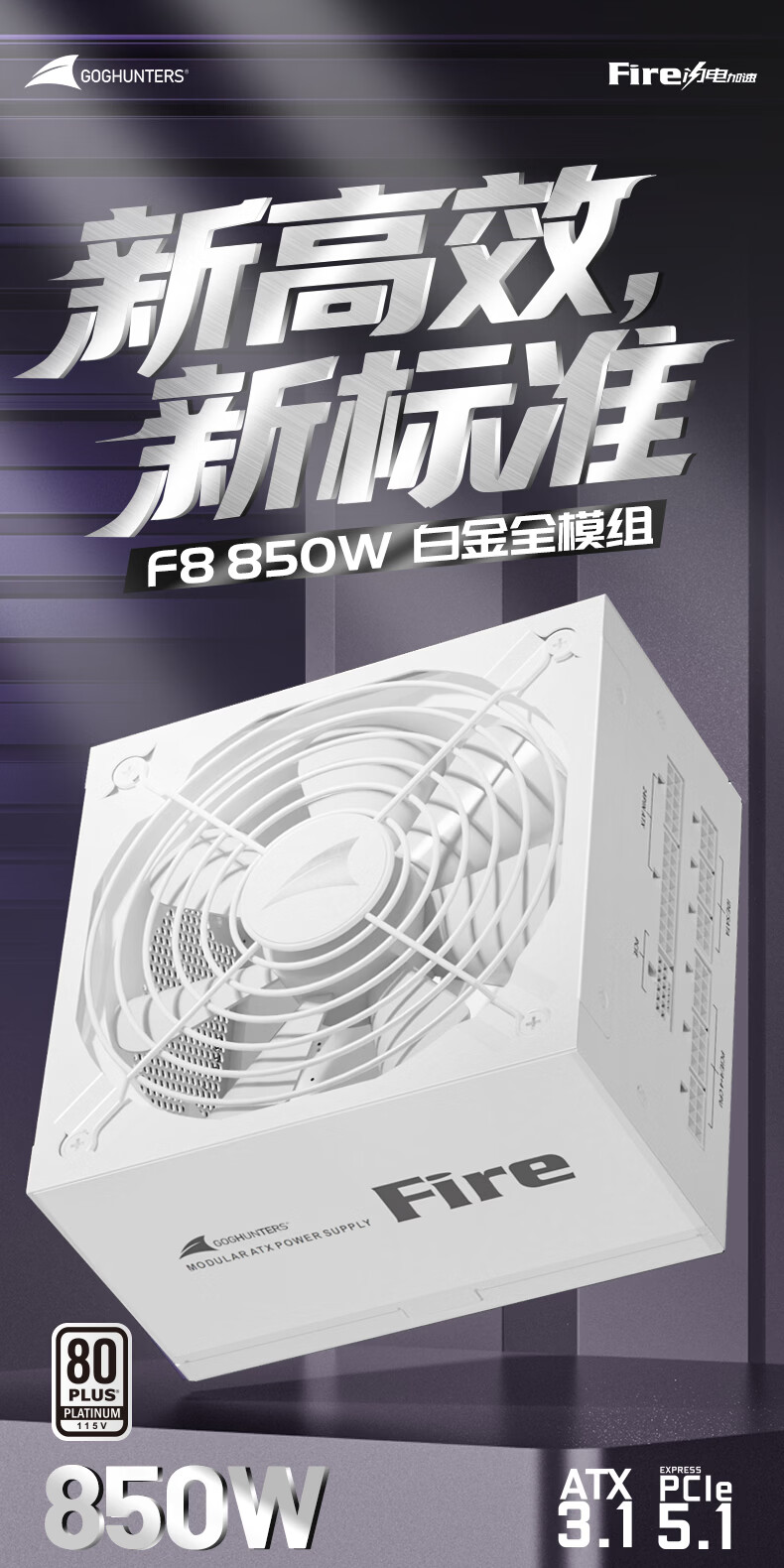 长城(Great Wall)额定850W F8白色白金牌全模组电源(ATX3.1标准/原生PCIe5.1/自动启停/全电压/闪电加速)