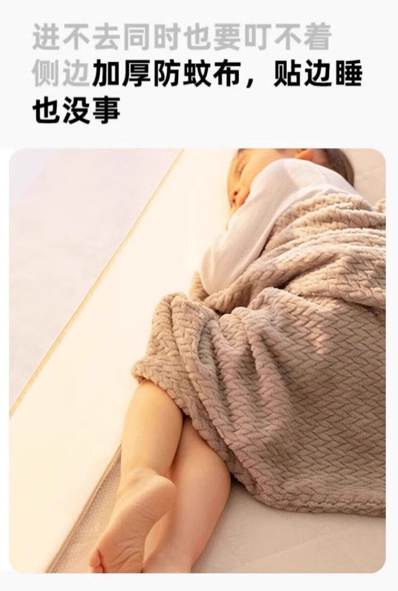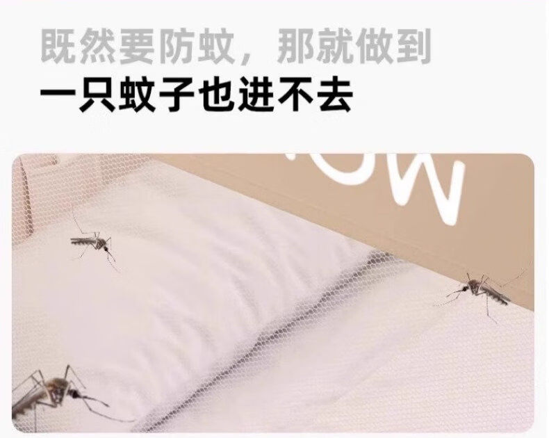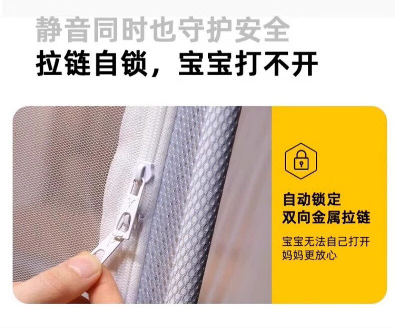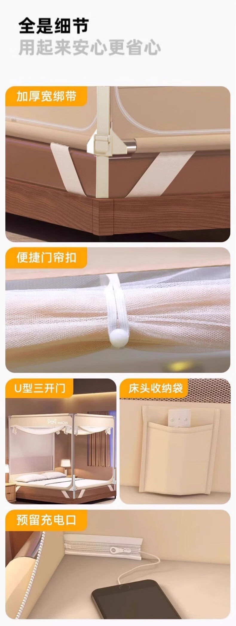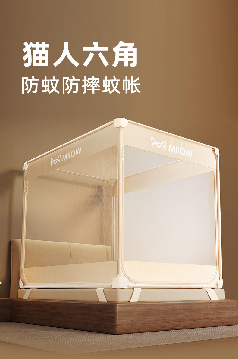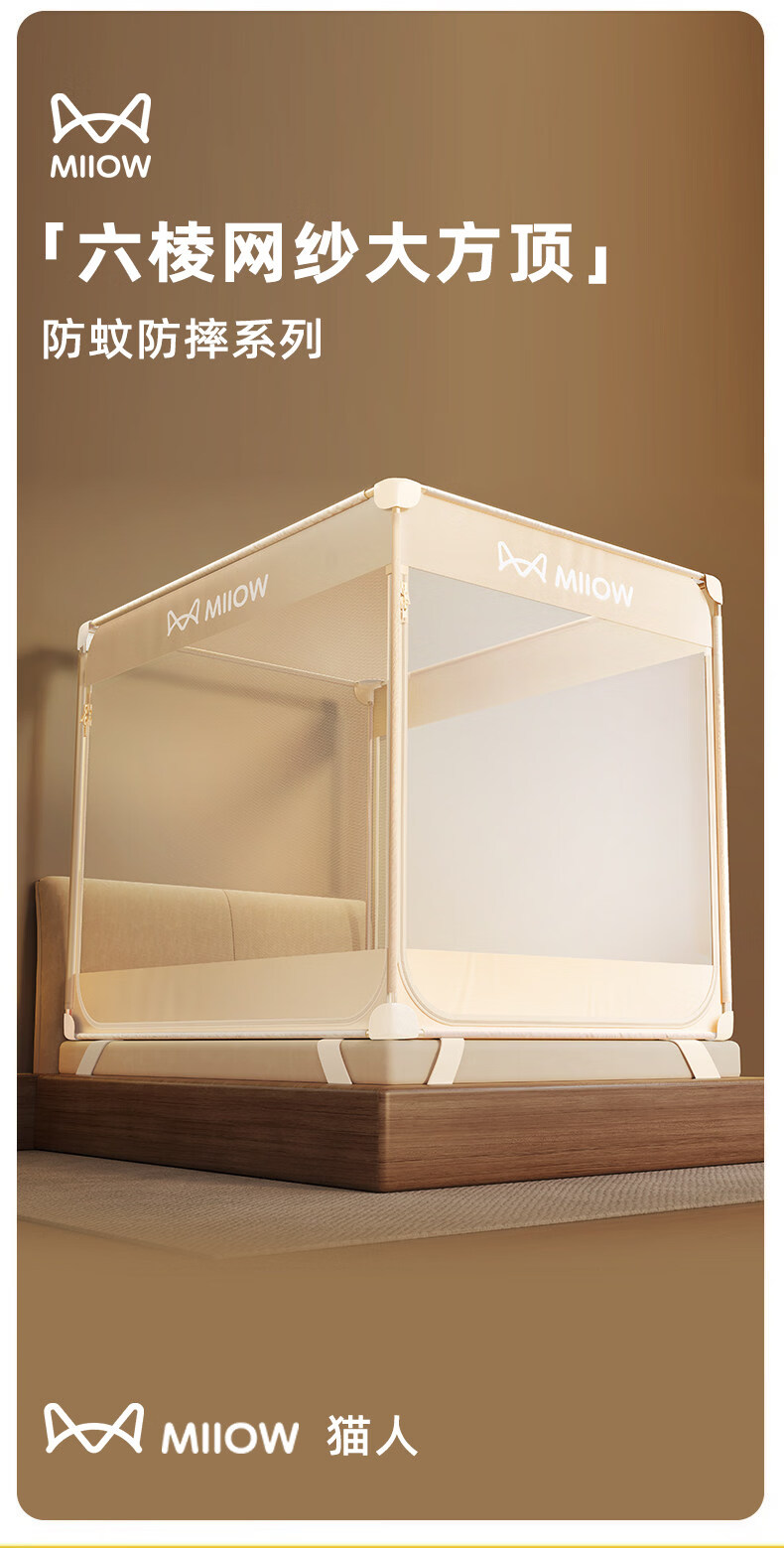 猫人(MiiOW)防摔婴儿蚊帐1.8x2米家用一体式免安装全包围蒙古包儿童单帐纱帘 米黄【护栏式脚架 防摔再升级】 适用1.8m床-宽180*长200*高170cm