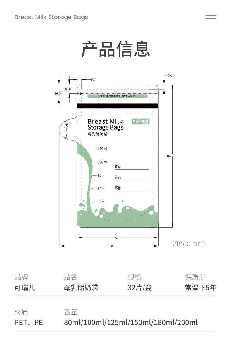 可瑞儿(MyCarol)壶口储奶袋奶粉分装袋一次性母乳储存袋婴儿辅食袋 200ml*32片