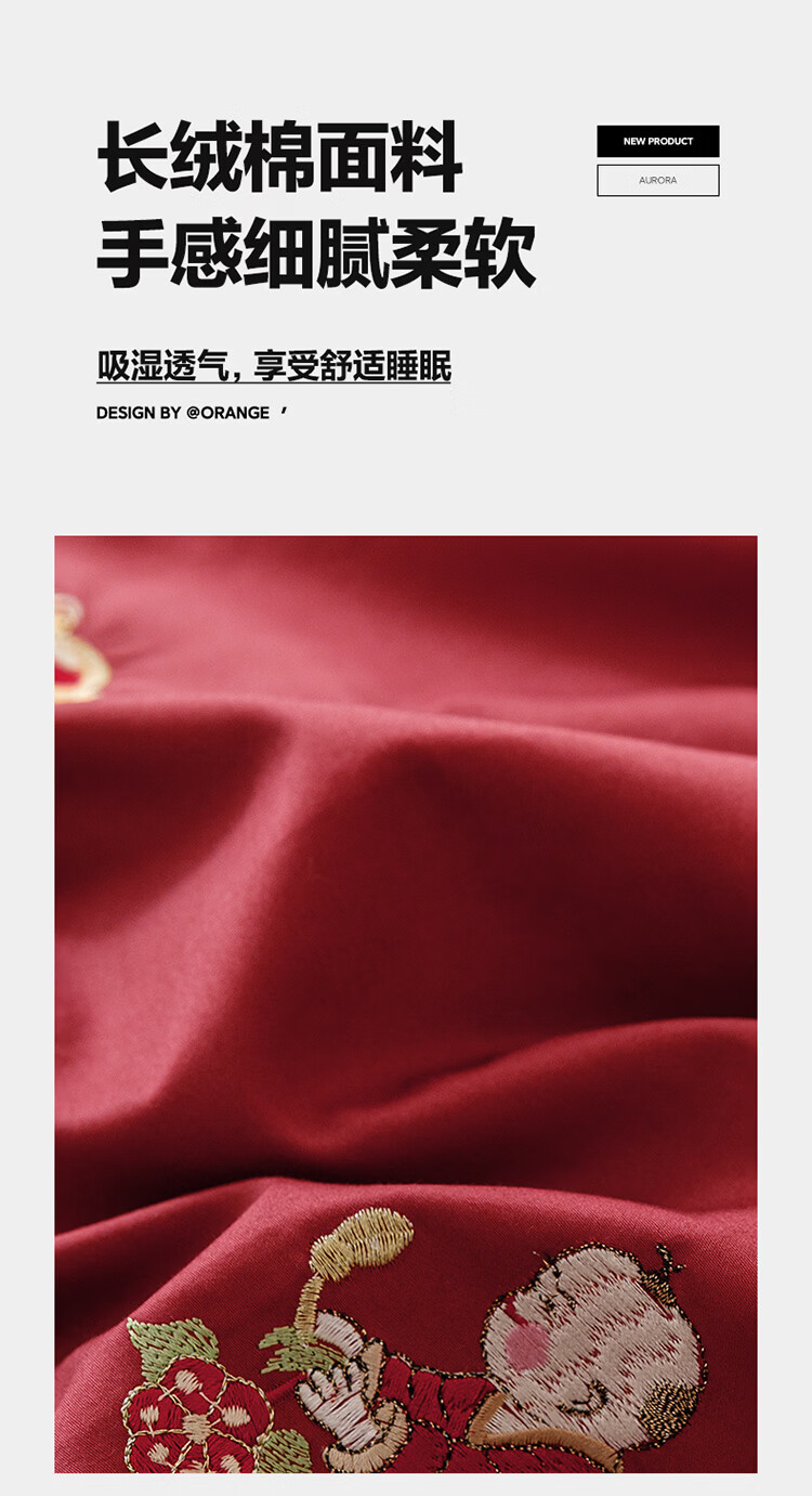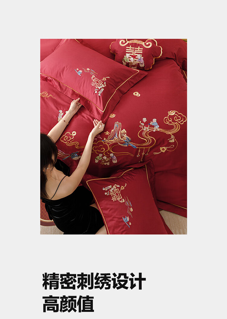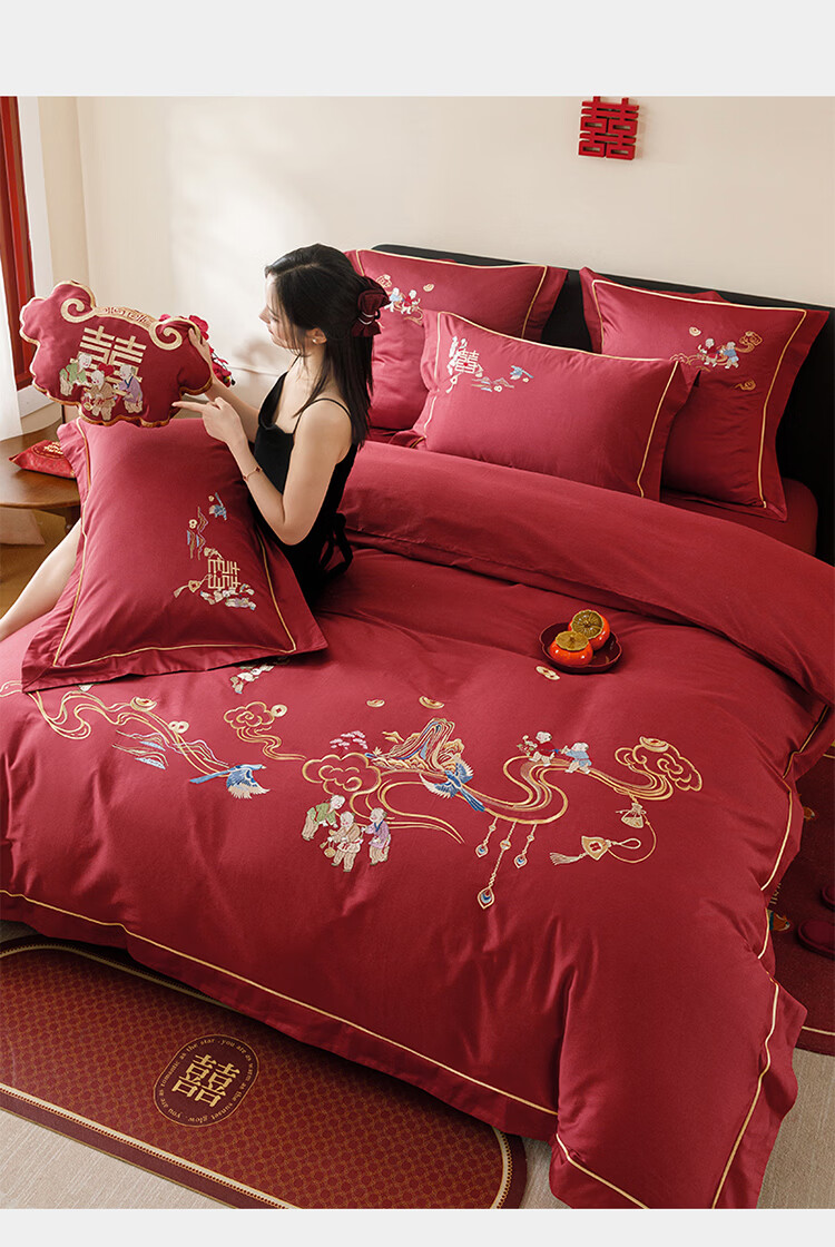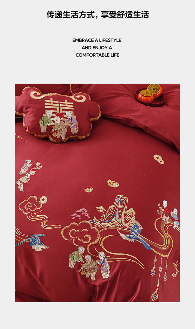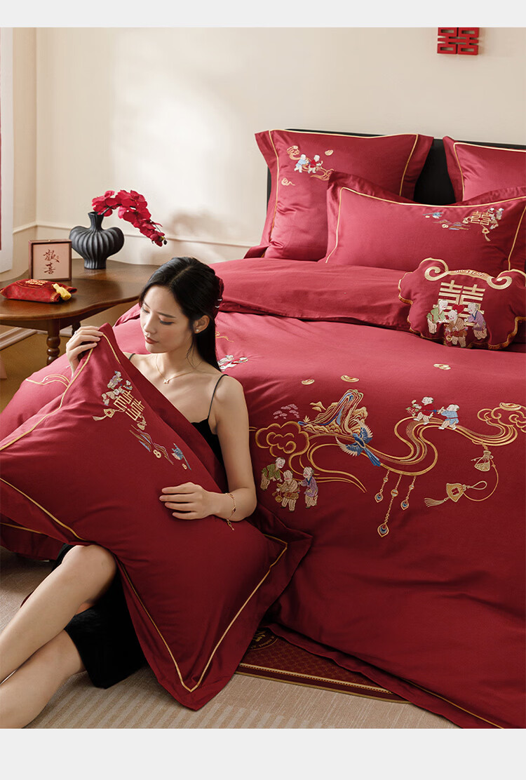 ROLAND LIVE春夏长绒棉绣花婚庆四件套红色新婚被套床单喜庆全棉床上用品 SY 长绒棉婚庆套件-百子贺喜 标准四件套 |【被套200*230cm】