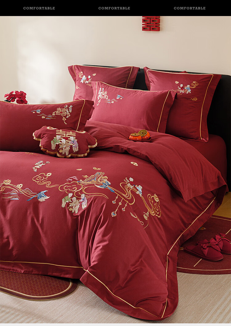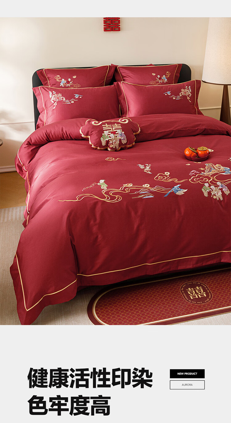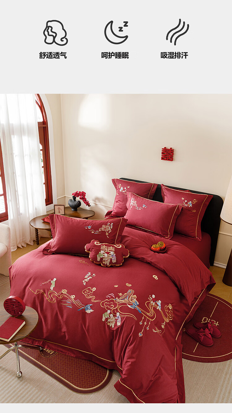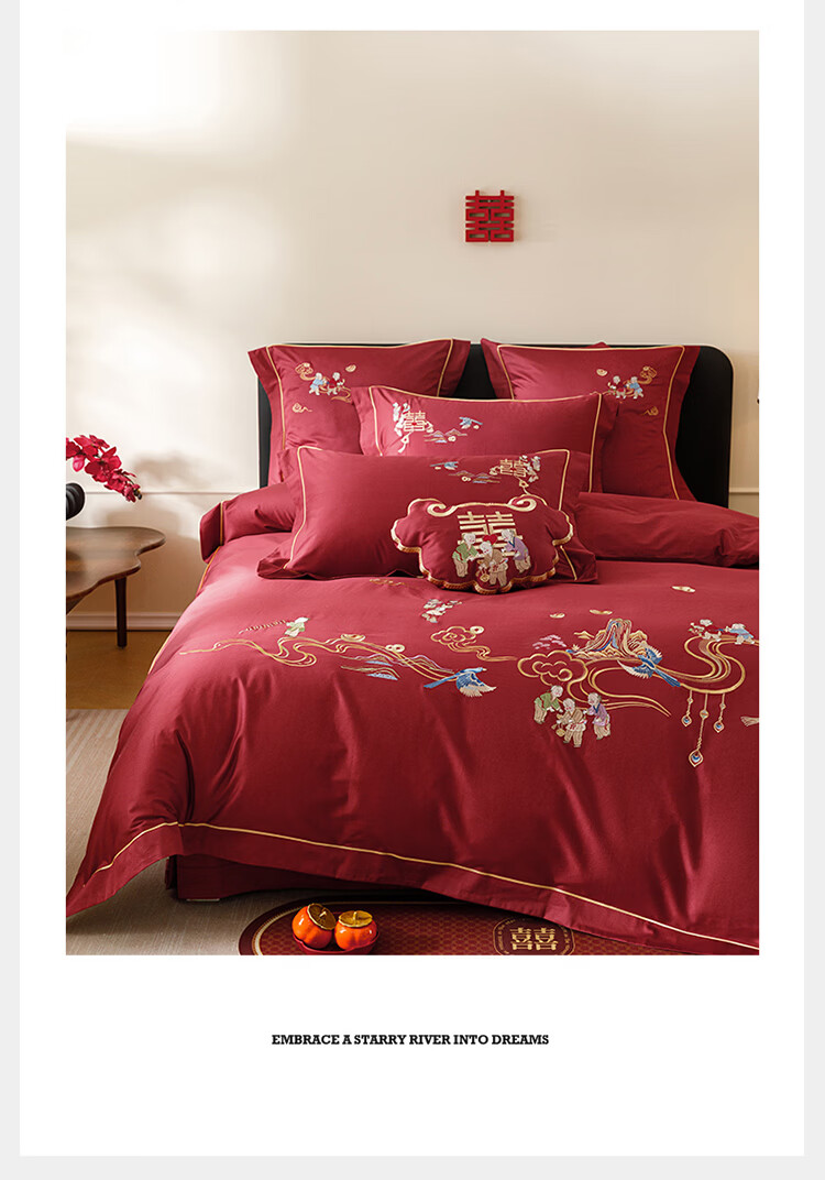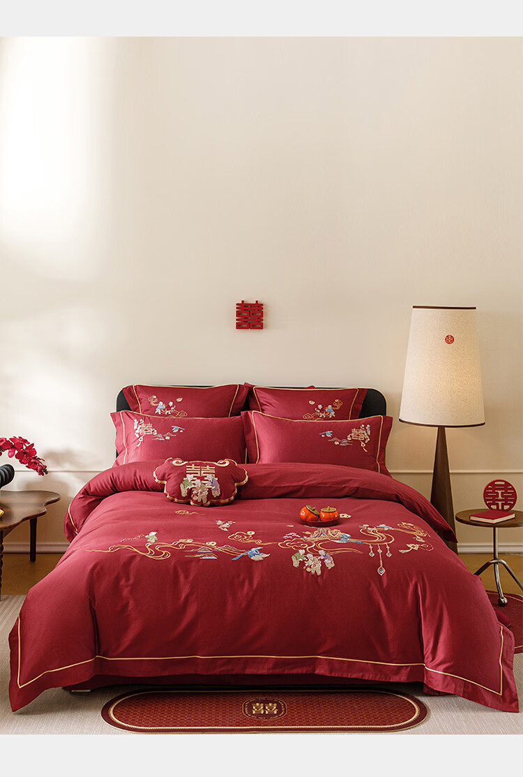 ROLAND LIVE春夏长绒棉绣花婚庆四件套红色新婚被套床单喜庆全棉床上用品 SY 长绒棉婚庆套件-百子贺喜 标准四件套 |【被套200*230cm】