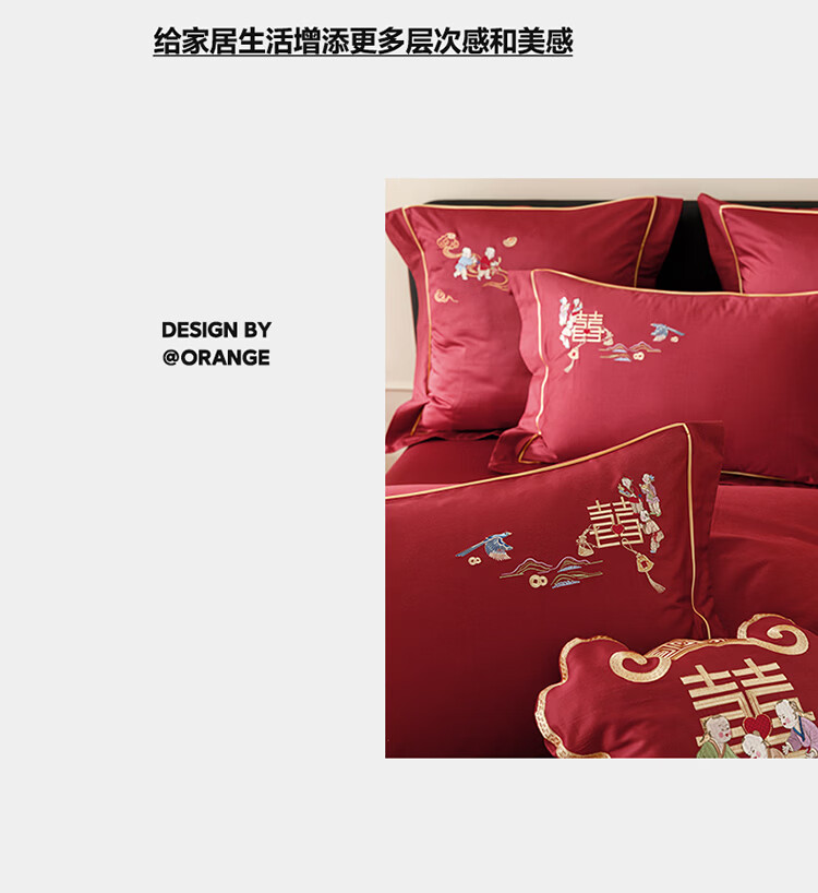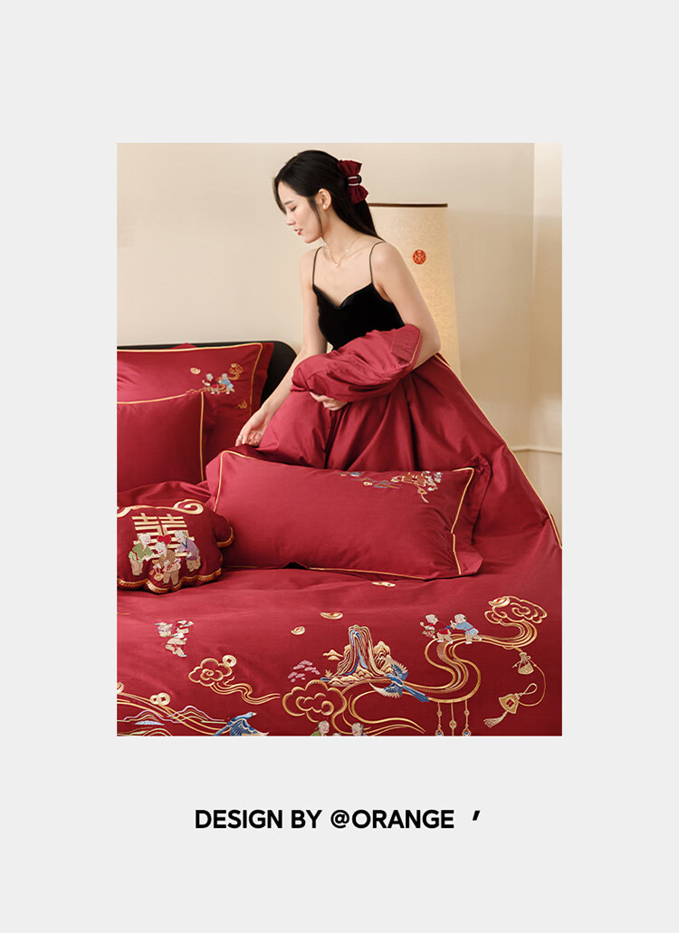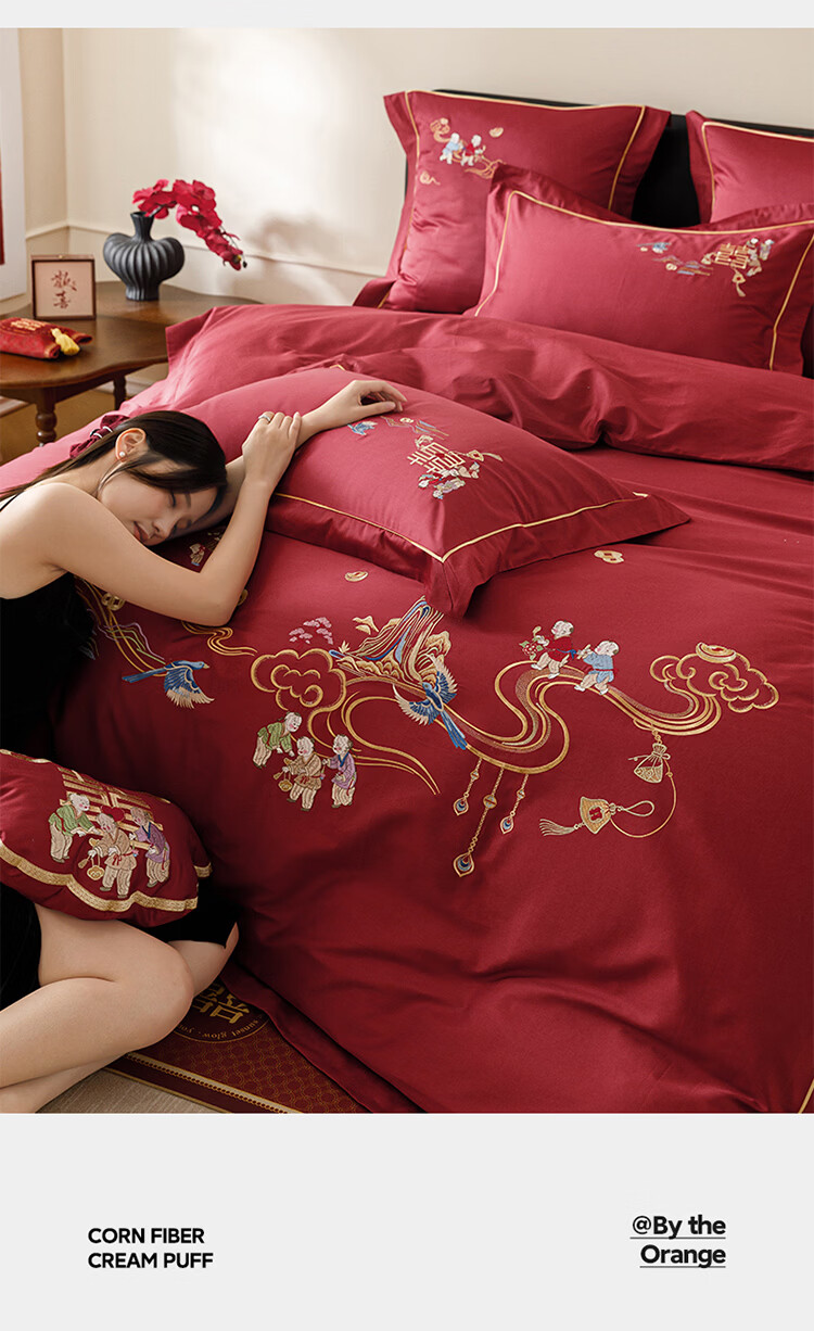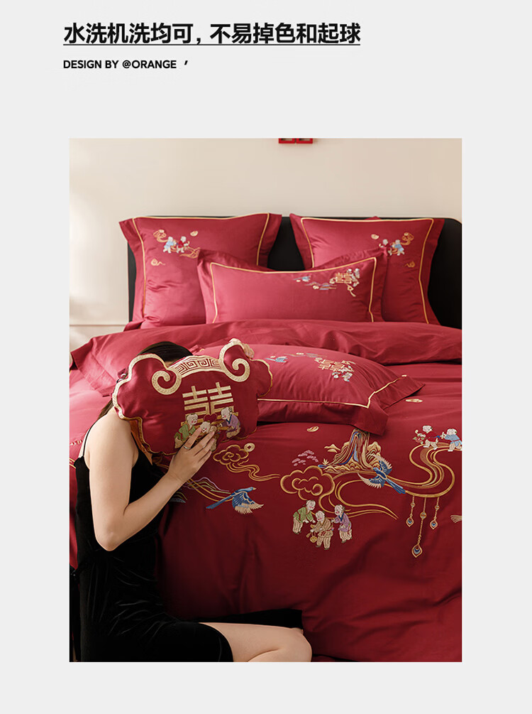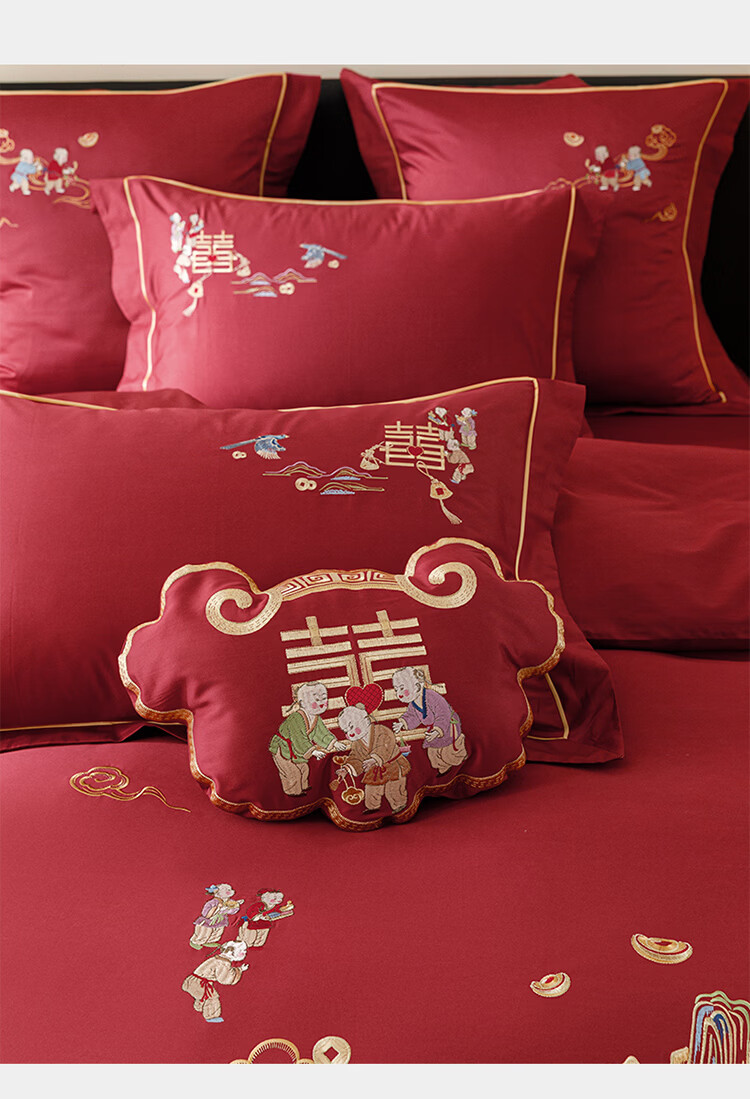 ROLAND LIVE春夏长绒棉绣花婚庆四件套红色新婚被套床单喜庆全棉床上用品 SY 长绒棉婚庆套件-百子贺喜 标准四件套 |【被套200*230cm】