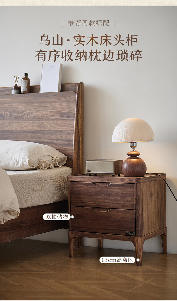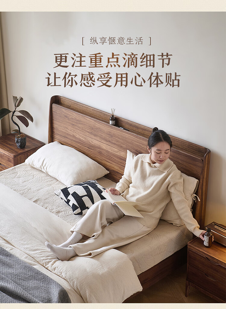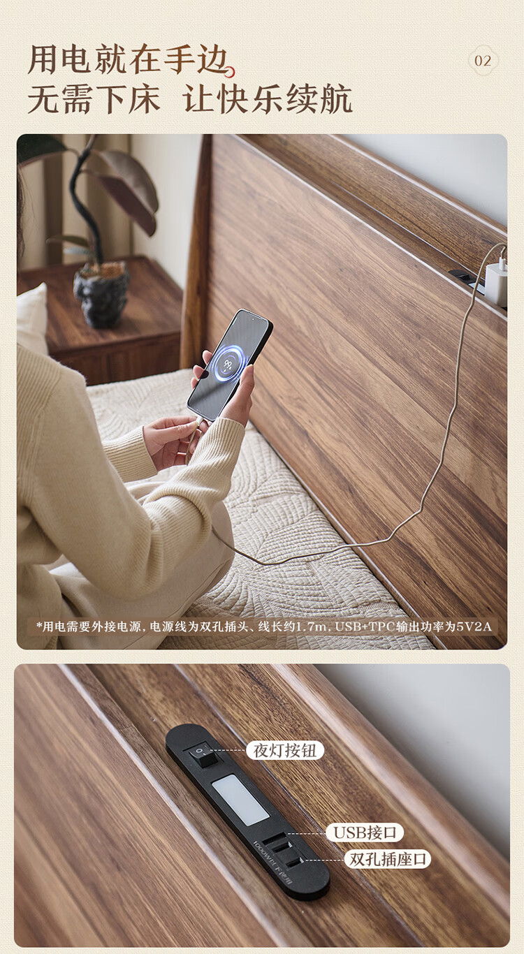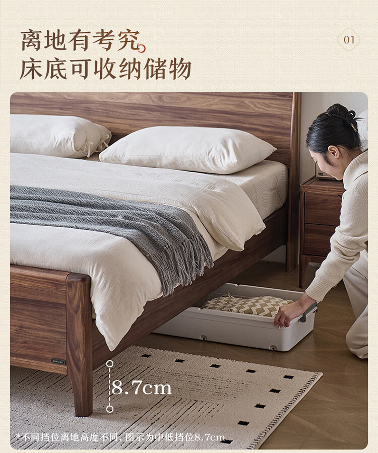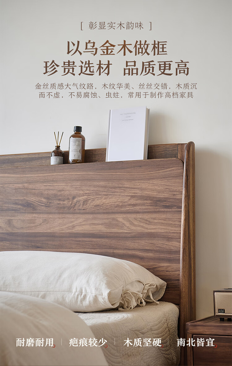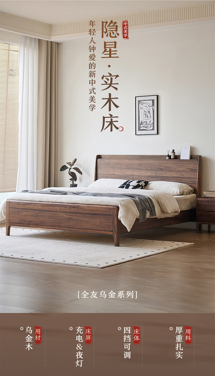 全友家居新中式乌金木多功能实木床2026新款主卧室高脚床储物双人大床 【乌金木 | 可充电 | 小夜灯 | 床高可调】高脚款 1.5米x2米 单床