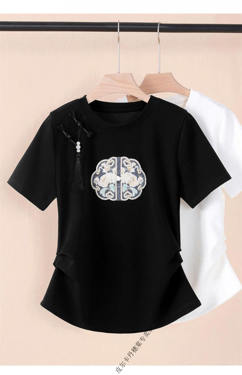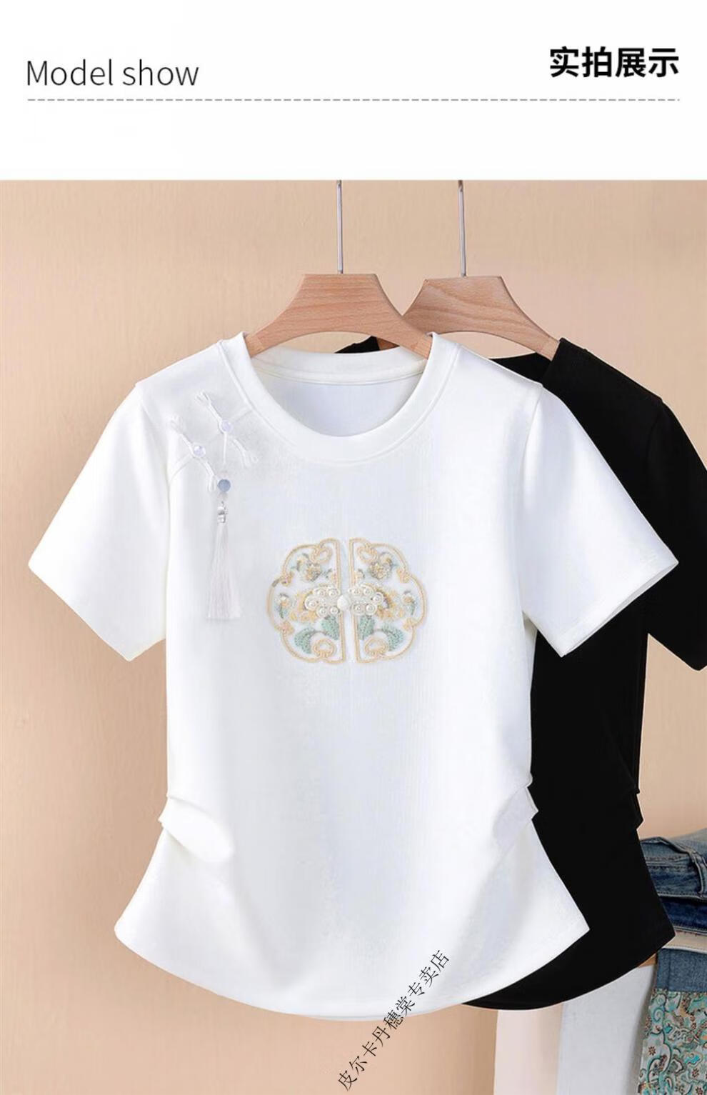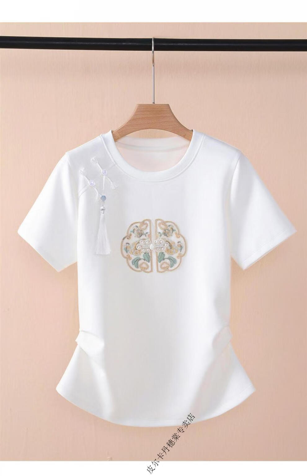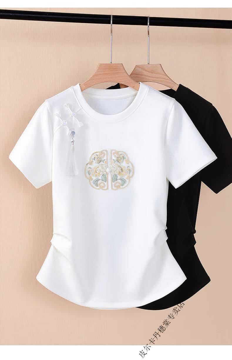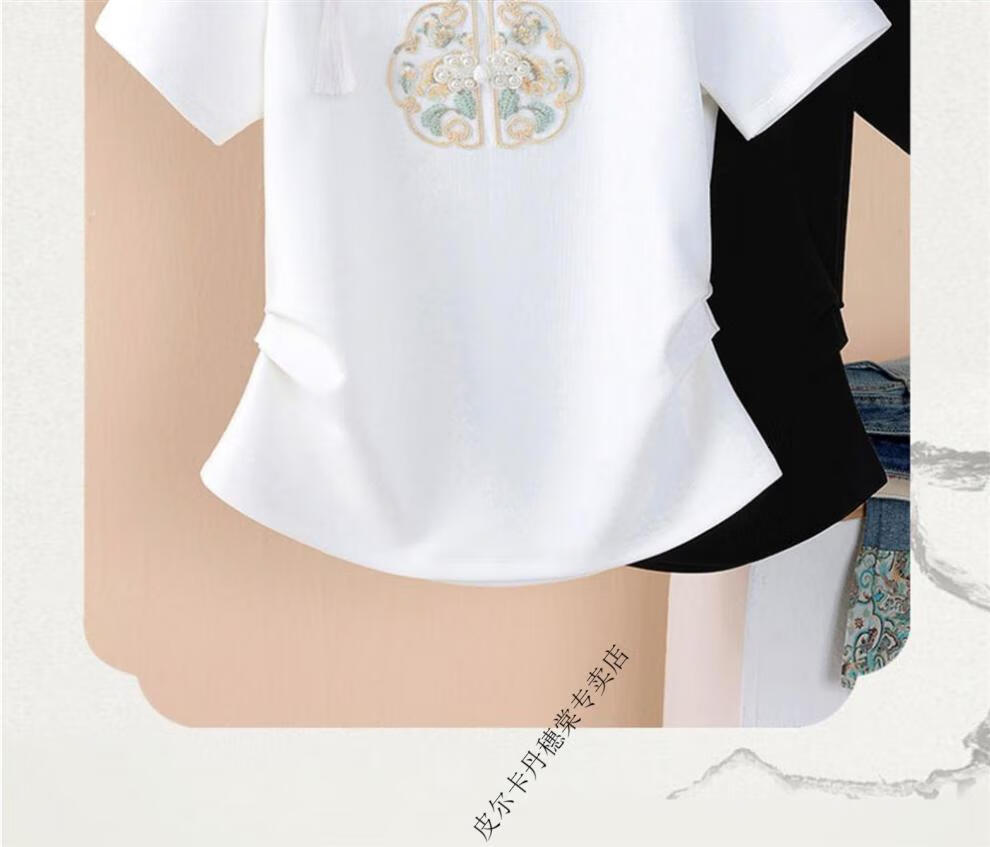 皮尔卡丹新中式国风短袖t恤女白色夏季2025新款复古刺绣短袖收腰上衣盘扣 白色 2XL 125-140斤