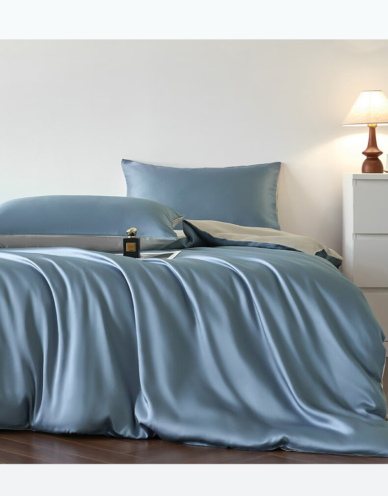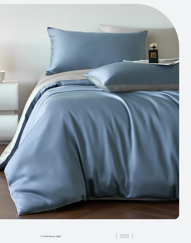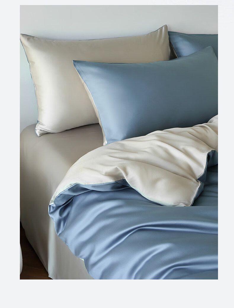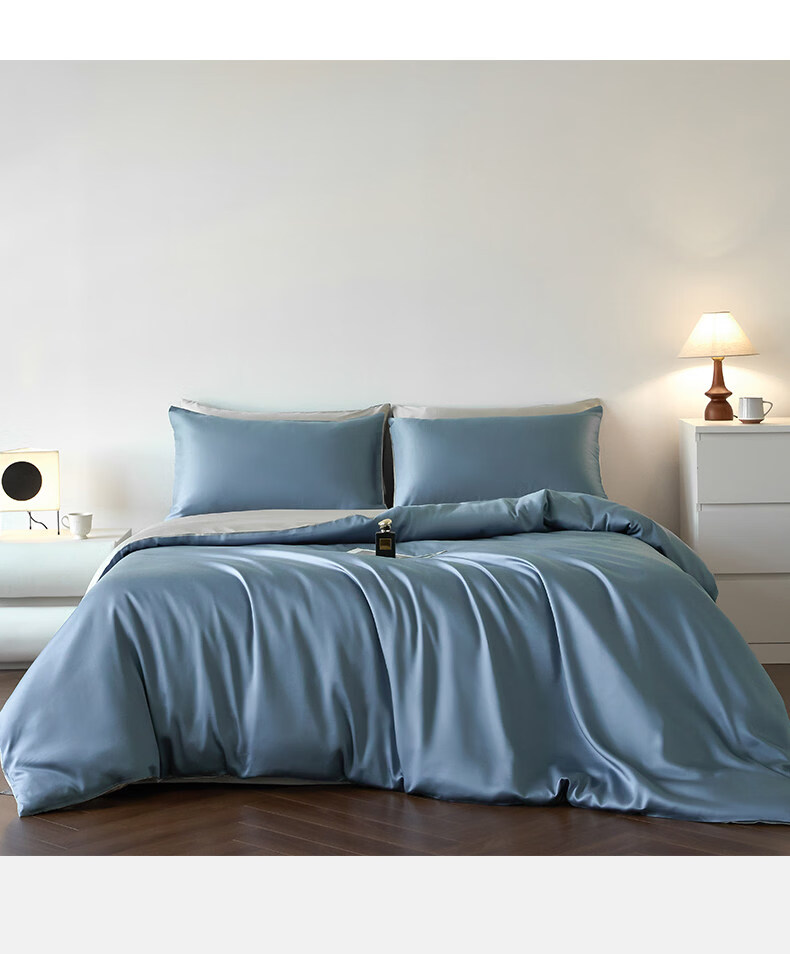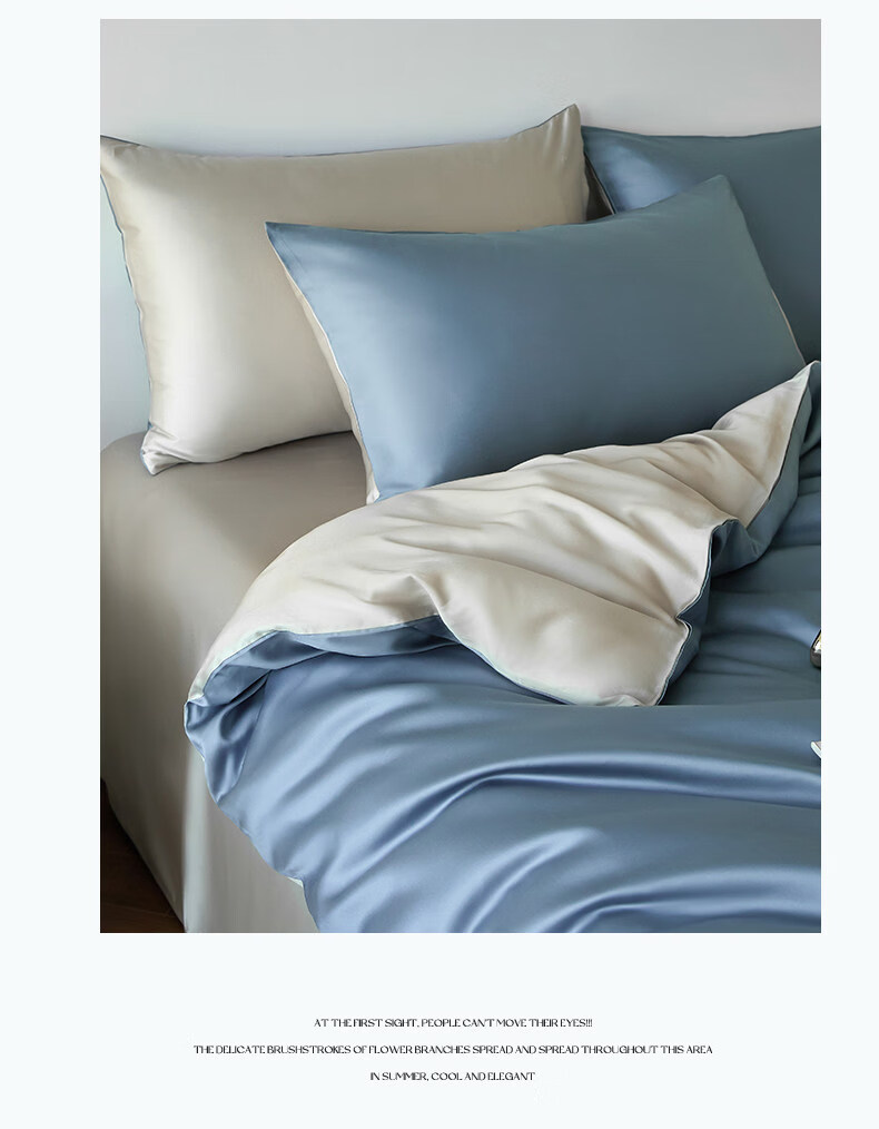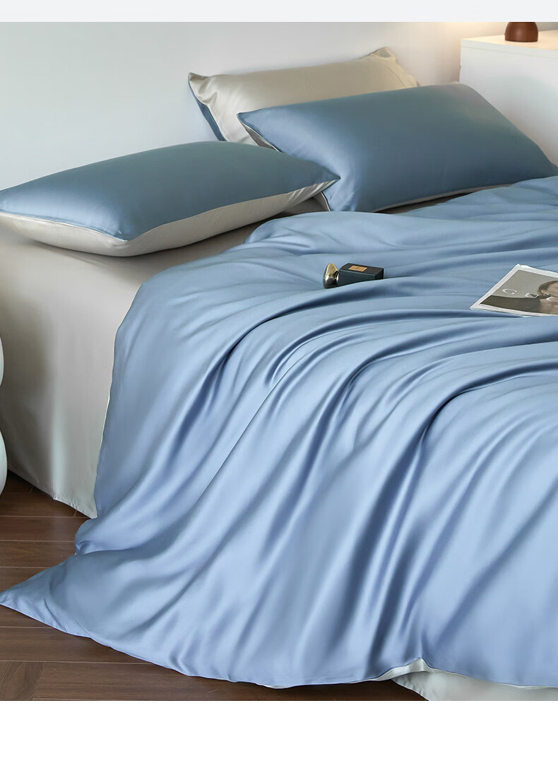 猫人(MiiOW)冰丝四件套夏季床上用品凉感床单被套罩夏天丝滑裸睡床笠款三件套 宾利蓝+冰川灰【凉感冰丝/适合裸睡】 1.8m 床单款 四件套-被套200x230cm