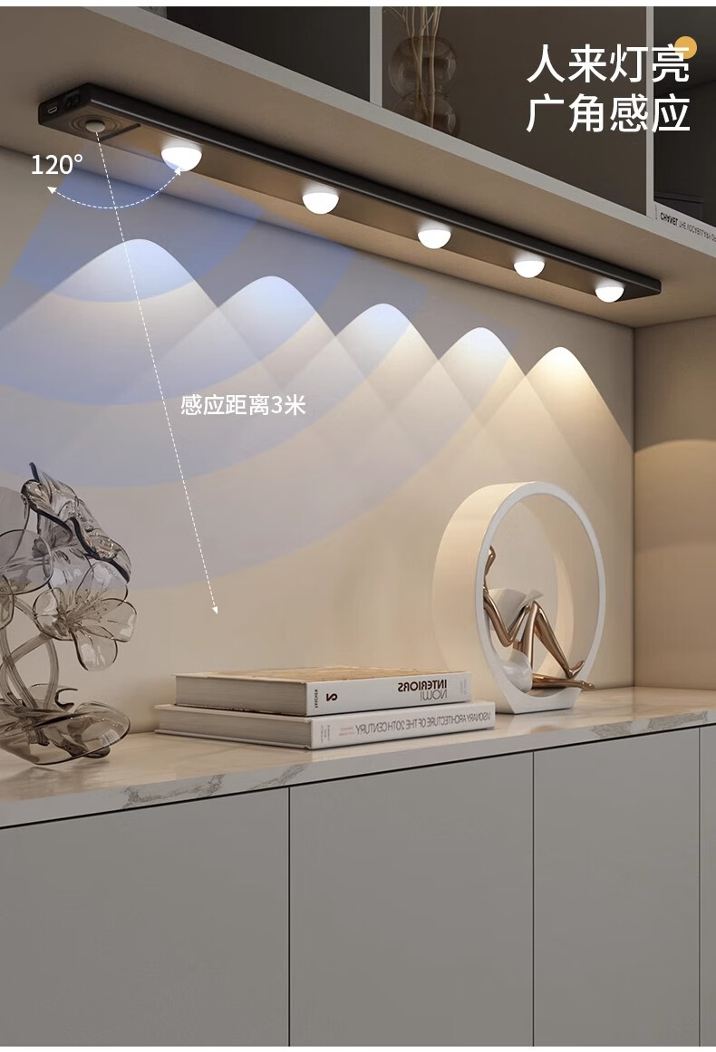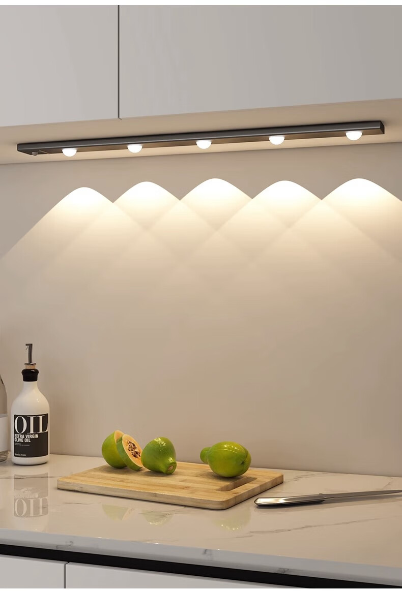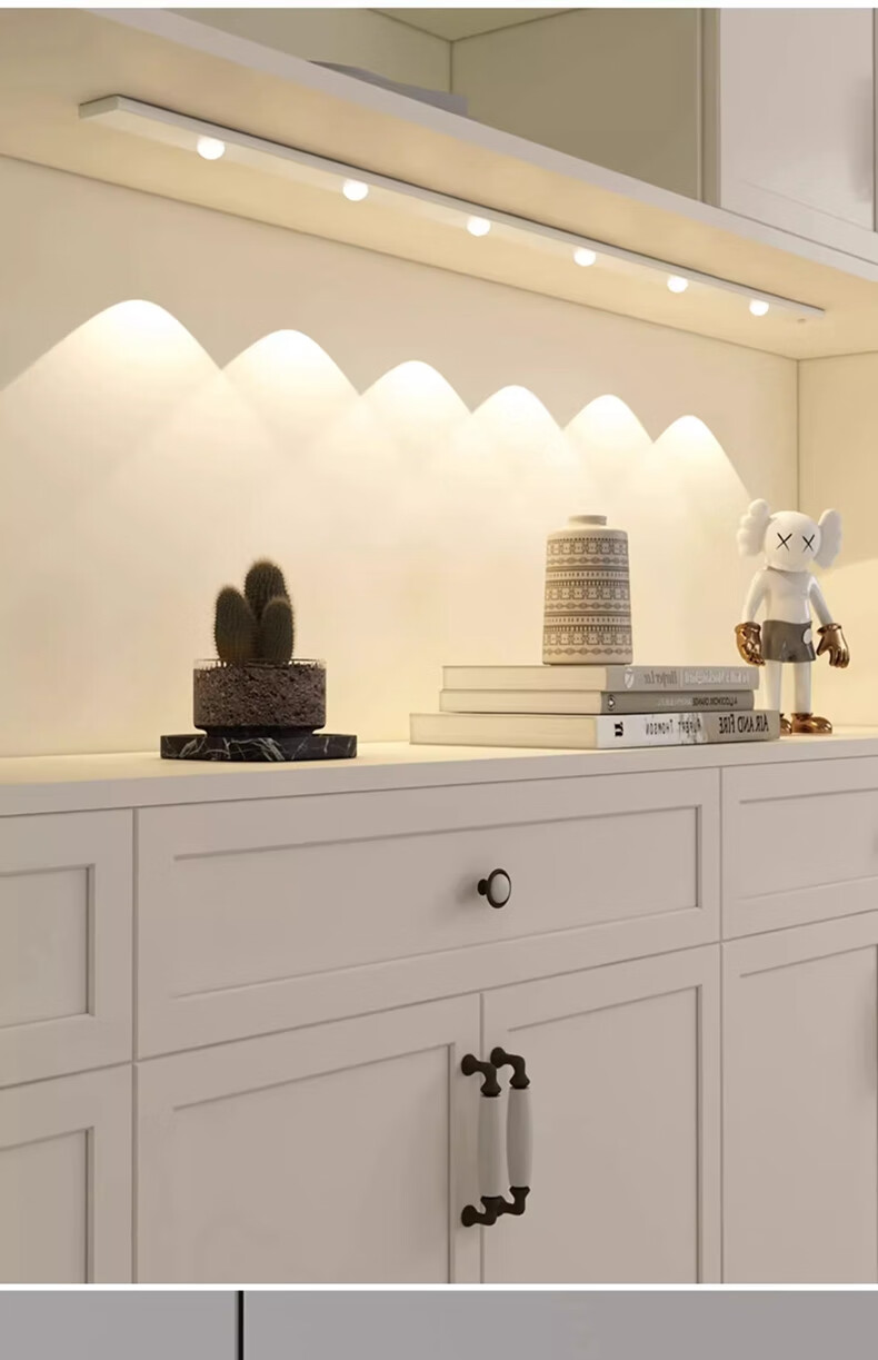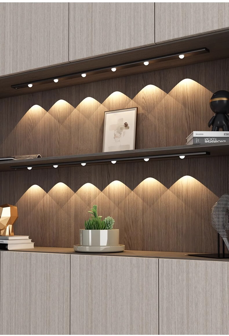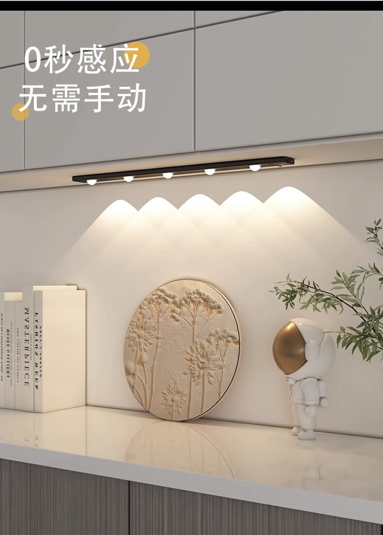 拉伯塔酒柜LED橱柜灯带充电人体感应灯无线衣柜猫眼灯鞋柜自粘磁吸灯条 5珠5波纹【80cm白壳】 【三色变光+双感应+可调光】